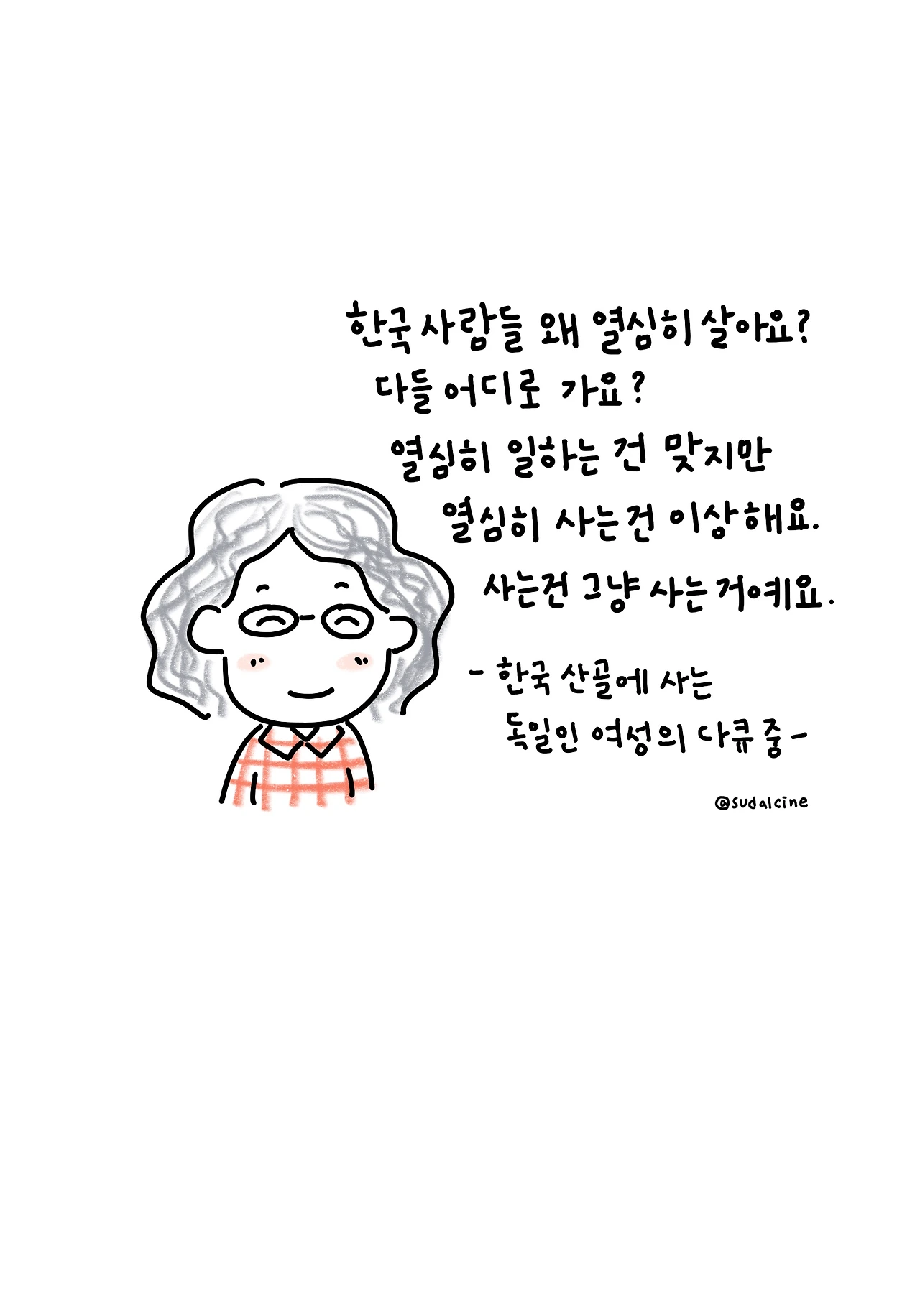“한국인들 너무 열심히 살아요. 왜 열심히 살아요? 그래서 어디로 가요?” 그는 이어 “일은 열심히 하는 게 맞아요. 하지만 열심히 사는 건 이상해요. 사는 건 그냥 사는 거예요.”라고 말했다. 남편과 나는 한 대 얻어맞은 것처럼 머리가 띵하고 울렸다. 그렇지. 사는 건 그냥 사는 거지. 열심히 사는 건 이상하다.