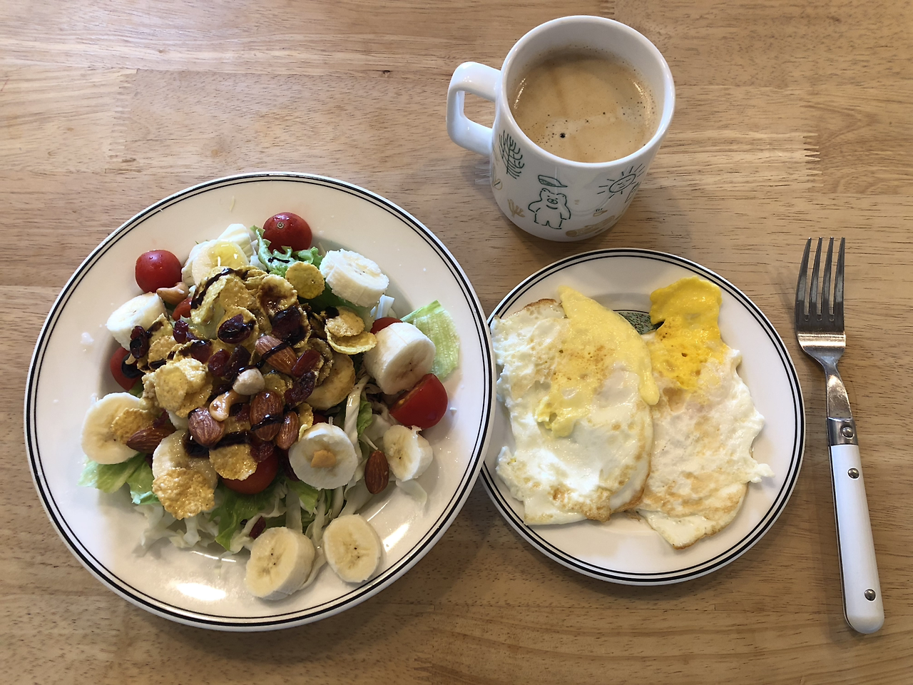 그 어느 정도의 분량을 해놓고, 메일을 보내고 점심 샐러드를 챙겨 먹는다. 거의 한 달째 점심마다 먹는 샐러드다. 드레싱도 매일 같은 올리브 오일, 발사믹 식초, 꿀. 채소는 유기농 모둠쌈채소나 양상추, 토마토와 바나나는 그때그때 있는 것으로 넣는다. 그래놀라 시리얼과 견과류를 조금 넣고, 단백질이 부족하지 않도록 계란 한두 개를 스크램블 해서 곁들인다. 기록 용으로 sns에 사진을 찍어 올린다. 요즘 나의 피드는 온통 샐러드 사진뿐이다.