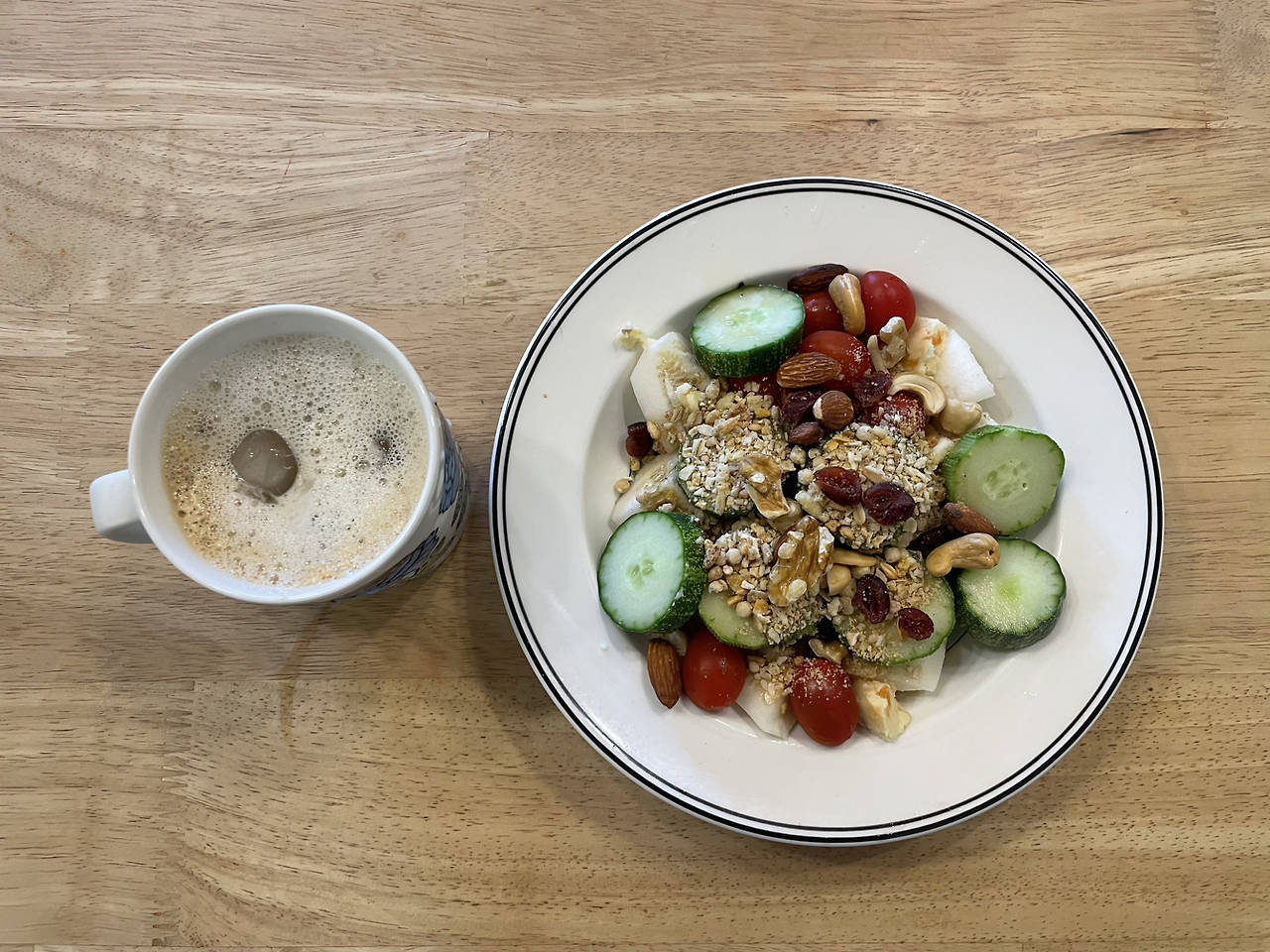아침식사는 건너뛰거나 사과 반 개를 커피와 함께 먹는다. (나름 간헐적 단식을 한다고 아침을 먹지 않고 커피 한 잔으로 때운 세월이 꽤 오래됐는데 빈속에 커피를 먹는 것이 위를 상하게 할까 염려되기 시작했다. 그런데 소량의 아침식사는 오전 내내 배를 더 고프게 한다는 것을 알았다…!) 점심은 가능한 한 샐러드다. 토마토, 과일 한 가지, 오이나 잎채소를 기본으로 해서 견과류, 당근, 시리얼 등 그때그때 기분에 따라 집에 있는 재료를 첨가해 올리브오일과 발사믹식초, 레몬즙을 뿌려 두유와 함께 먹는다. 전에는 꿀을 뿌리기도 했는데 단맛으로부터 멀어지기 위해 이제는 거의 넣지 않는다. 집에 치즈가 들어오는 경우 가끔 넣기도 하고, 단백질이 너무 부족하다 싶을 때에 우유나 계란을 먹기도 하기 때문에 100% 비건이 되지 못한다. 그래도 최대한 동물성 식재료를 사용하지 않으려고 노력 중이다. 세상에 수많은 종류의 드레싱이 있지만 마요네즈나 요거트를 이용하고 단 성분도 많이 들어가기 때문에, 올리브오일 위주의 드레싱을 만들어 먹는다. 외출을 할 때에는 가급적 샐러드 도시락을 만들어 들고 나간다. 비건 지향인이 되기 전에도 샐러드를 자주 만들어 먹었지만 지금의 방식이 재료도 단순하고 만들기도 쉬워서 훨씬 수월하다. 냉장고 안도 이것저것 재료를 쓸 때보다 단출해졌다.