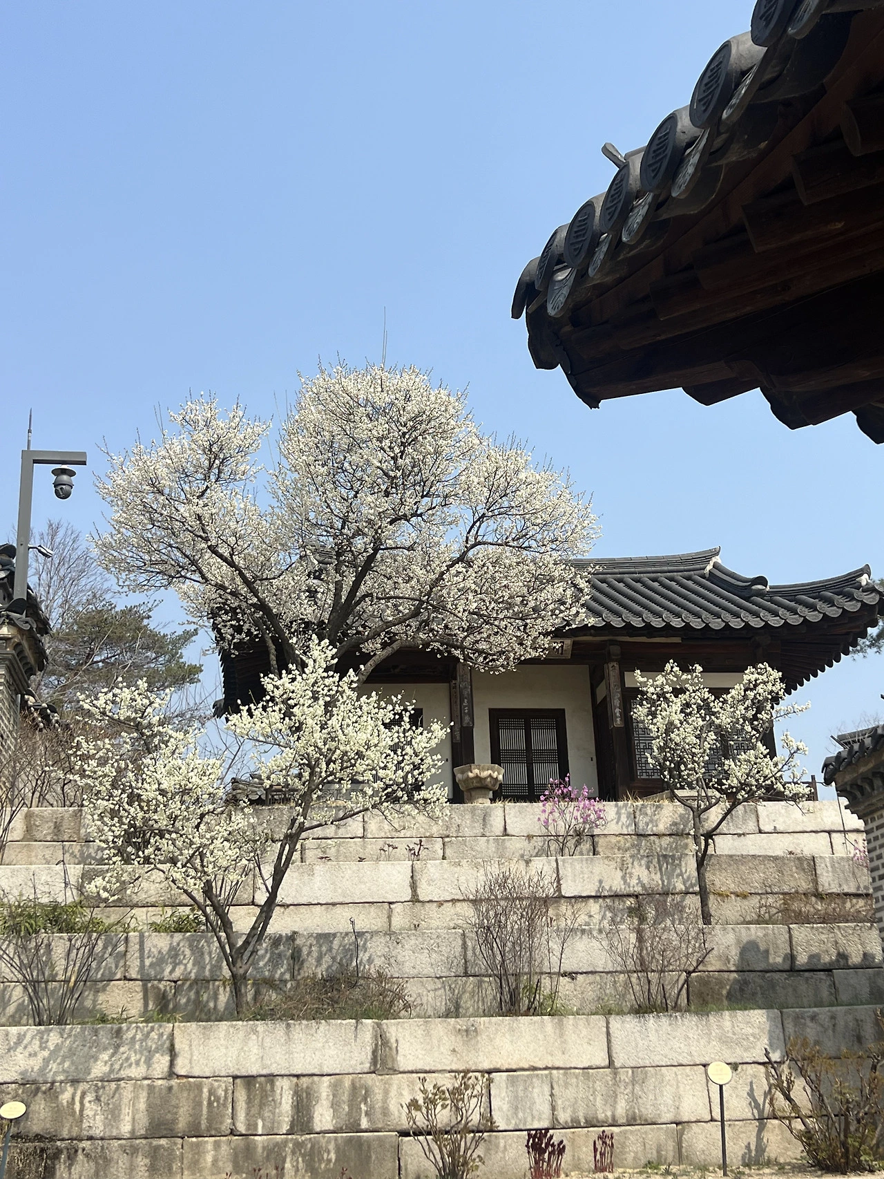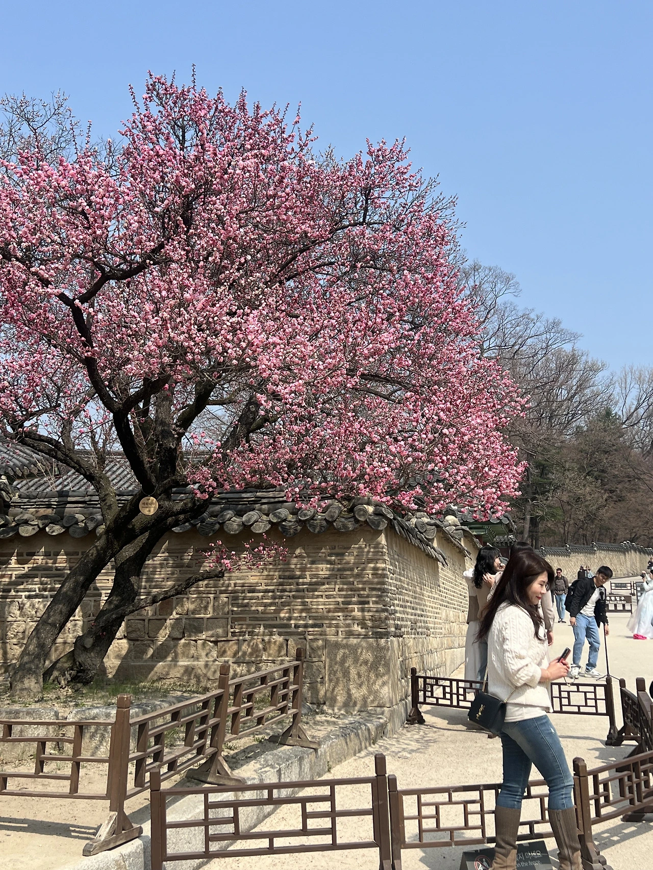 외국인들이 봄꽃만큼 화사한 색색의 한복을 입고 걸어 들어가는 길을 따라 궁 안뜰로 들어간다. 점점 사람이 많아지는 듯하더니 후원 입구에 다다르자 수많은 무리의 관람객들이 우글우글 모여있었다. 그곳에 만개한 홍매화 두 그루. 인터넷으로 본 유명한 홍매화 사진들은 전부 여기서 찍었던 모양이다. 어쨌든 봄꽃계의 아이돌, 창덕궁 홍매화를 드디어 영접했다. 사진을 좀 찍어보려는데 이번에는 대포 카메라보다 사람들이 문제였다. 삼삼오오 매화 아래에서 사진을 찍는 일행들 틈을 비집고 빈 곳을 노려 카메라를 들이대 보는데 쉽지가 않다. 어떻게든 사람이 없는 매화나무 사진을 오롯이 찍어보려 했지만 유명 관광지의 포토존이 된 듯 매화나무는 끊임없이 손님을 받고 있었다. 내가 졌다. 어느 순간 포기하고 사람이 함께 담긴 사진을 찍기 시작했다.