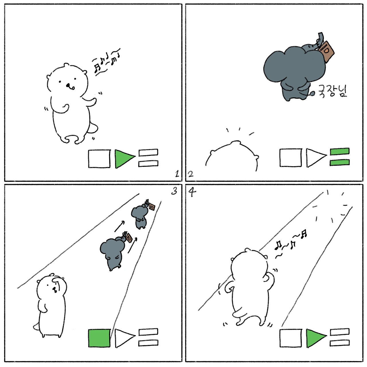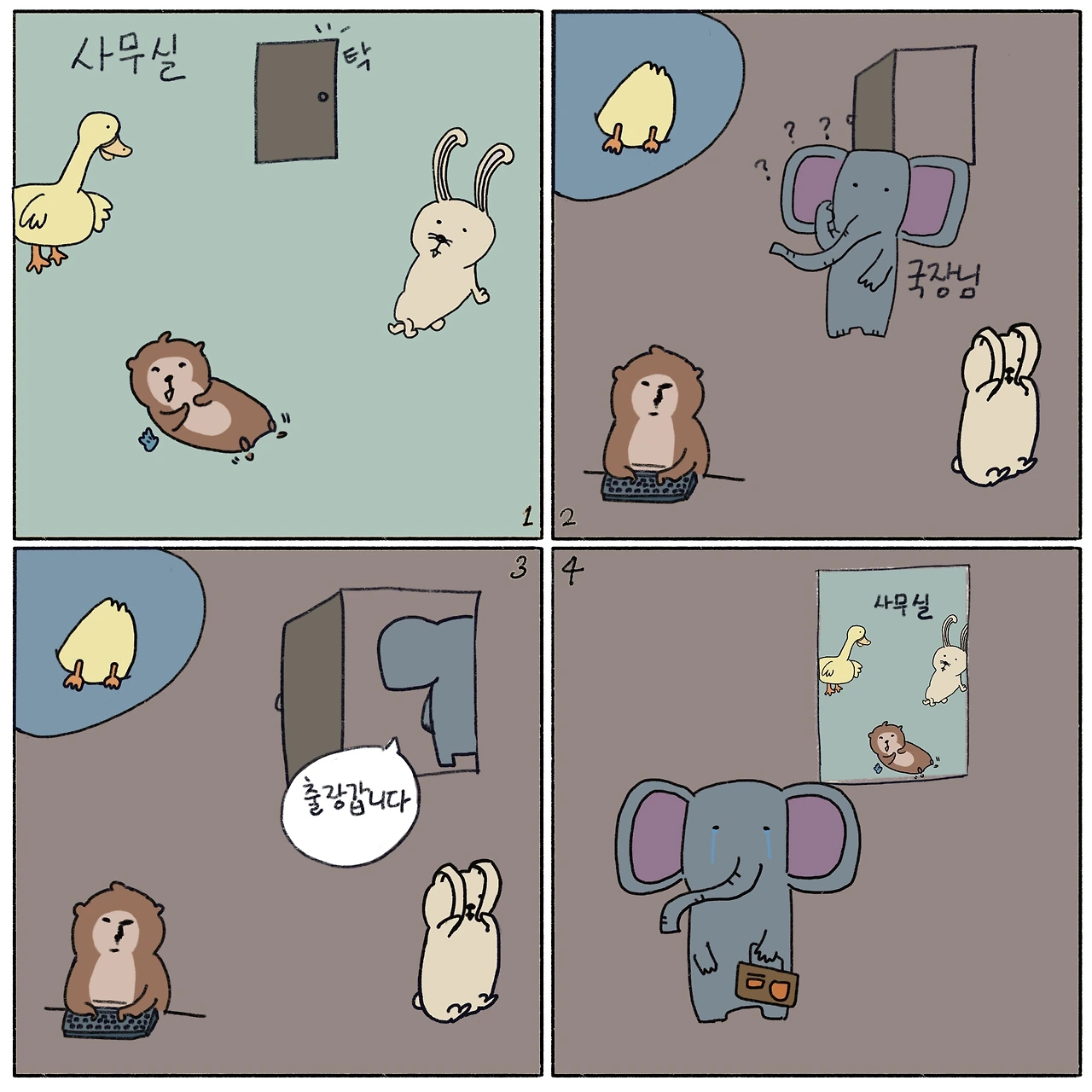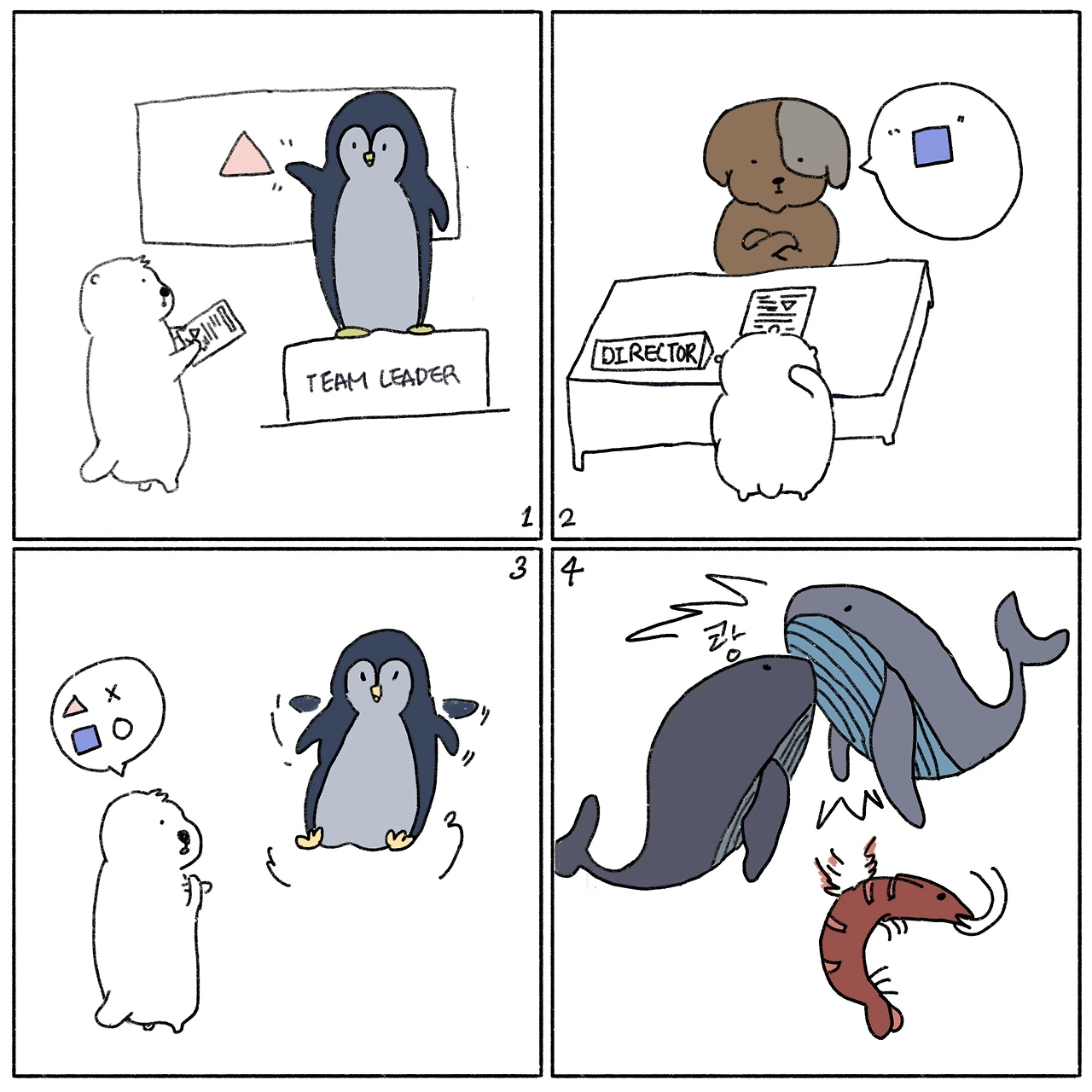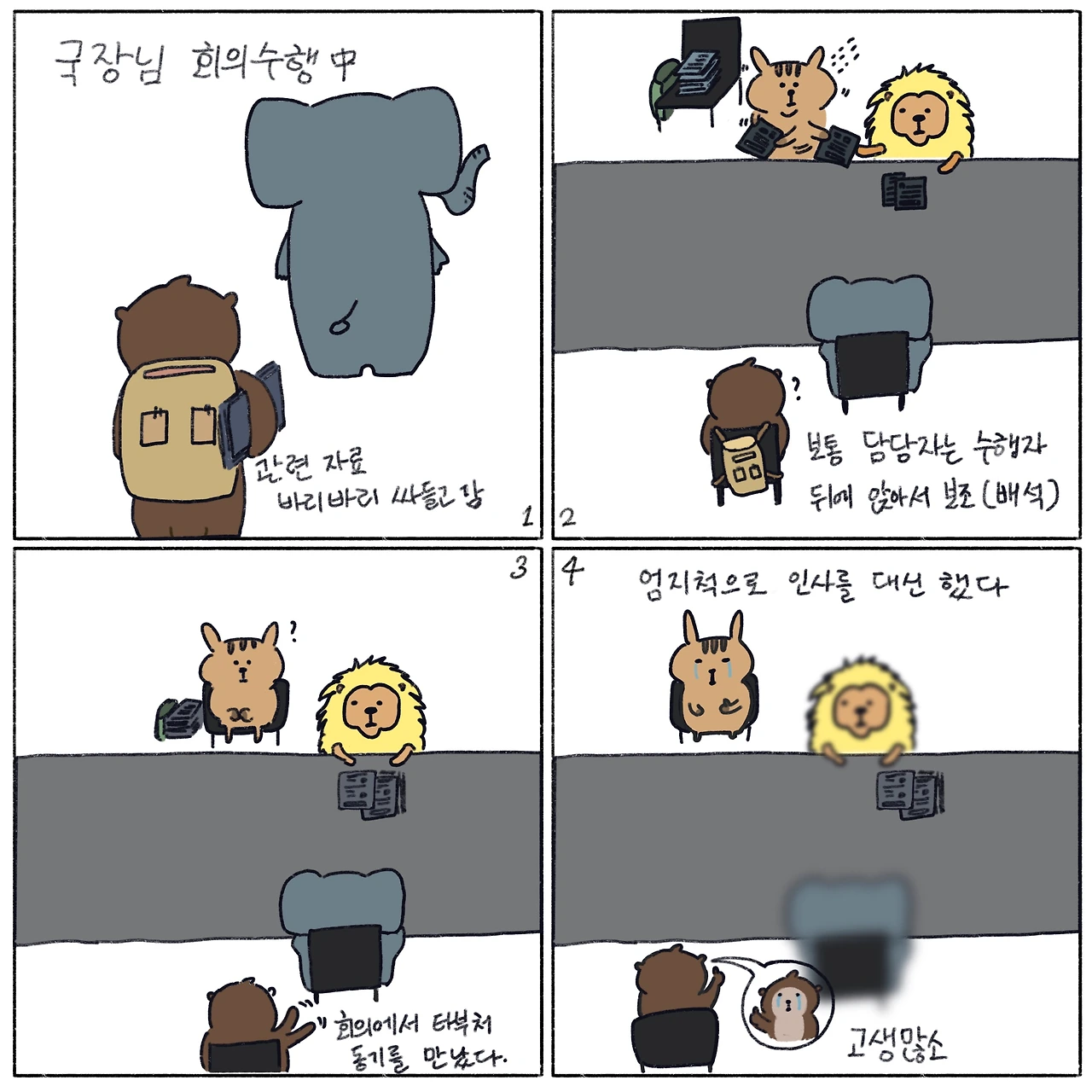 짬이 꽉 찬 팀장은 과장과 경력 차이가 크게 나지 않는다. 그래서 베테랑 팀장은 담당자가 파악 못하는 부분을 짚어주는 식으로 과장의 역할 일부를 수행한다. 그런데 팀장이 원하는 방향과 과장이 원하는 방향이 다른 경우가 왕왕 있다. 글로만 적었을 뿐인데도 벌써 미묘한 긴장감이 감돌지 않는가. 대부분은 결정권자인 과장이 원하는 방향으로 결정되지만 그 과정에서 수달같은 담당자는 눈치 아닌 눈치를 보게 된다.