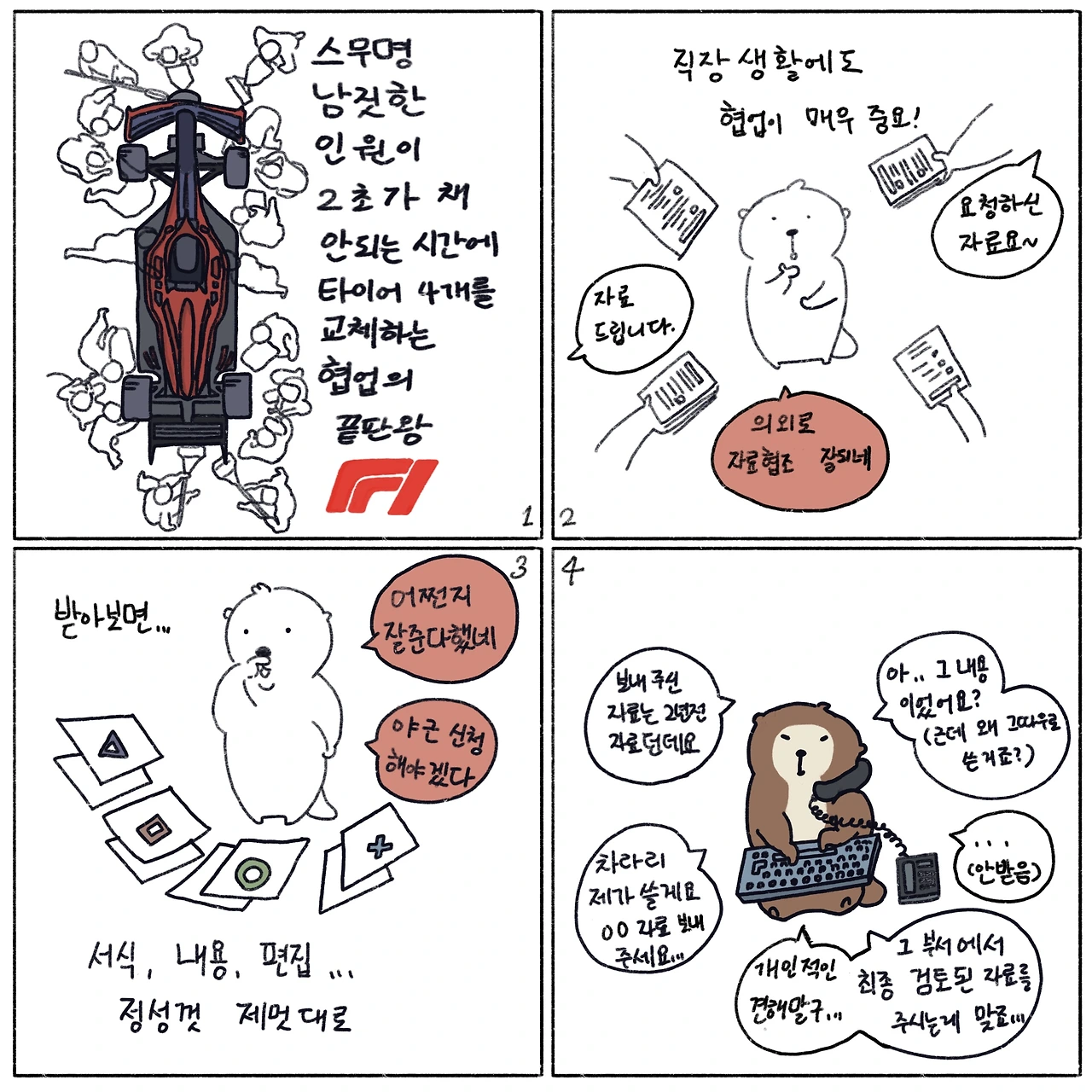 이러다 보니 어느샌가 회사 일은 내가 다 한다는 생각마저 들게 된 김수달. 타 부서 협조자료가 엉망이어도 푸념하지 않는다. '내가 쓰면 되지 뭐'. 자신감 가득하다. '차라리 raw data로 주세요'라고 한 뒤 보고서를 채워나가는 일도 익숙하다. 여러 조직에서 협조받은 문서로 최종 결과물을 만드는 총괄업무를 경험하면서 느낀 건 참 정성껏 제멋대로인 자료들이 들어온다는 것, 일부러 그러나 싶기도 했지만 사실 많은 담당자들이 다른 일도 많은데 자료 협조가 들어오니 기존에 작성해 놓은 자료를 그대로 복붙 하는 형태가 많다 보니 통일 서식도 맞추지 못하고 내용도 엇나간 것들이 많단 걸 알게 됐다.