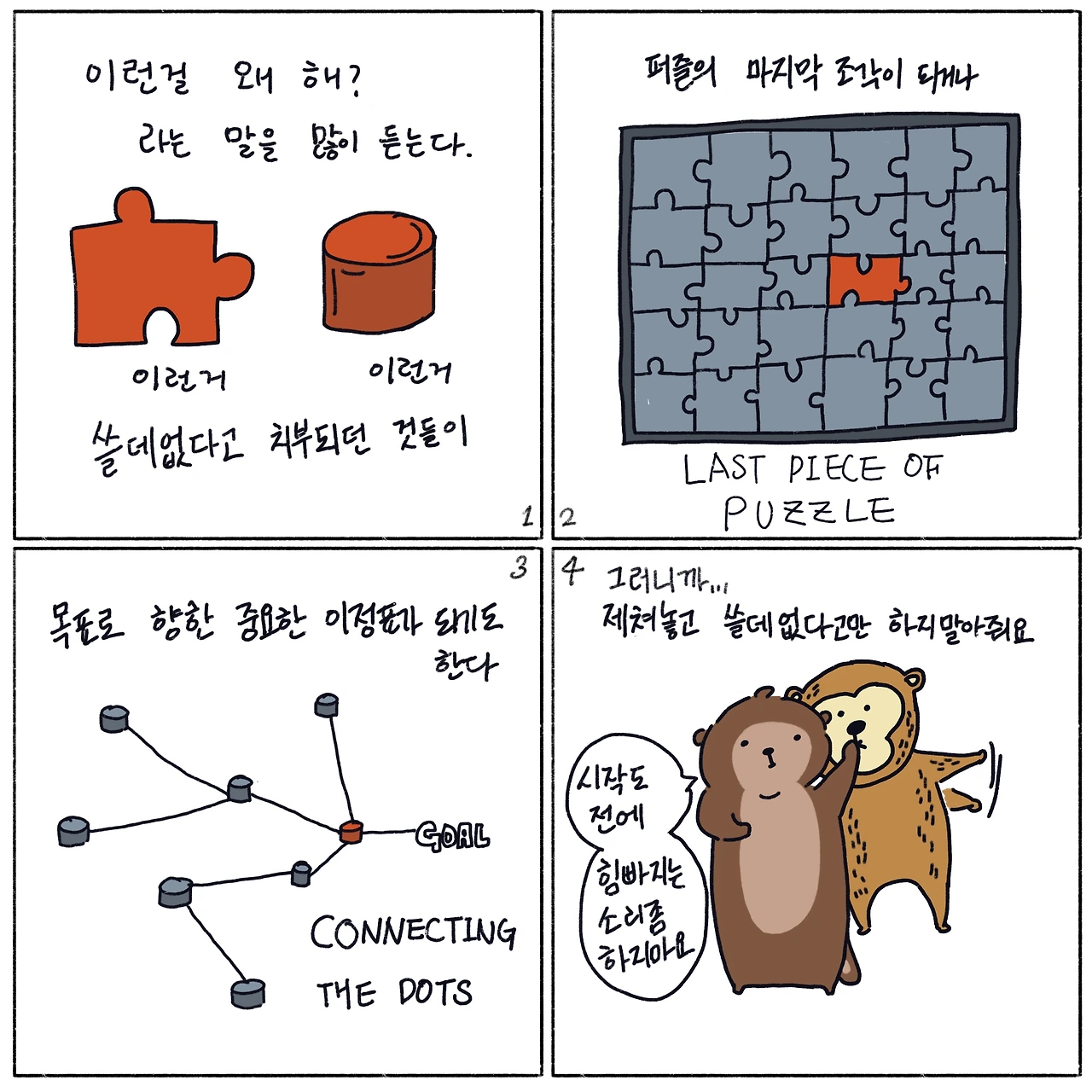'해오던 대로 해' 장벽을 넘어야 새로운 걸 담을 수 있다. 쓸데 없다고 치부된 것들이 제도개선의 실마리가 되거나 바람직한 목표를 이루는 중요한 '점'이 될 수 있다. 회의든 보고서든 진짜 문제를 해결하기위한 의지 없이 겉만 돌고 있다는 생각이 들때마다 쓸데 없다고 생각한 이야기들을 자신있게 던질 수 있는 사람이 되고 싶은 수달이다.