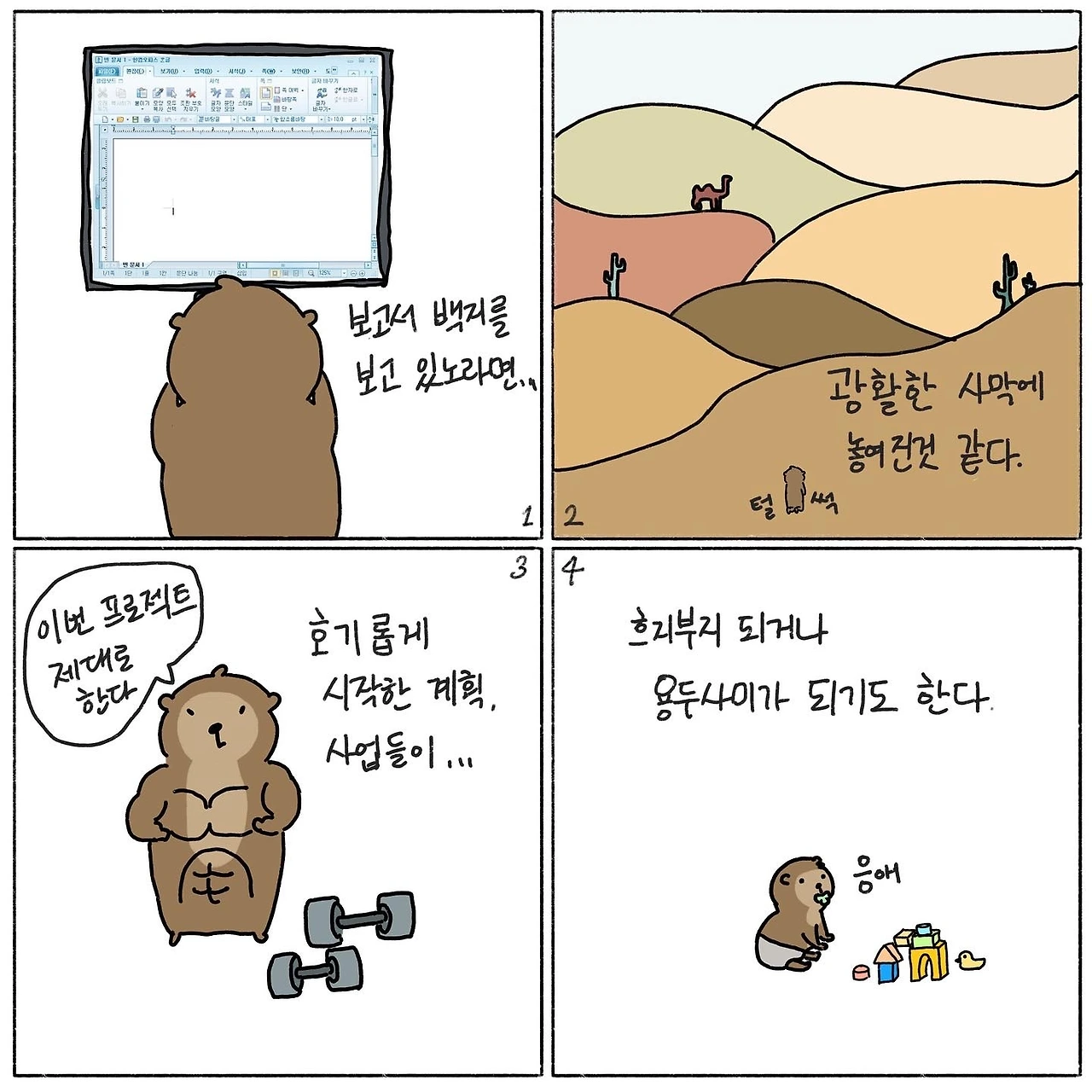 보고서로 채워야 할 백지를 보고 있노라면 긴 한숨부터 나오는 수달. 마치 광할한 사막에 놓인 것 마냥 막막한 기분이 든다. 한줄한줄 써 내려가기가 철근을 진 것같이 느껴질때도 있다. 그렇게 피땀어려 작성한 보고서가 휴지조각처럼 날아갈땐 철근보다 무거운 실망감이 짓누른다. 100점 짜리 보고서까지 바라지도 않는다. 여백 앞에 한숨쉬지 않으려면 어떻게 해야 될까. 수달의 생존전략은 다음과 같다.
