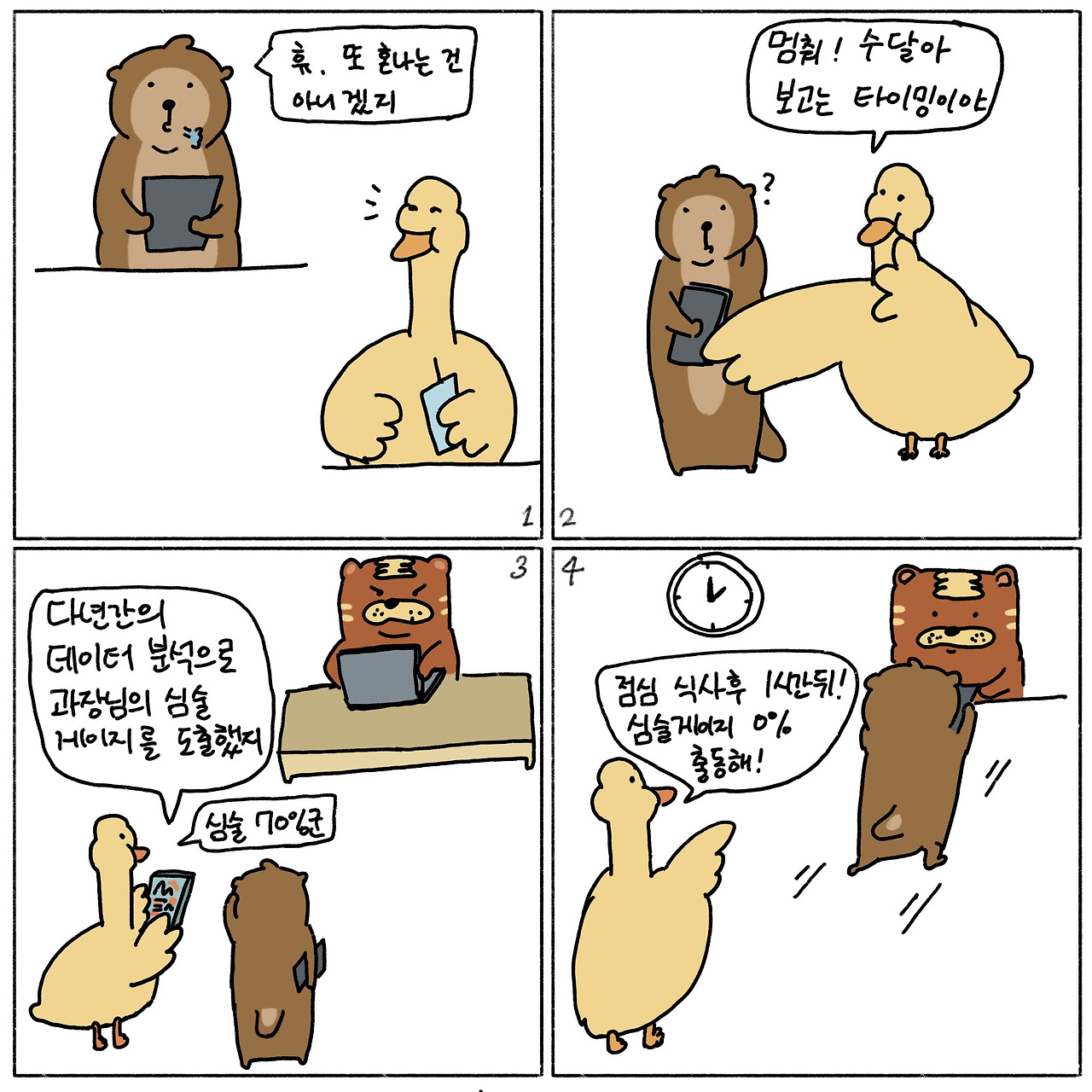 수달 경험에 빗대 보면 기한 정한 바 없는 보고서 작성 지시는 두 가지 경우로 나뉜다. 기한 둘 여유도 없이 급할 때 혹은 급하지도 중요하지도 않지만 필요는 하므로(더 정확히는 필요할 것 같아서) 담당자에게 지시해 놓을 때다. 후자는 특히 상관 본인도 까먹을까 봐 일단 담당자에게 말해놓는 식이 많다. 말 그대로 까먹어도 (당장은) 무방한 사안이란 것. '언제까지 할까요'라고 물으면 되는데 그러질 못했거나 '일단 작성', '되는대로' 등으로 애매한 답이 돌아올 때는 어떻게 해야 할까