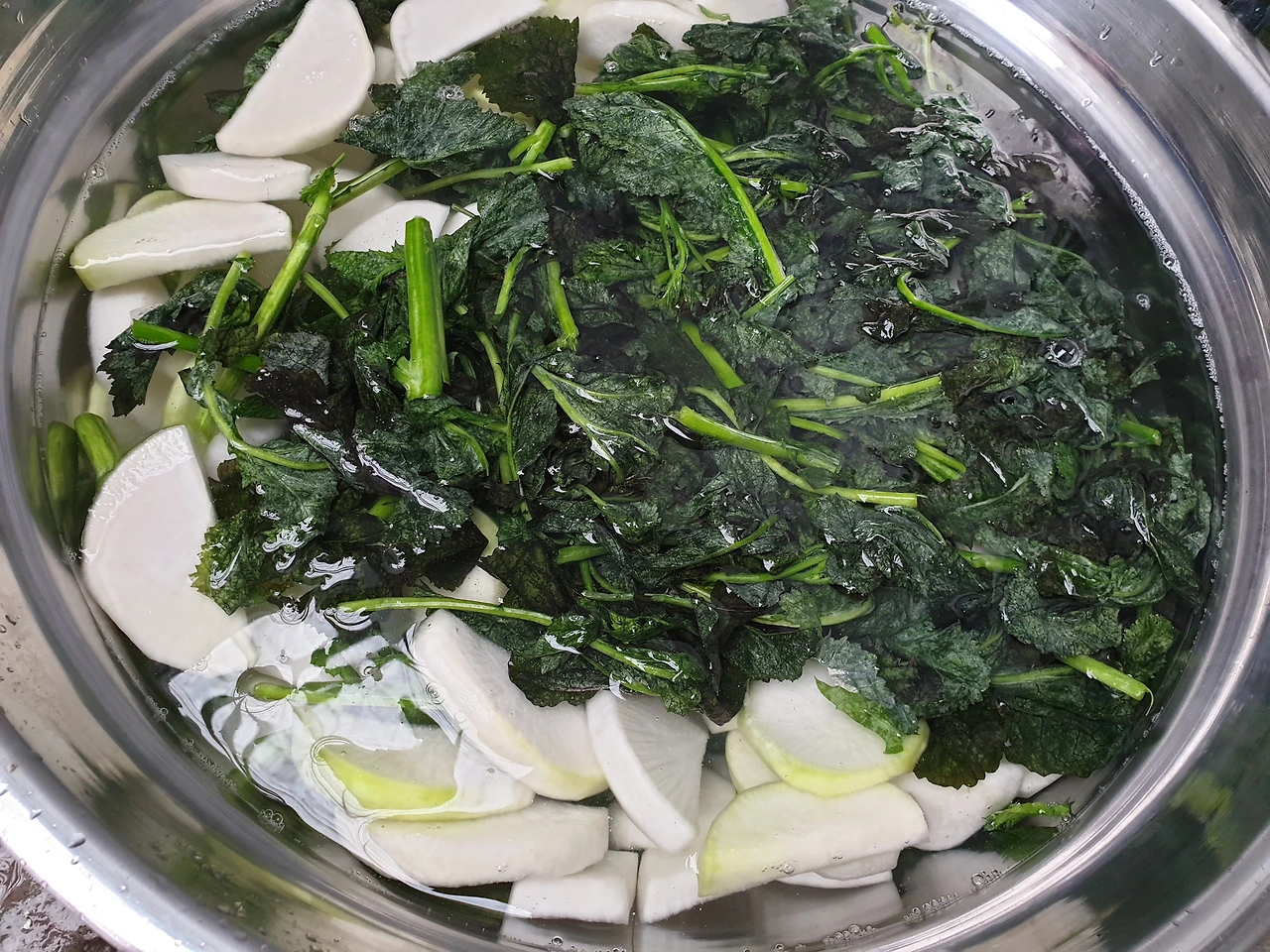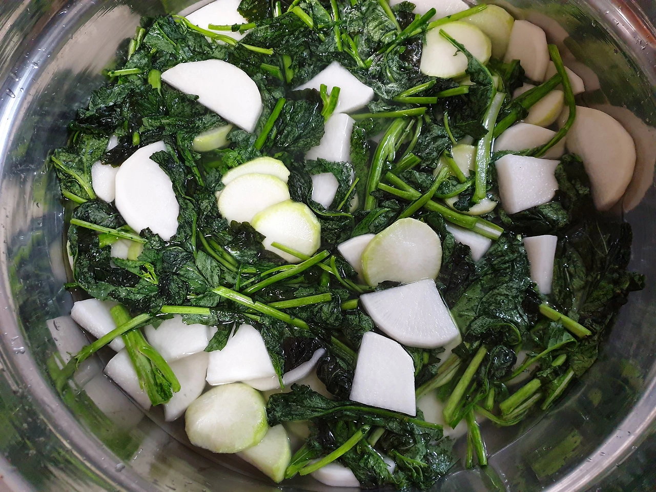 무는 1.5센티 정도로 썰어 2등분 하거나 4등분 하여 소금물에 절이고, 30분쯤 지나 무의 딱딱함이 줄어 야들야들해지면 갓을 넣고 30분 정도 더 절여준다.