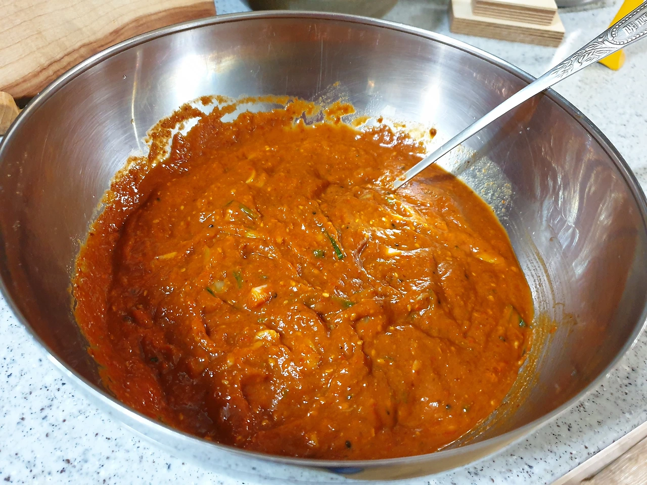 갓과 무를 절이는 동안 양념을 준비하는데 재료를 믹서기에 넣고 무조건 갈면 된다. 이때 마른 고추를 갈아 쓰면 더 맛이 있다. 마른 고추(10개 정도)를 물에 불려 축축하게 만들어 믹서기에 넣고(없으면 고춧가루로), 양파 1개, 마늘 7~8알 정도, 생강 조금(없으면 생략), 풀죽 대신 식은 밥을 넣고, 청양고추 3개 정도를 넣고 곱게 곱게 갈아준다.
