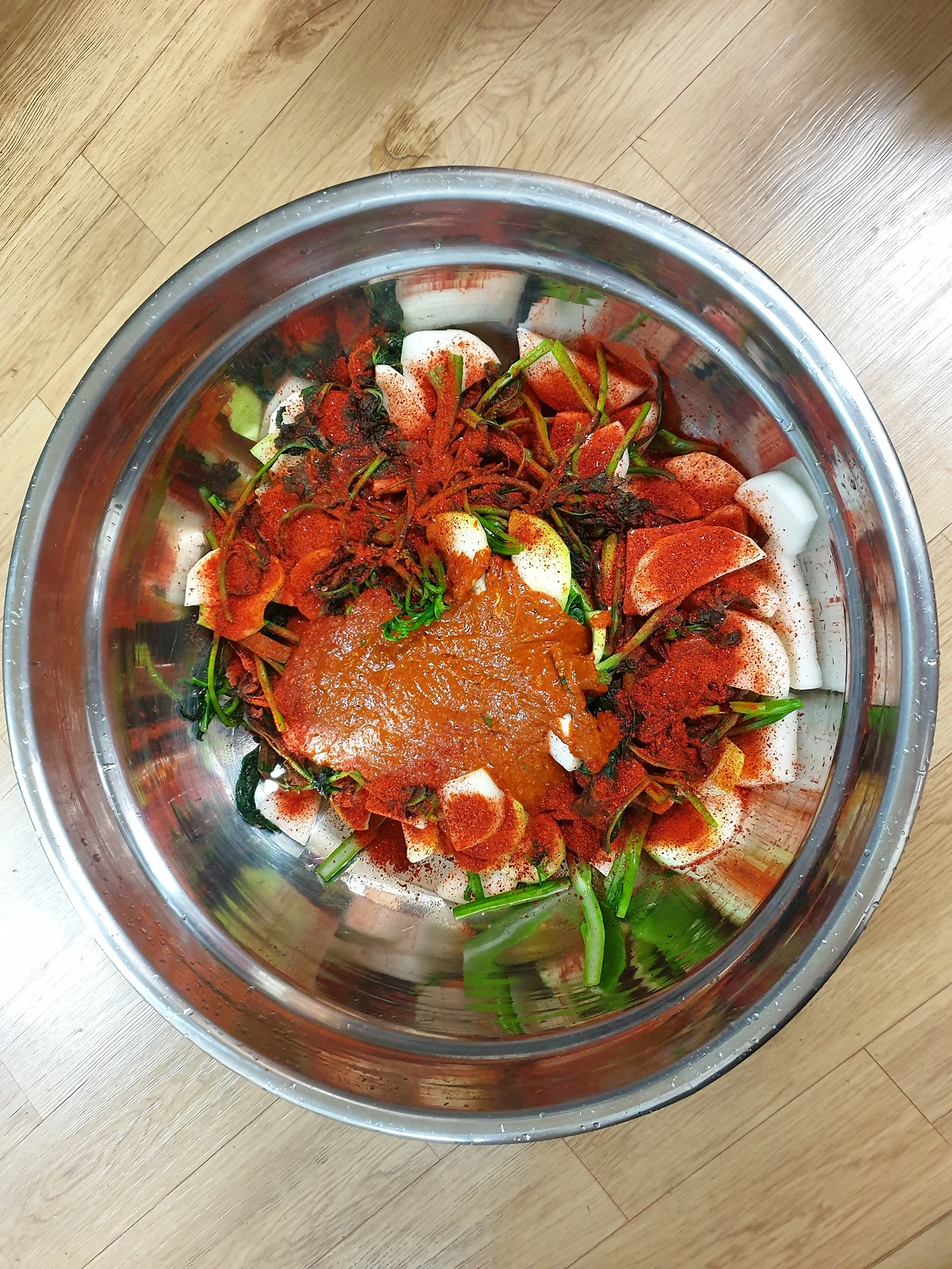 씻은 갓과 무에 양념을 넣고 색을 내기 위해 고춧가루를 더 넣은 후에 새우젓과 멸치액젓으로 간을 맞춘다.
