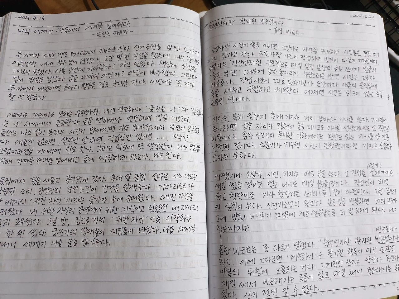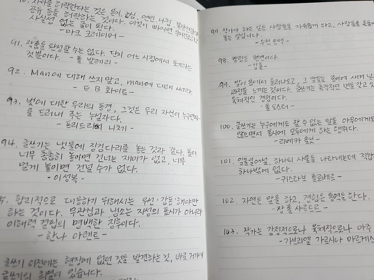 글쓰기에는 어떤 것도 운 좋게 찾아오지 않는다. 글쓰기는 어떠한 속임수도 허용하지 않는다. ......모든 문장은 기나긴 수련의 결과이다.