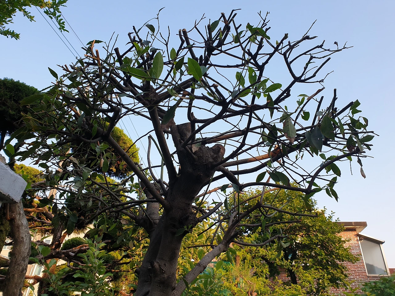 대문 앞 월계수 나무에도 문제가 있었다. 나무는 고개를 들기가 힘든지 자꾸만 옆으로 기울어져 갔다. 보는 사람까지 머리가 무거워졌다. 새순이 났는데도 잎이 말라가는 것이 이상해 눈을 부릅뜨니 여긴 깍지벌레가 하얀 점을 찍고 있었다. 잎이 무성해 바람이 통하지 않으니 벌레들도 살기 좋았나 보다. 역시나 과한 것에선 문제가 생긴다. 남편이 가지를 잘라 숨통을 열어주니 앙상한 뼈대가 숨을 쉰다. 저절로 그동안 고생했다는 말이 튀어나왔다. 무심하게 지나치기만 했던 게 미안했다. 전에는 툭툭 잘리는 가지를 보면 가슴이 덜컹했는데 이번만큼은 달랐다. 어떻게든 나무를 살려야 한다는 마음이 우선했나 보다.