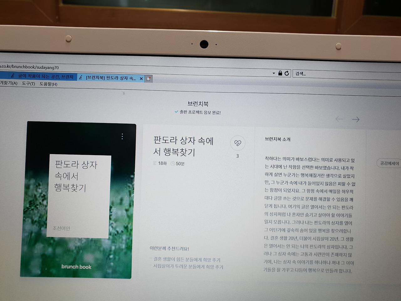 '판도라의 상자 속에서 행복찾기', 공모전에 출품한 내 브런치북의 이름이다. 시집살이를 하면서 느꼈던 희로애락을 표현하고 싶었는데 글 속에 드러난 내용은 조족지혈이다. 그런데 나는 도전의 마음이 일어남과 동시에 응모를 완료하는 우를 범하고 말았다.