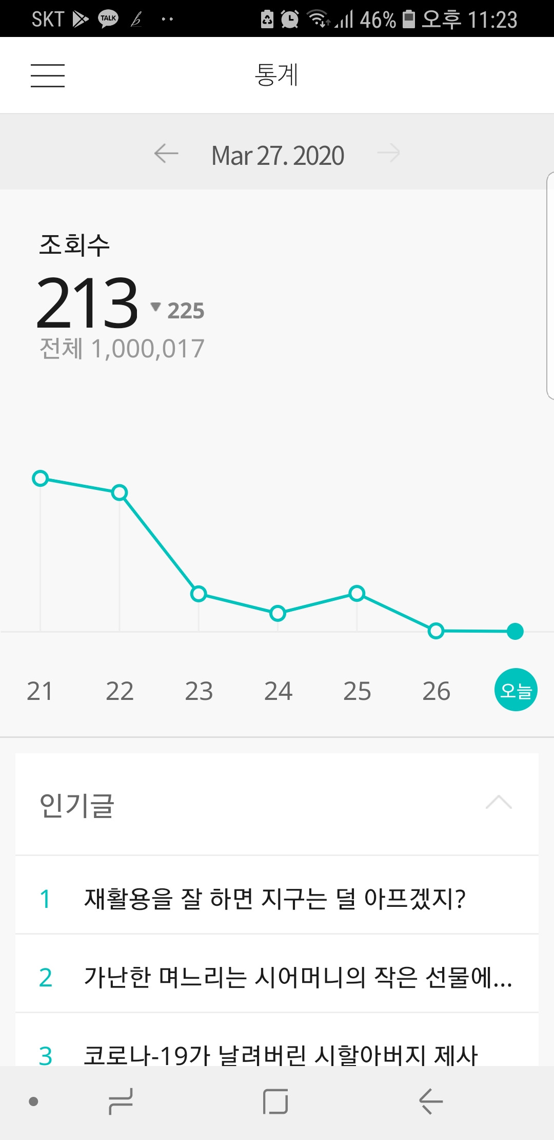 그러다 100만 조회수를 눈 앞에 둔 시기에 저는 저 숫자를 내 글쓰기의 터닝 포인트로 삼아야겠단 생각을 했습니다. 그리고 드디어 이런 공언의 글을 쓰게 되었습니다.