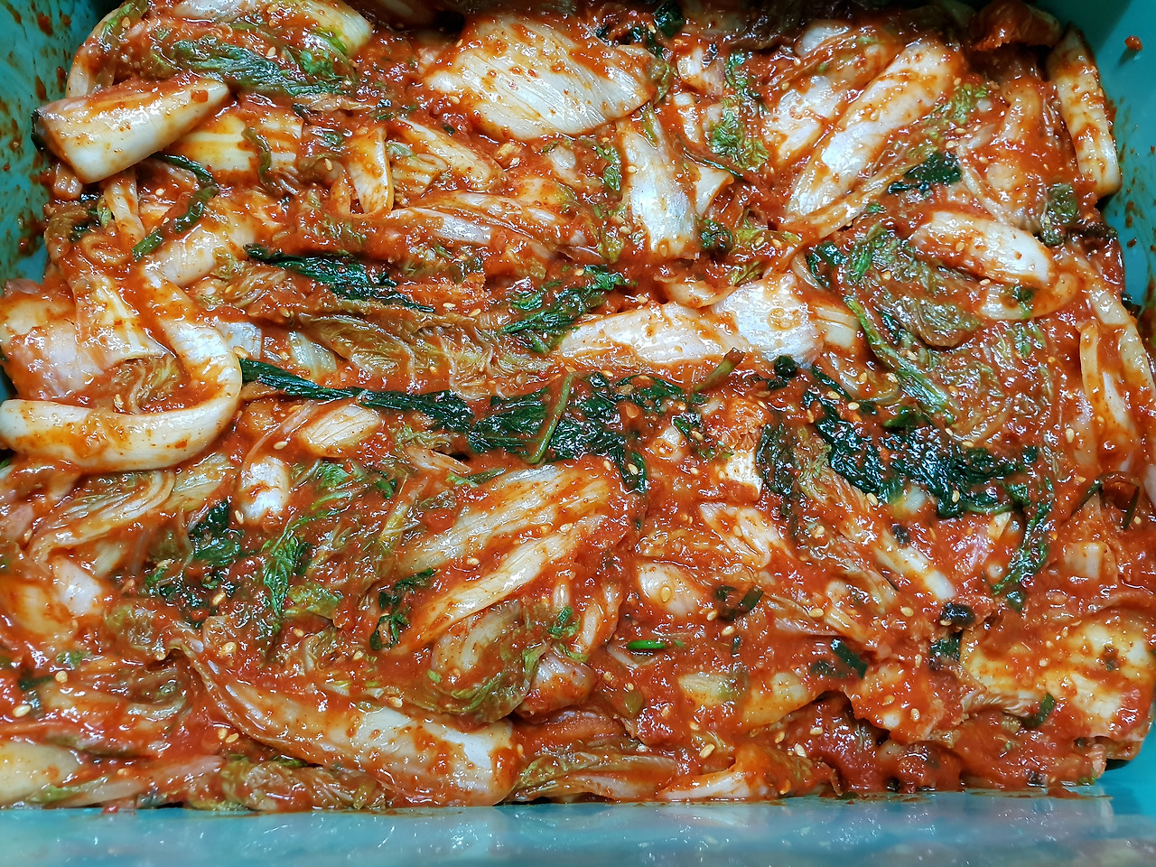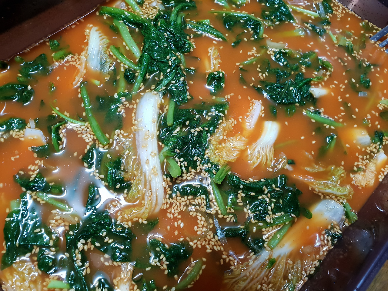절인 열무가 숨이 죽으면 씻어서 건져둔다. 씻을 때 열무의 간을 보고 양념 국물의 간을 조절하면 된다. 열무의 간이 너무 밍밍하면 국물의 간을 세게 하고, 열무의 간이 짜면 국물은 좀 싱겁게 하면 된다. 국물을 만들 때 모든 재료는 믹서기로 갈아 사용하면 편하다. 믹서기에 고춧가루, 양파, 밥, 배, 마늘 등의 재료를 넣고 물을 조금 넣으면 준비는 끝이다. 재료를 간다. 되도록이면 아주 곱게 곱게. 간 재료는 가는 채에 조금씩 넣어 물을 부어가며 걸려낸다. 국물이 깨끗하게 걸러지면 간을 맞춘다. 위에서 말한 것처럼 열무의 간을 보고 국물의 간을 조절하면 된다. 국물이 완성되면 씻어둔 열무를 넣고 섞으면 끝이다. 마무리는 통깨 솔솔.