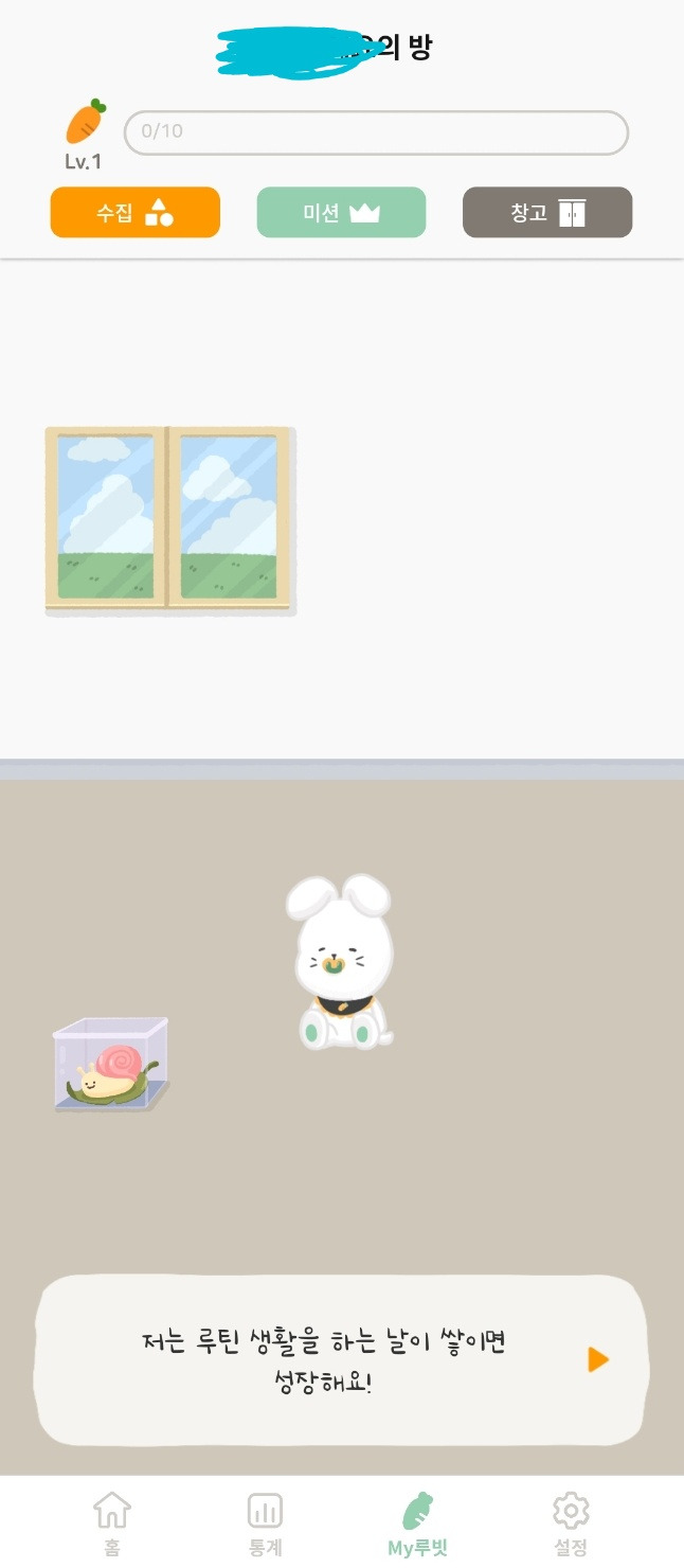 루빗의 컨셉은 '게임'이다. 습관을 만들기 위해선 보상이 필요하고 루빗은 '게임'이라는 방식을 채택한 것. 그래서 매일매일 미션을 수행하면 루빗이의 방을 꾸밀 수 있고 루빗이도 성장한다. 습관처럼 게임에 들어가 보상 아이템을 받는 걸 생각하면 나쁘지 않은 콘셉트라 생각한다. 귀여운 일러스트도 한 몫 한다.