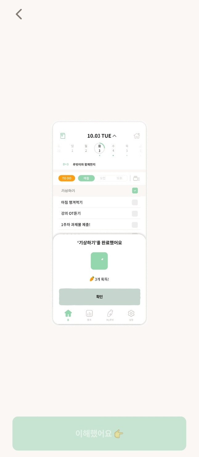 리스트를 입력하고 -> 활동하고 -> 체크하고 -> 당근(보상)을 받고 -> [My루빗]에 들어가고 -> 미션을 수행해야 한다.