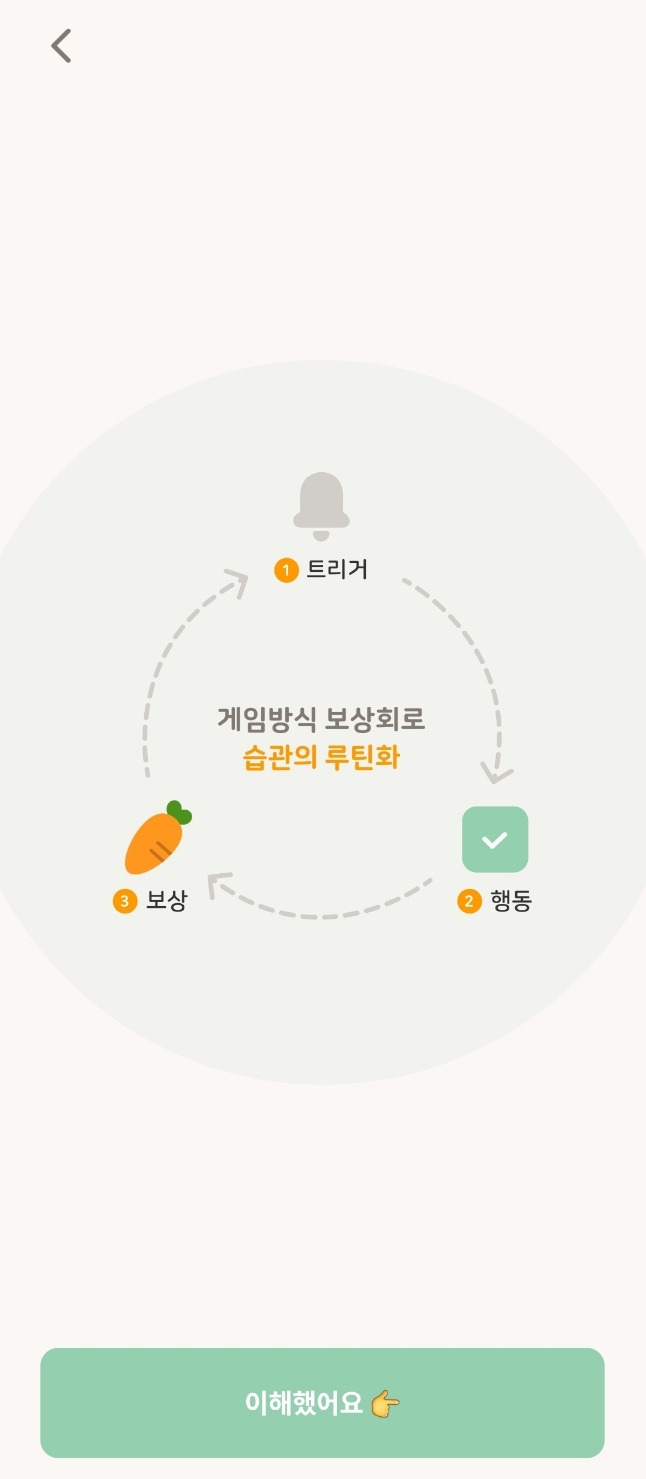 현재 루티너리는 [완료] 버튼을 누르면 다음으로 넘어가게 설계되어 있다. [완료] 버튼만 누르기 때문에 다음으로 넘어가는 느낌도 없고, 내가 무언가를 해냈다는 느낌도 다소 부족하다. 그리고 침대 위에서 대강 [완료]만 누르고 다시 돌아갈 수도 있다.