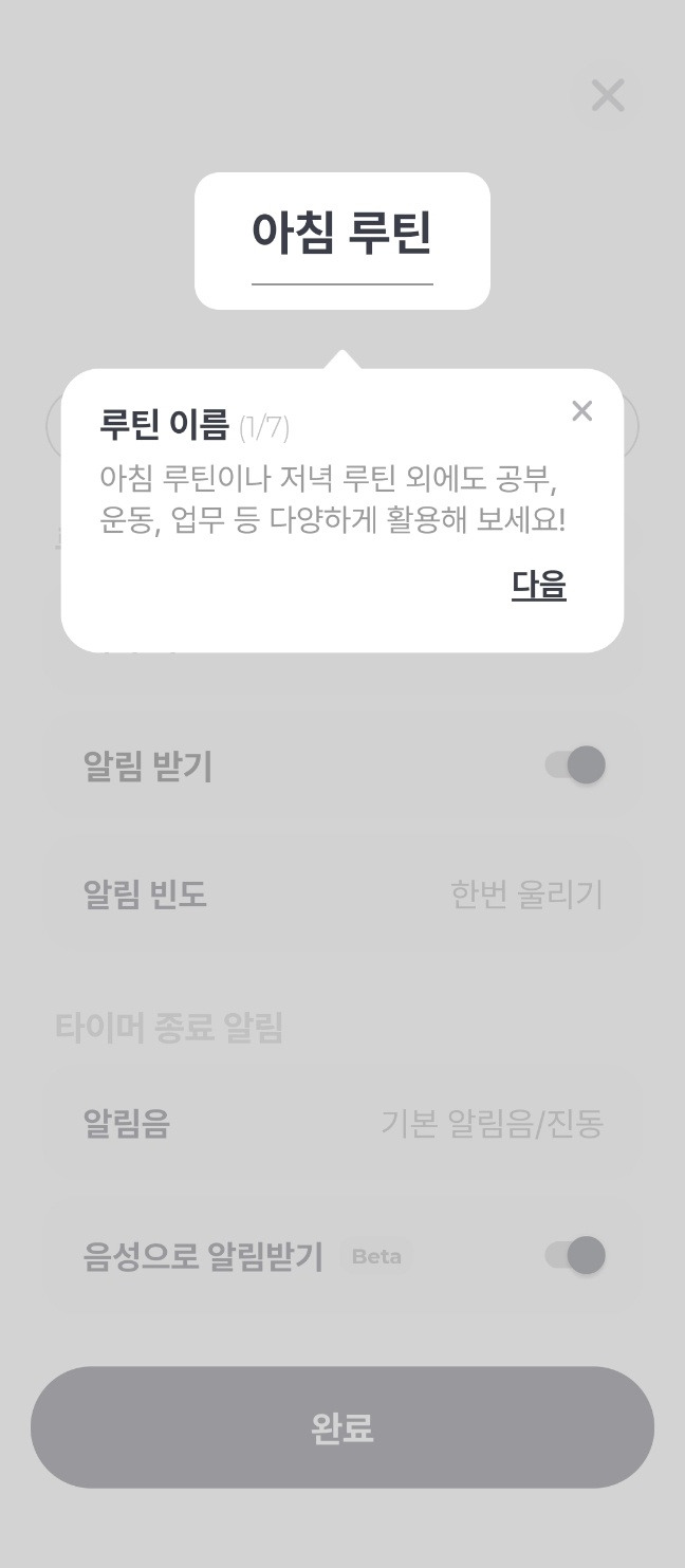 뭐가 됐든 유저가 가장 많이 쓸 '아침 루틴'을 튜토리얼을 통해 빠르게 형성해줌으로써 유저는 번거롭게 또 입력해야 하는 수고를 덜었다.