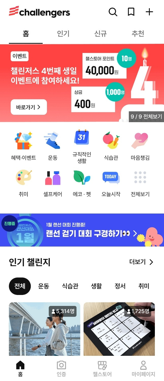 이 구역의 대표 주자. 챌린저스다. 일상생활을 건강하게 만드는 동기부여 앱이다보니 스플래시 화면은 어떤 구성일까, 온보딩은 어떻게 해서 사람들을 혹하게 만들까 궁금했는데 그런 거 없고 바로 메인 화면에 떨어진다.