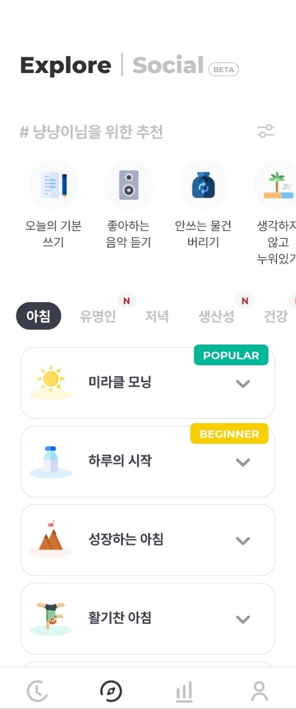 온보딩이 가장 마음에 들었던 앱. 유저가 이 앱을 다운로드 받은 목적을 파악하고 그에 맞는 루틴을 추천해준다. 다만, 홈에서 추천을 해주진 않기 때문에 탐색 페이지로 넘어가야 한다. 탐색 페이지를 가면 위에서 '루빗'의 문제점으로 꼽았던 '어떤 목록을 세워야 할지조차 모르겠어'라는 문제를 해결해준다. 추천하는 아침 루틴부터 유명인의 루틴까지 유저가 '루티너리'를 어떠한 사고 경로로 다운로드 받고 왜 이걸 이용하는지 명확하게 알고 있기 때문에 가능한 콘텐츠라 생각한다.
