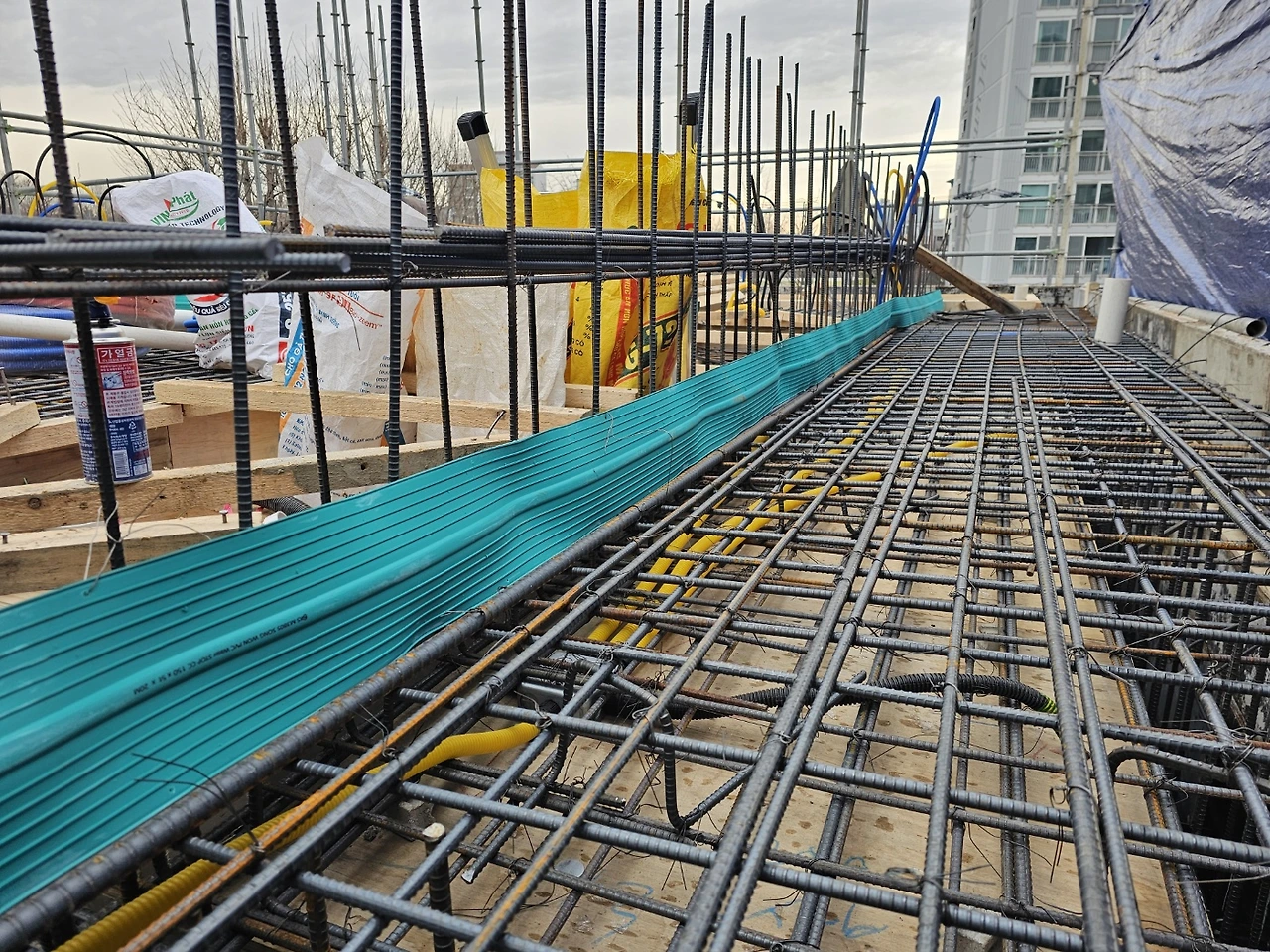 지수팽창제 : 한층 단위로 콘크리트 타설을 하므로, 층과 층은 엄밀히 하나로 이어져 있지 않다. 때문에 분리된 면이 만나는 지점이 방수에 취약하다. 지수팽창제는 PVC 소재로 습기와 만나 팽창하면서 틈은 막아 누수나 침수를 방지하는 역할을 한다. 지수(water stop)는 물을 막는다는 의미. 반영구적이나 소재의 특성상 저온이나 자외선에 노출될 경우 성능이 떨어질 수 있다고 한다.