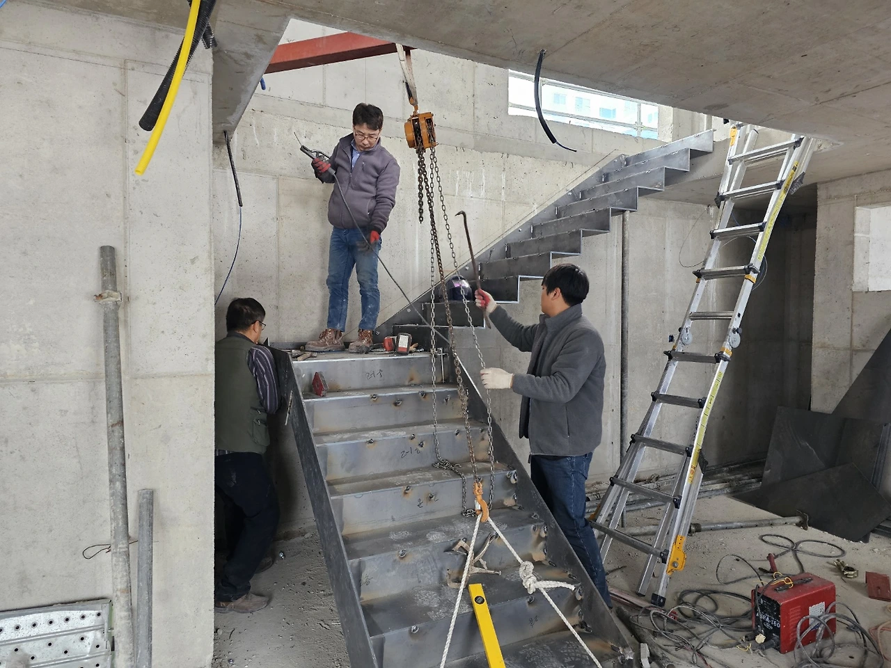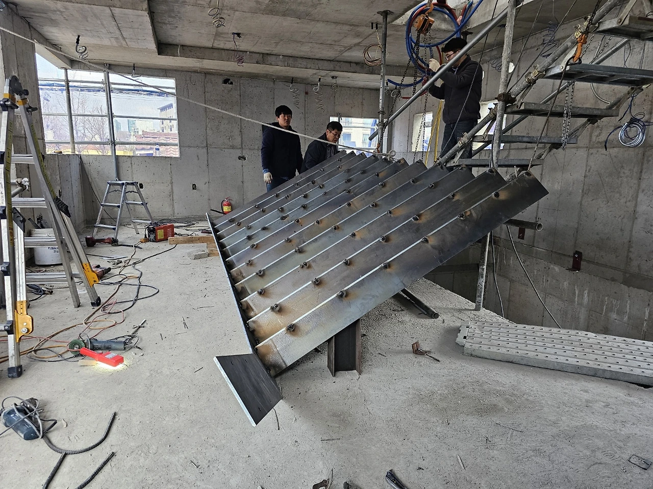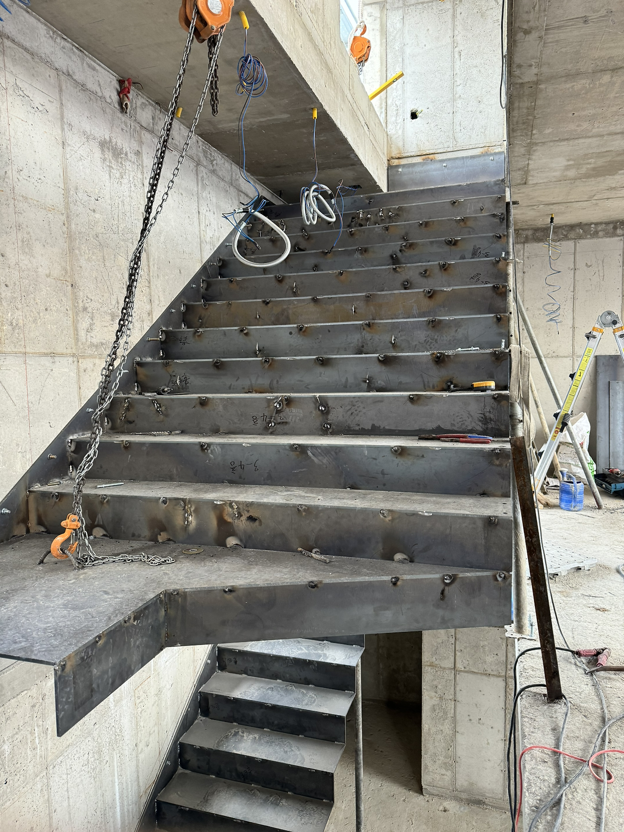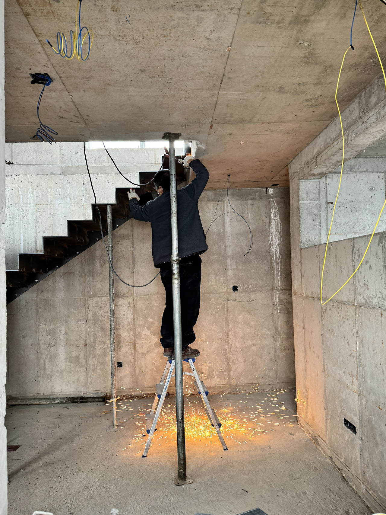 계단작업이 시작되었다. 골조가 완성되고 이제 실내공사를 하기 위해 가장 먼저 진행되는 작업이다. 일의 순서가 생기는 데는 다 이유가 있는 법, 작업자가 위아래 층을 자유롭게 드나들 수 있어야일이 수월해지기 때문이다. 샵드로잉으로 정교하게 그려진 작업도면을 토대로 레이저 커팅된 철판들이 도착하고 직접 현장에서 용접하여 이어 붙인다. 당연히 꽤 무거울 테고 그걸 벽에 붙이자면 생각처럼 그리 쉽지는 않아 보인다.