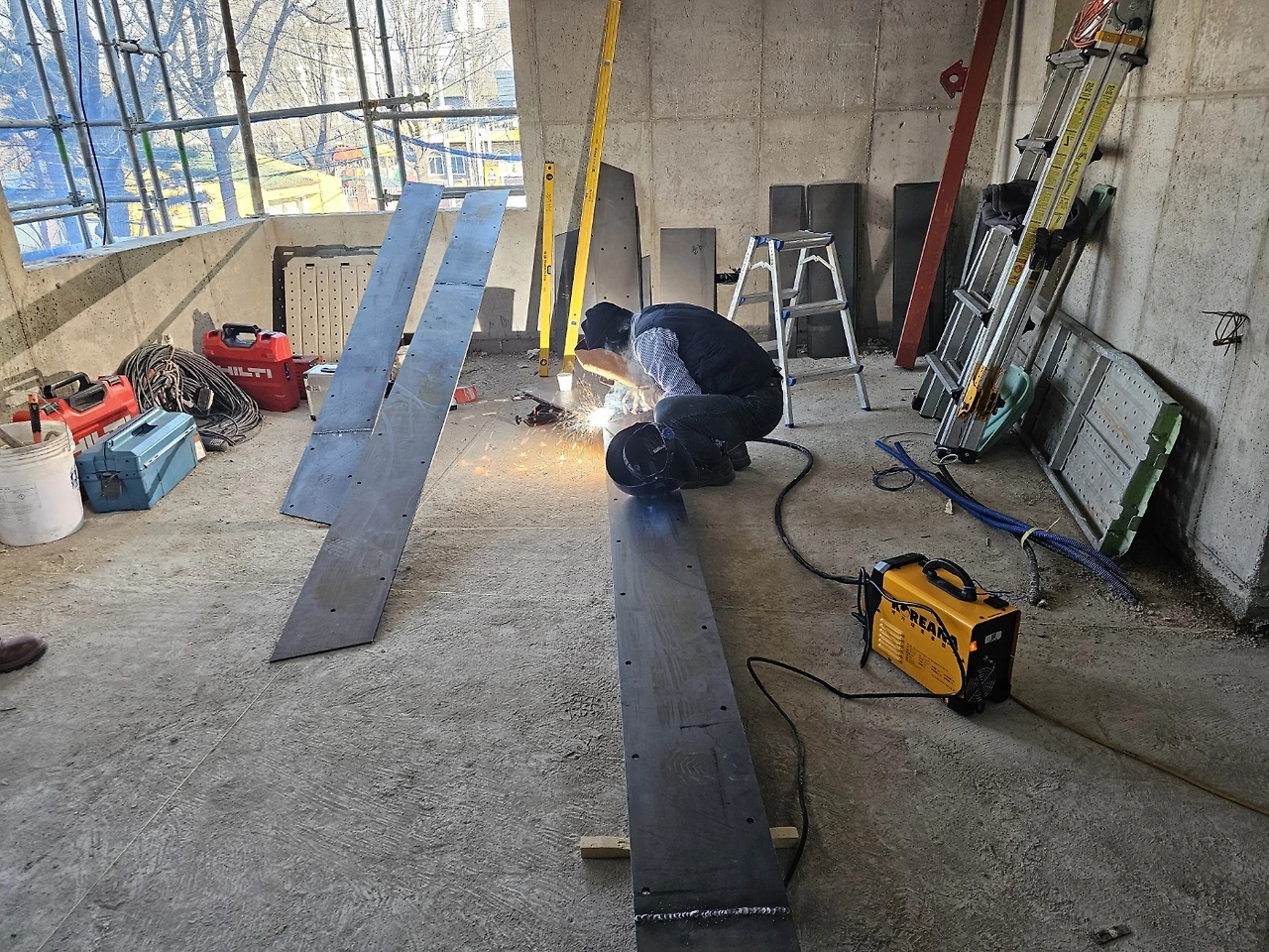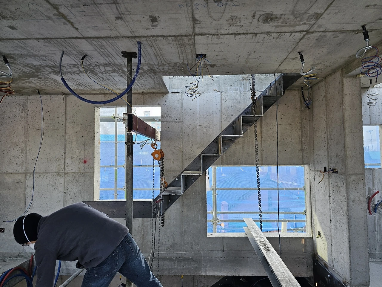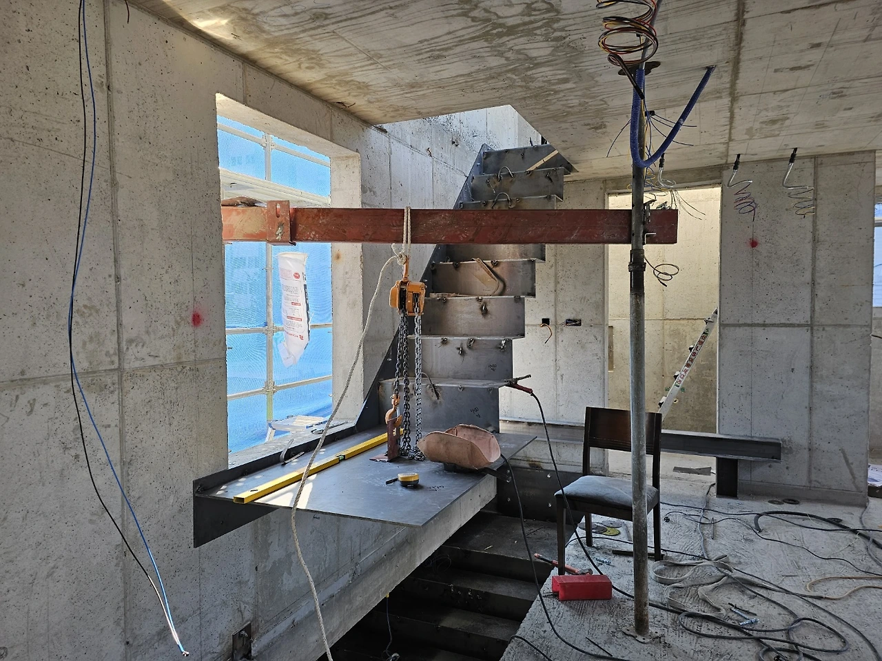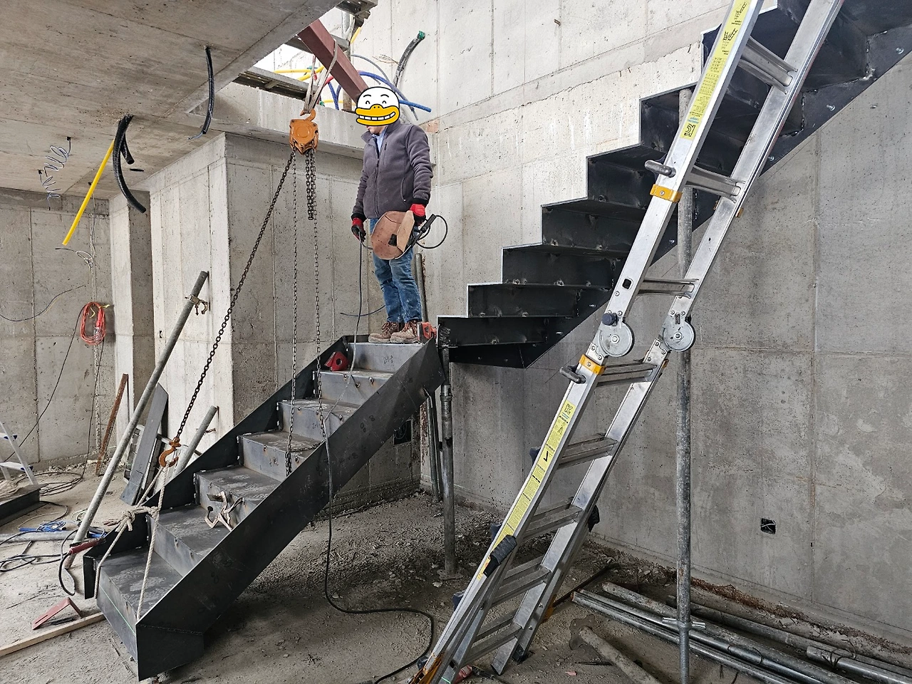 계단작업이 시작되었다. 골조가 완성되고 이제 실내공사를 하기 위해 가장 먼저 진행되는 작업이다. 일의 순서가 생기는 데는 다 이유가 있는 법, 작업자가 위아래 층을 자유롭게 드나들 수 있어야일이 수월해지기 때문이다. 샵드로잉으로 정교하게 그려진 작업도면을 토대로 레이저 커팅된 철판들이 도착하고 직접 현장에서 용접하여 이어 붙인다. 당연히 꽤 무거울 테고 그걸 벽에 붙이자면 생각처럼 그리 쉽지는 않아 보인다.