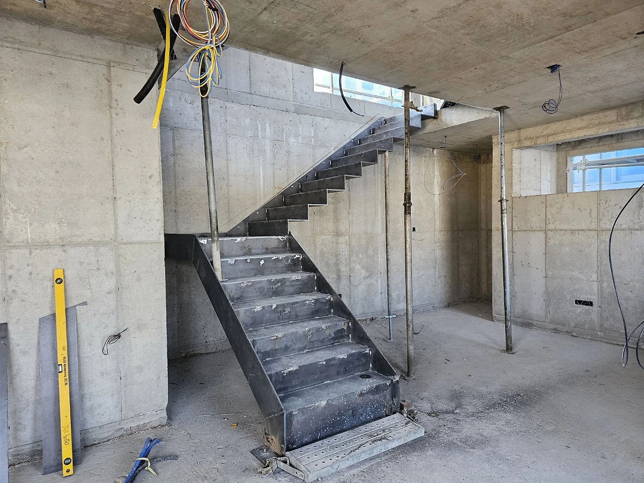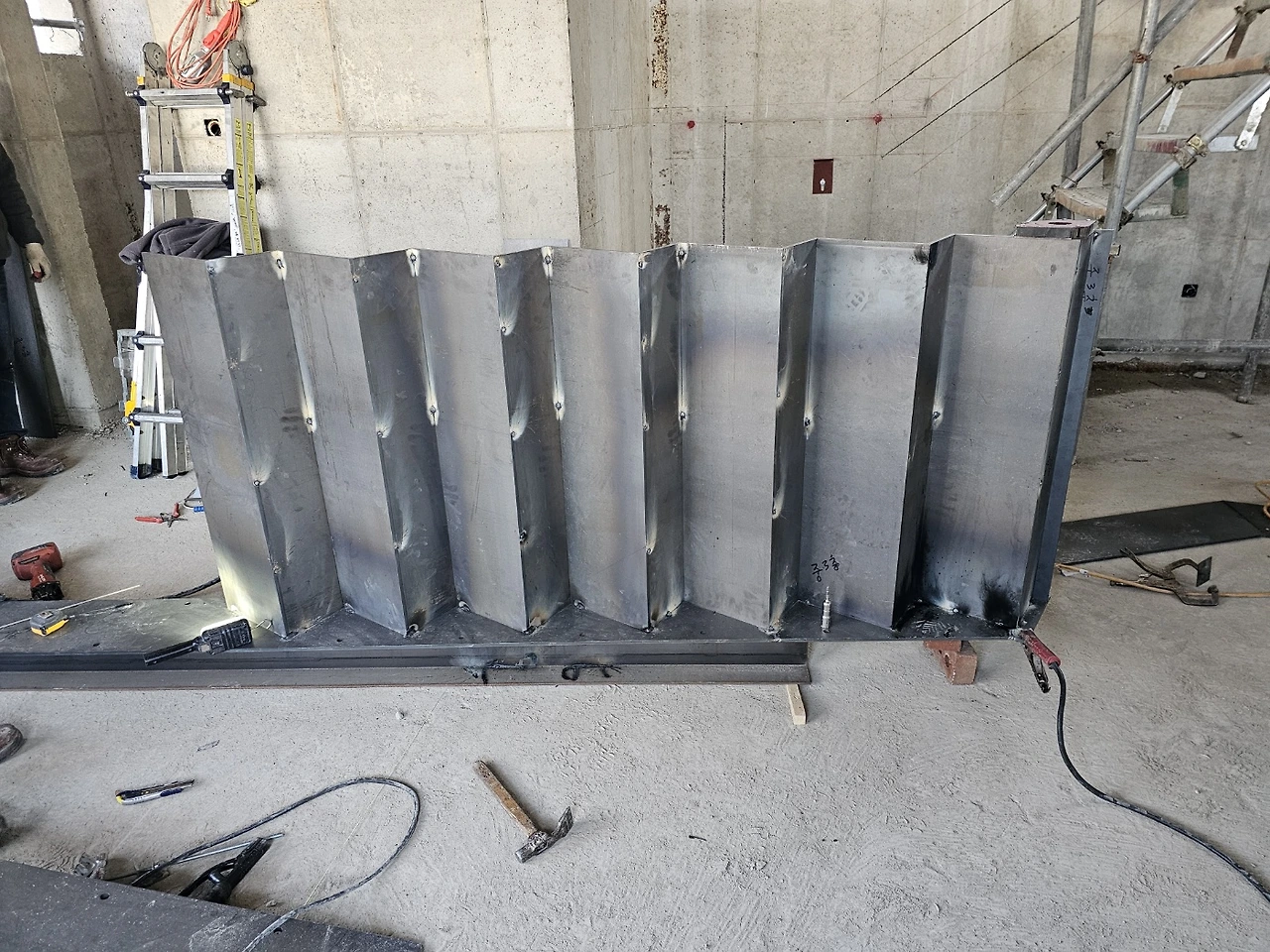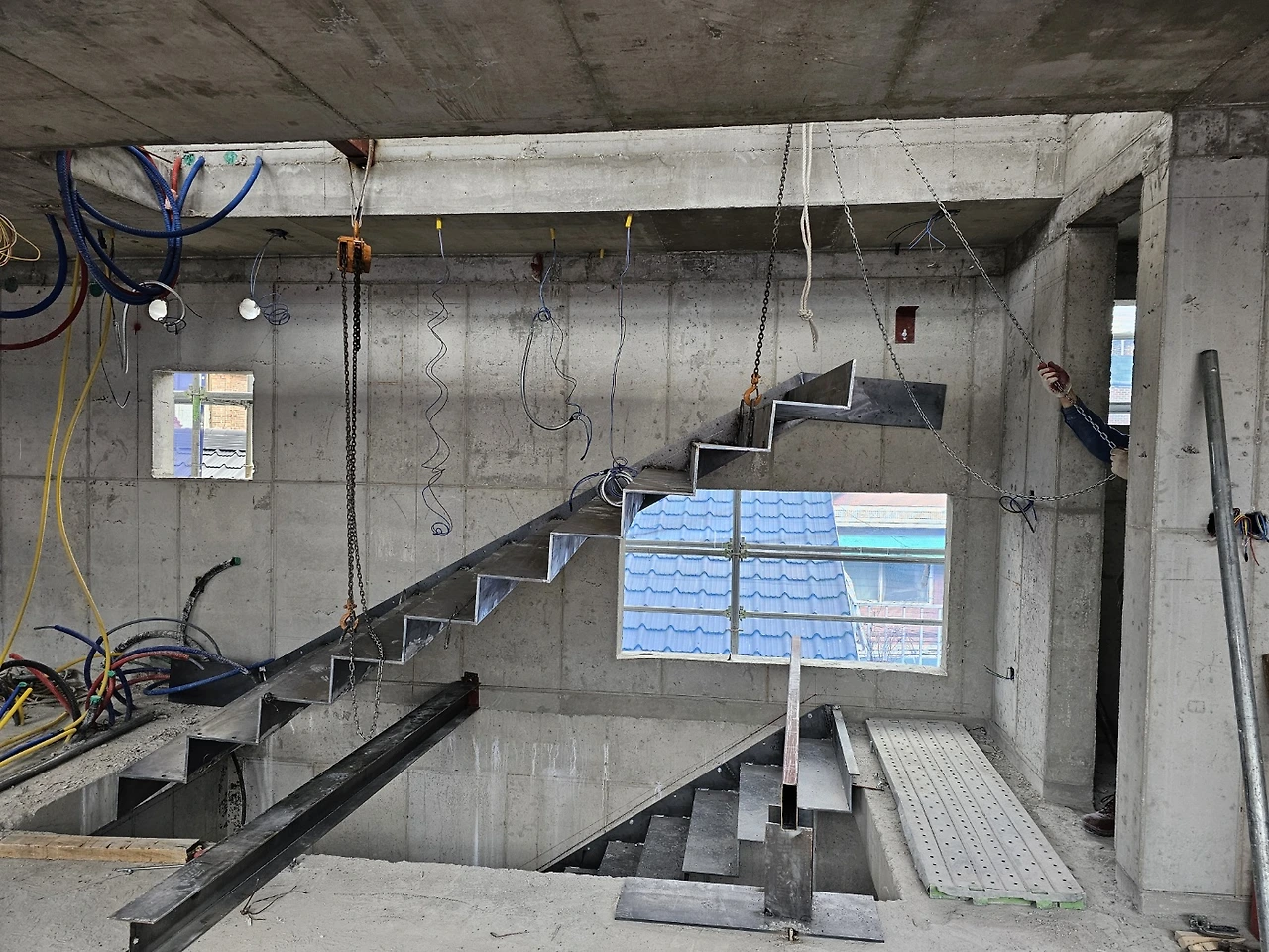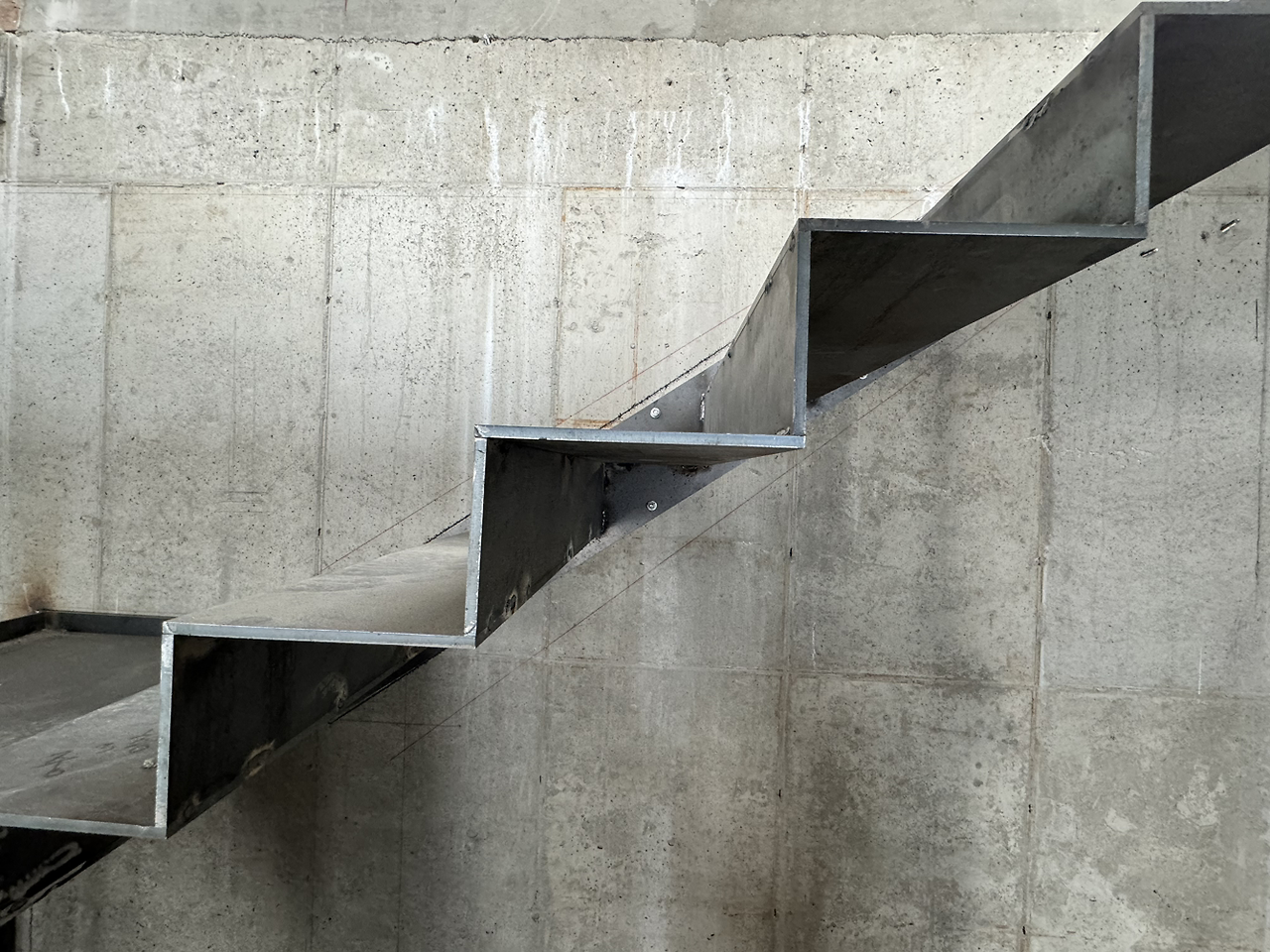 계단작업이 시작되었다. 골조가 완성되고 이제 실내공사를 하기 위해 가장 먼저 진행되는 작업이다. 일의 순서가 생기는 데는 다 이유가 있는 법, 작업자가 위아래 층을 자유롭게 드나들 수 있어야일이 수월해지기 때문이다. 샵드로잉으로 정교하게 그려진 작업도면을 토대로 레이저 커팅된 철판들이 도착하고 직접 현장에서 용접하여 이어 붙인다. 당연히 꽤 무거울 테고 그걸 벽에 붙이자면 생각처럼 그리 쉽지는 않아 보인다.