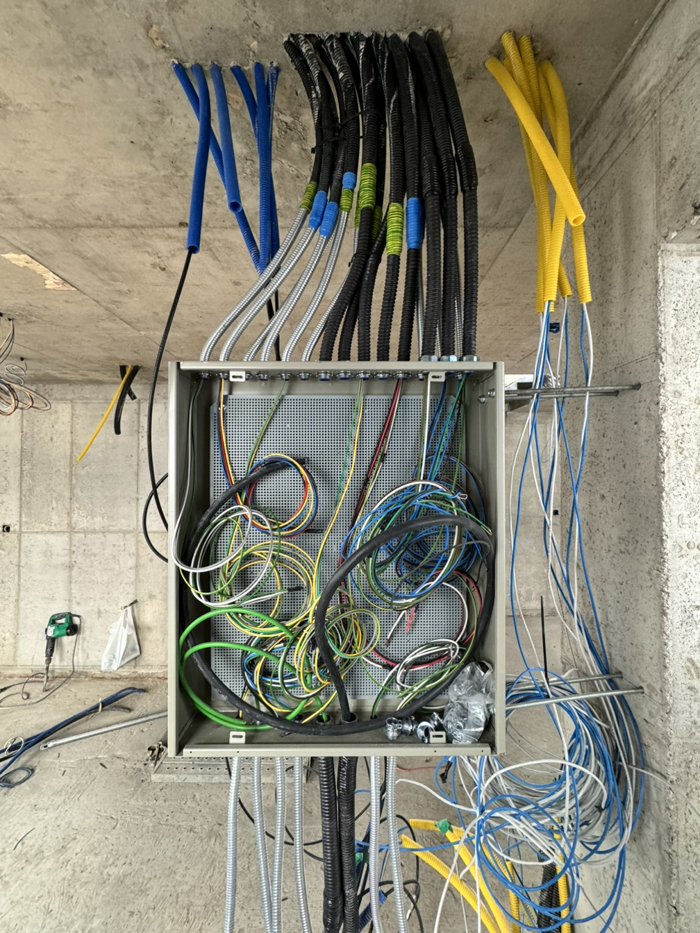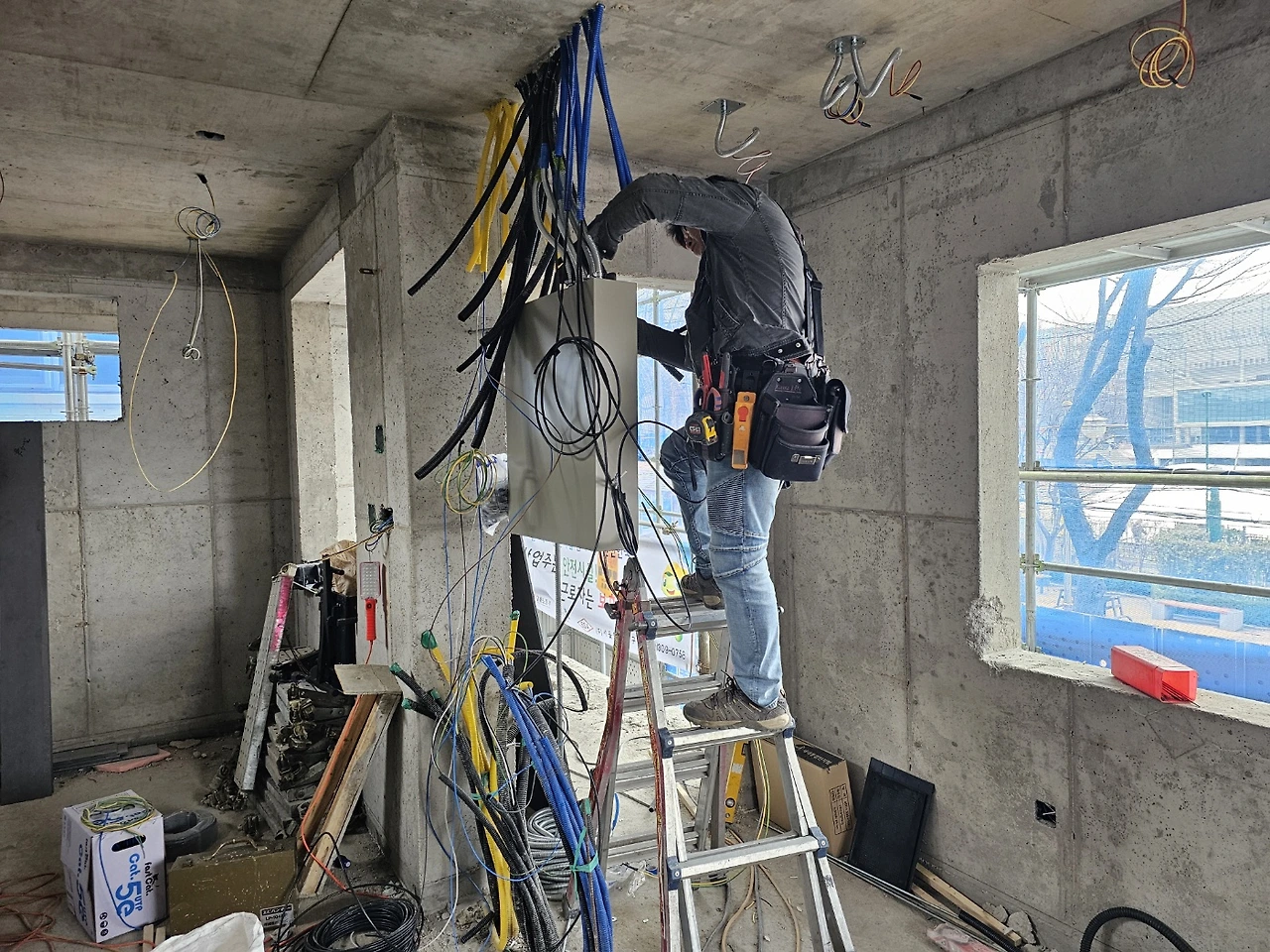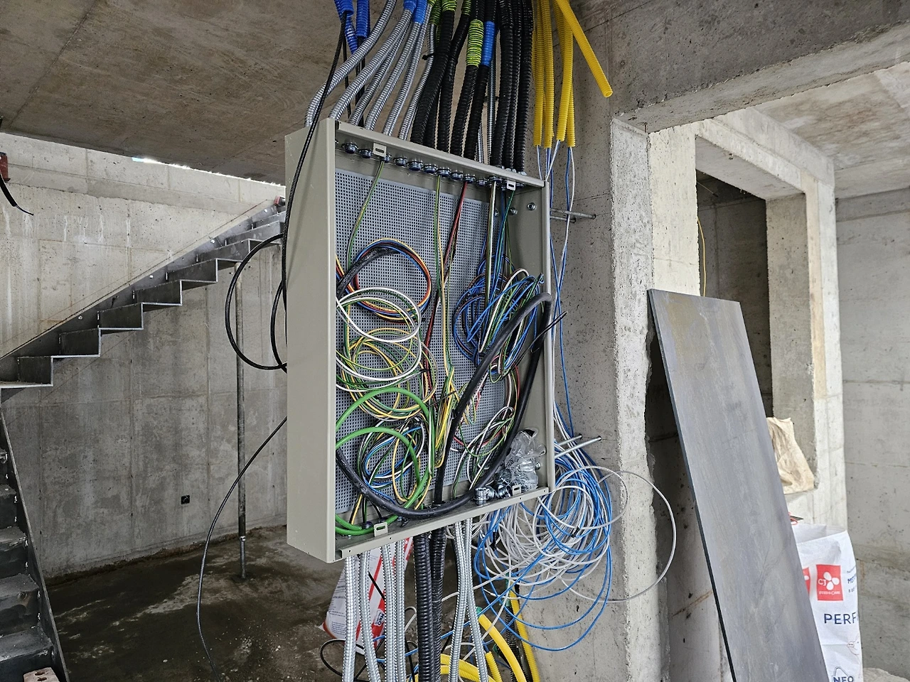 전기입선도 꽤나 복잡하다. 작은 공간이지만 사용되는 전력수요도 다르고 콘센트도 꽤나 많다. 요즘은 층마다 두꺼비집을 두기도 한다는데 이 집은 두 개로 분리하고, 에어컨, 인덕션, 오븐과 같이 전력수요가 높은 제품들은 단독처리해서 두꺼비집이 내려가는 걸 방지하고 있다. 전기단자 아래에는 통신단자가 위치할 예정이다. 보통 아파트 지하주차장 엘리베이터 근처에 두던 것들이 모두 집안으로 들어온다고 생각하면 되는데, 그래서 점점 쓸 수 있는 벽도 줄어든다.