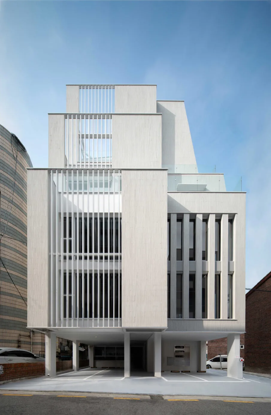 2층과 4층 테라스 난간을 벽돌로 쌓을 계획이었으나 안전을 위해 솔리드 형태로도 테스트를 해보았다. 아무래도 파사드가 밋밋해 보이는 게 인상이 달라지는 거 같다. 건물 내부가 건축주의 것이라면 건물의 외관에는 건축가의 지분이 있다는 입장이라 조소장님의 결정에 따르기로 했다. 벽돌 대신 각 파이프로 비슷한 느낌을 만들어 보기로 하셨다.