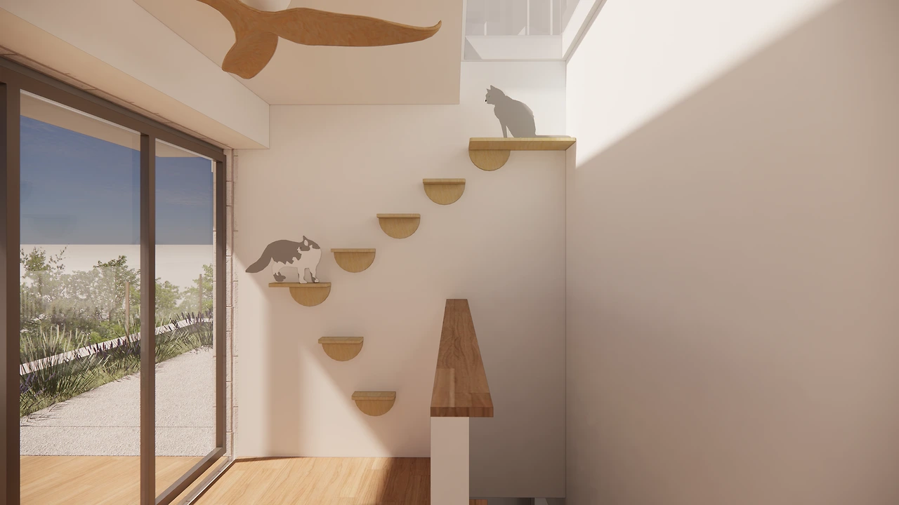 4층에서 옥탑으로 올라가는 계단은 바로 계단참인데 높이가 꽤 높아서 현장에서 놀라서 문의가 있었다. 올라가기 어려울 거라 계단을 하나 늘리는 게 어떻냐는 얘기셨는데 덕분에 계단참 하부에 수납공간이 있다는 걸 서로 인지하는 기회가 되었다. 계단이 늘어나면 계단참이 면적이 좁아지기도 하고, 나름 창과 맞춰 큰 창 앞에서 하늘을 보며 휴식할 수 있는 숨은 명소(?)를 시도해 본 곳이다. 더불어, 생각보다 집 안에 다리미판을 둘 곳이 마땅치 않다는 게 떠올라 서서 다림질하는 공간으로 활용하는 걸 조소장님과 계획했었는데 현장소장님이 들으시고는 단박에 오케이를 외치셨다. 그렇다면 해야죠! (정말 별 걸 다 생각했지요?)