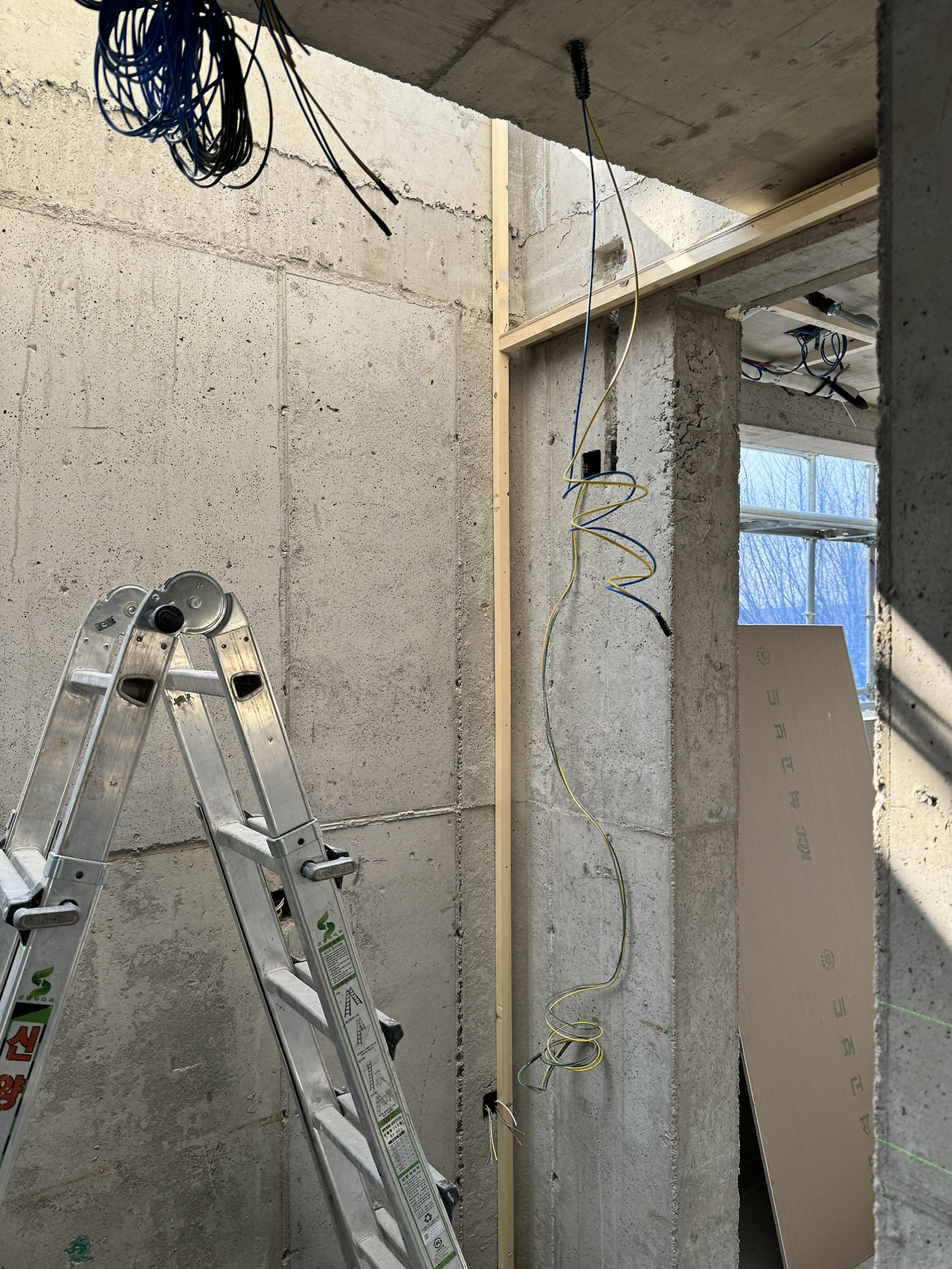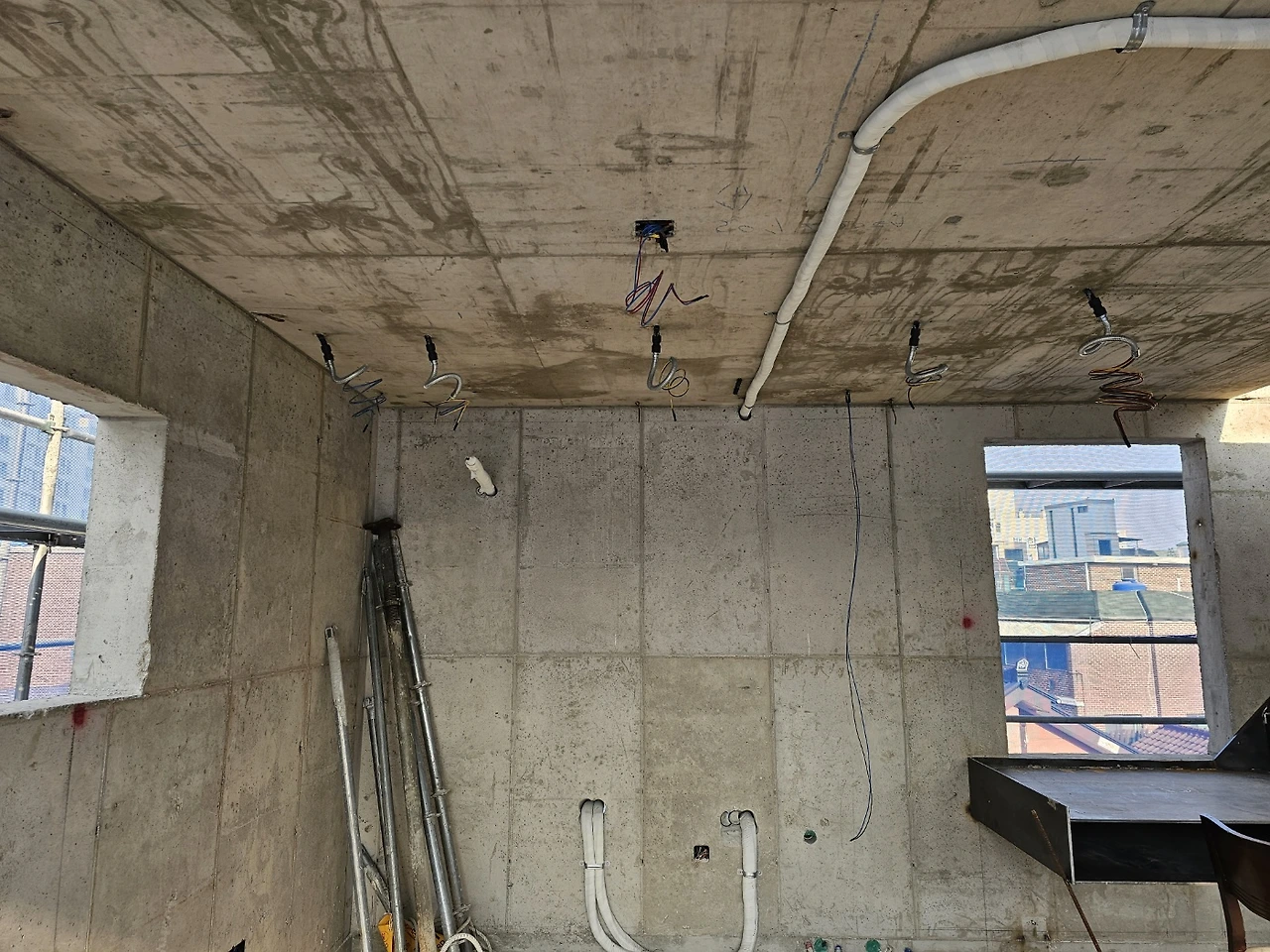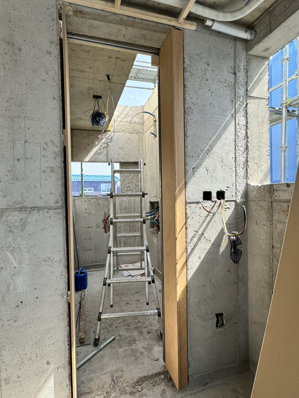 두꺼운 벽체가 이곳저곳 뚫렸다. 필요한 작업이라 어쩔 수 없지만 위치 조정을 위해 다시 뚫는 건 당연히 마음이 무겁다. 외단열이라 마감이 밖으로 깨끗하게 될 거란 걸 알면서도 그렇다. 콘크리트 건물은 역시 매끈한 매력이 최고라 구멍이 생기는 게 꺼려지는 건 어쩔 수 없다. 하지만, 집이 작다 보니 모든 사이즈가 여유 없이 타이트하게 만들어지는데서 비롯된 문제라 받아들일 수밖에 없다. 그러다가 딱 맞아떨어지는 걸 보면 느껴지는 쾌감! 오락가락하네.