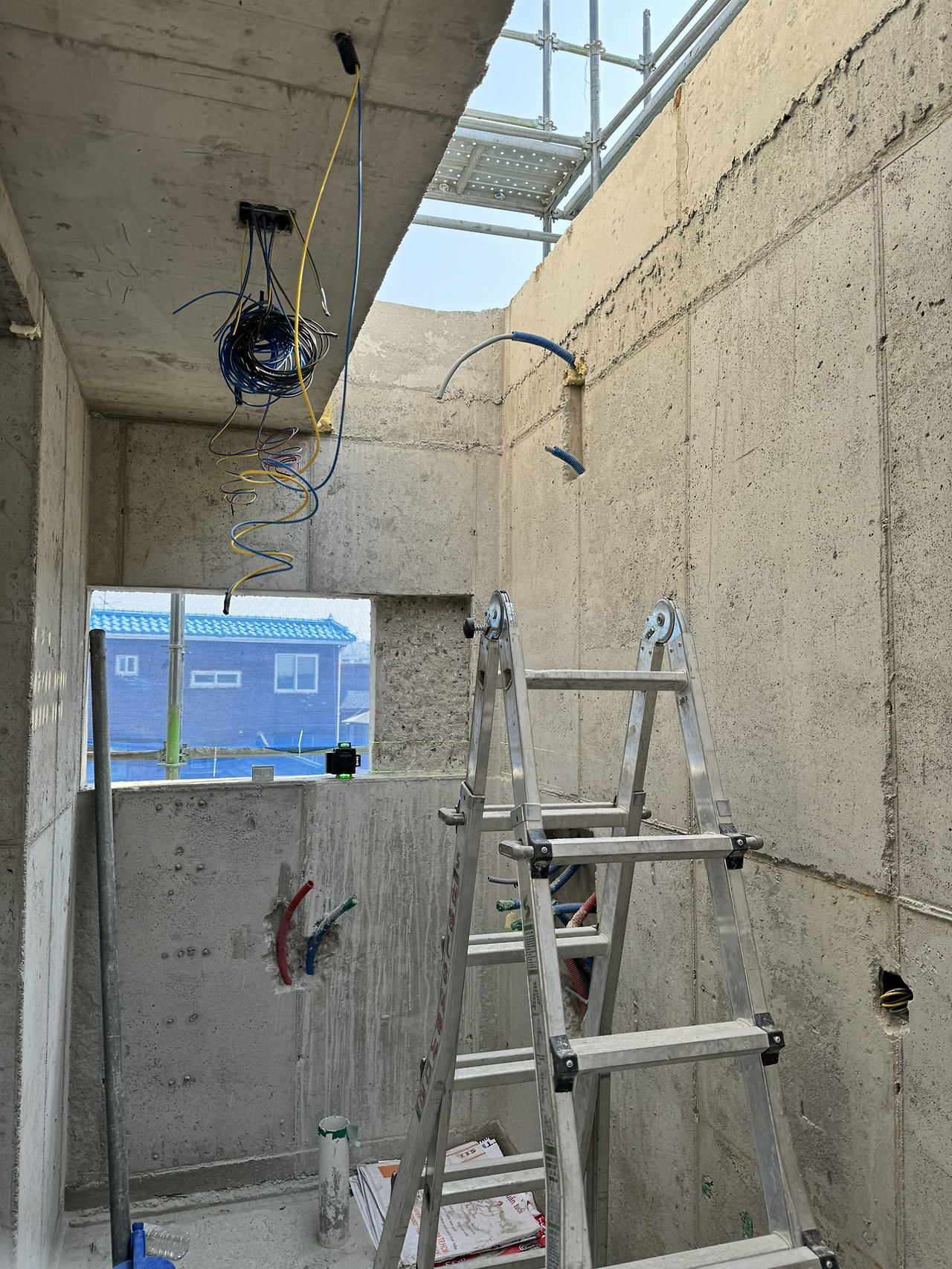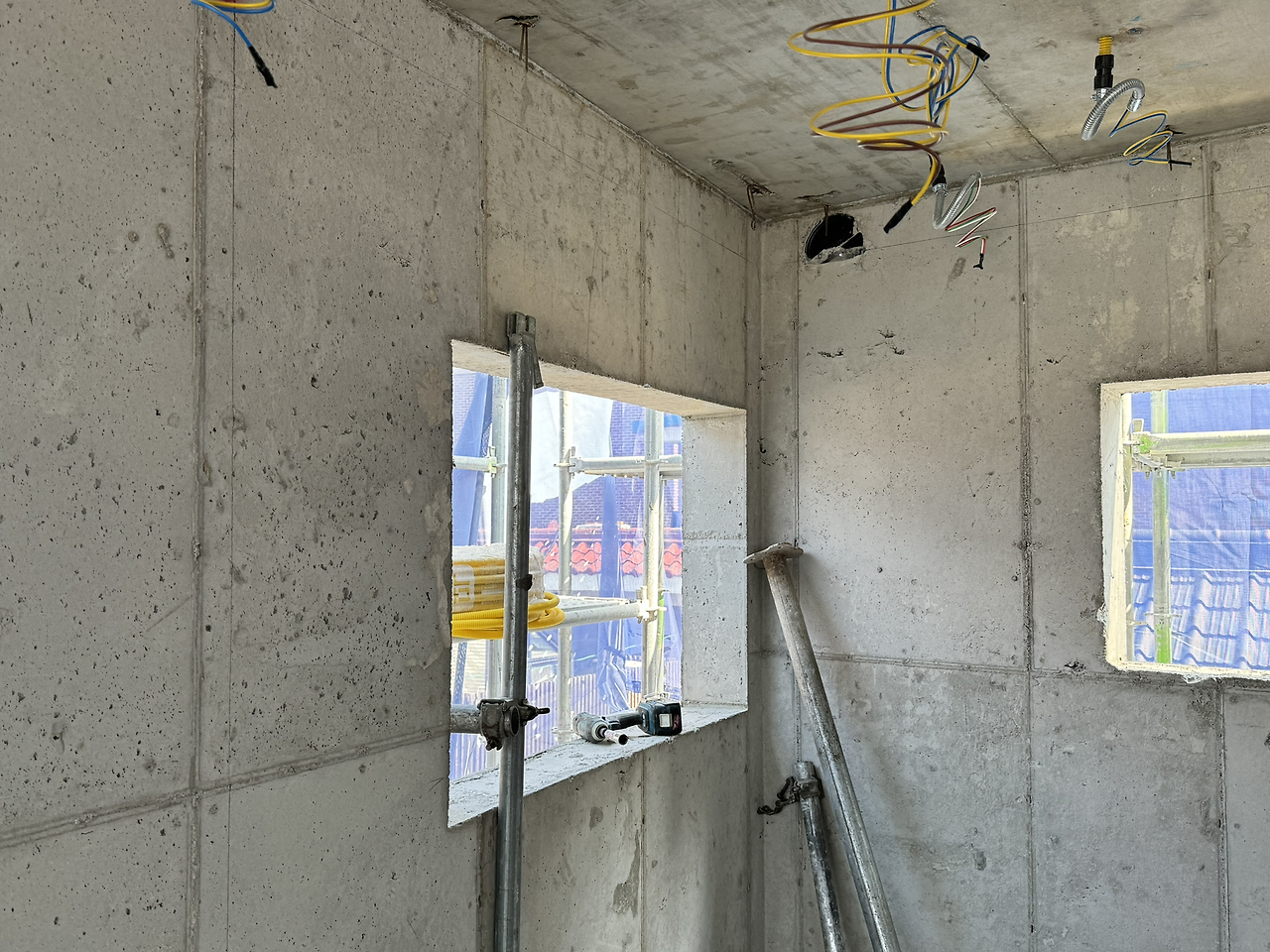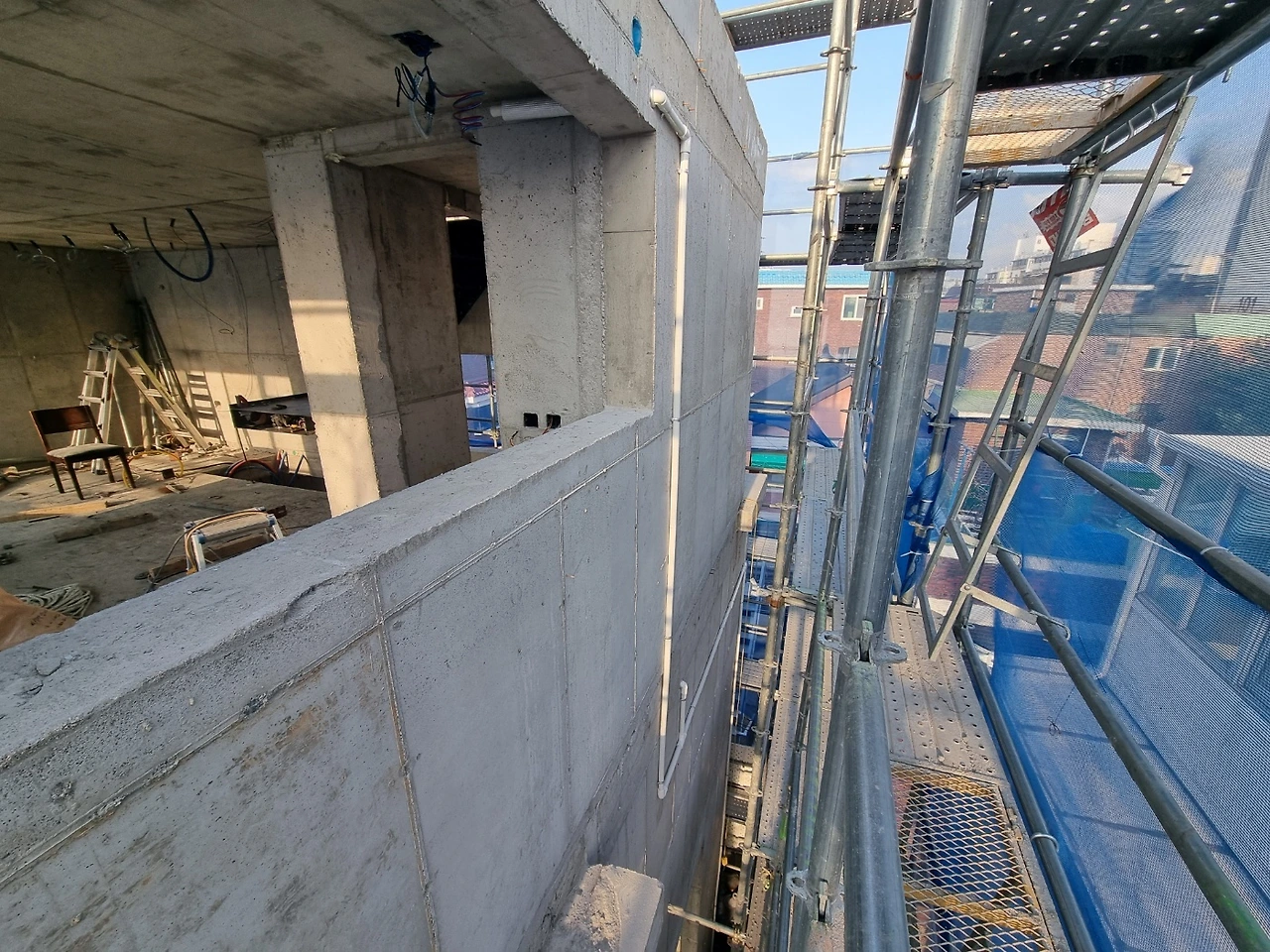 두꺼운 벽체가 이곳저곳 뚫렸다. 필요한 작업이라 어쩔 수 없지만 위치 조정을 위해 다시 뚫는 건 당연히 마음이 무겁다. 외단열이라 마감이 밖으로 깨끗하게 될 거란 걸 알면서도 그렇다. 콘크리트 건물은 역시 매끈한 매력이 최고라 구멍이 생기는 게 꺼려지는 건 어쩔 수 없다. 하지만, 집이 작다 보니 모든 사이즈가 여유 없이 타이트하게 만들어지는데서 비롯된 문제라 받아들일 수밖에 없다. 그러다가 딱 맞아떨어지는 걸 보면 느껴지는 쾌감! 오락가락하네.