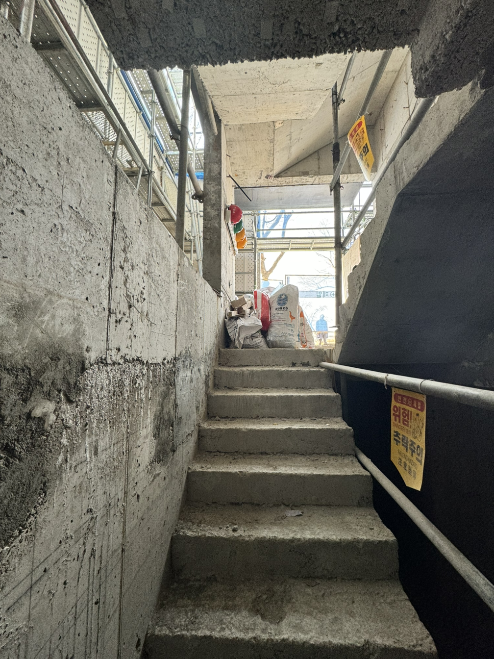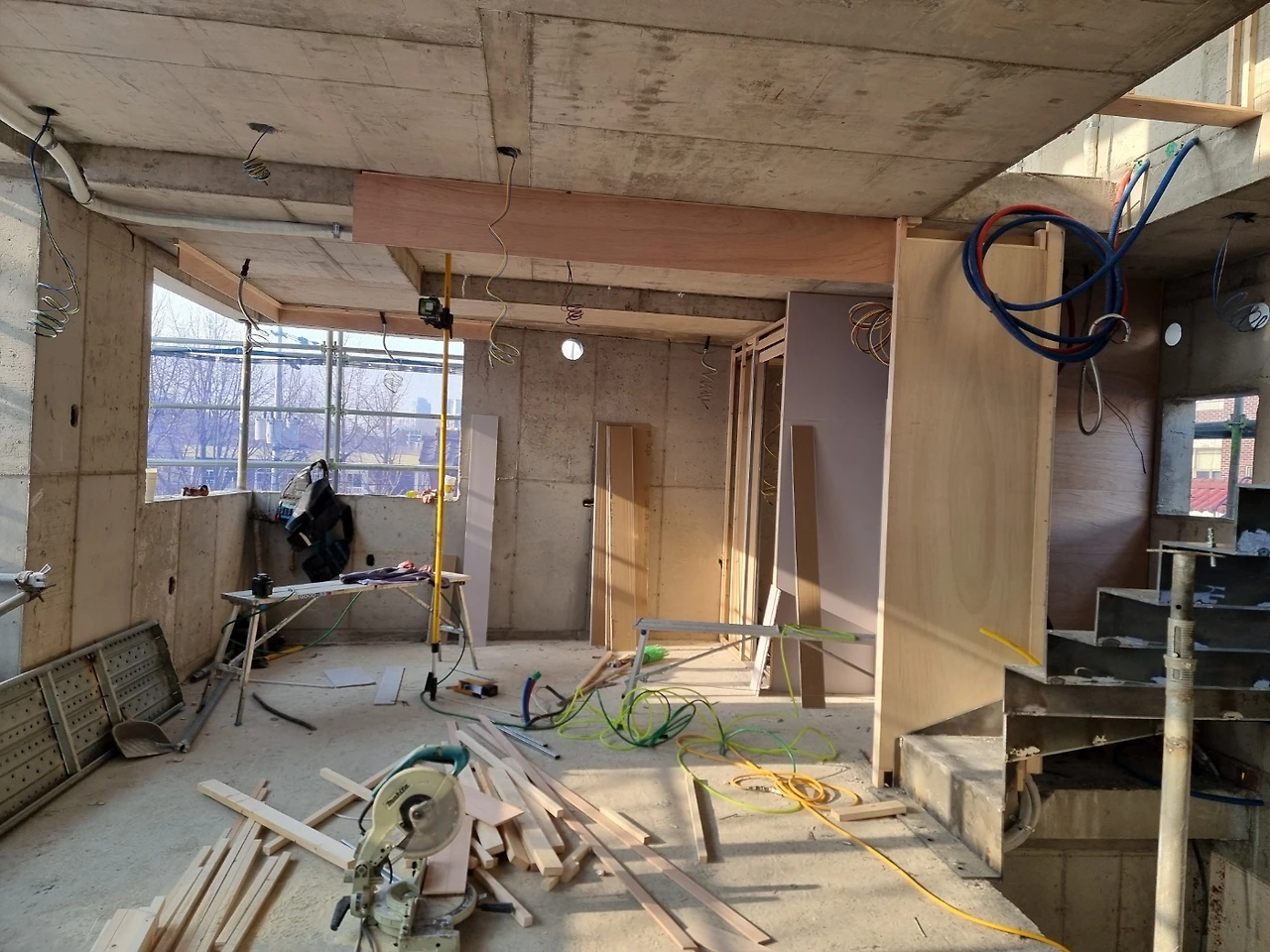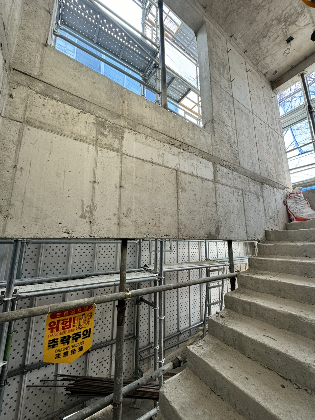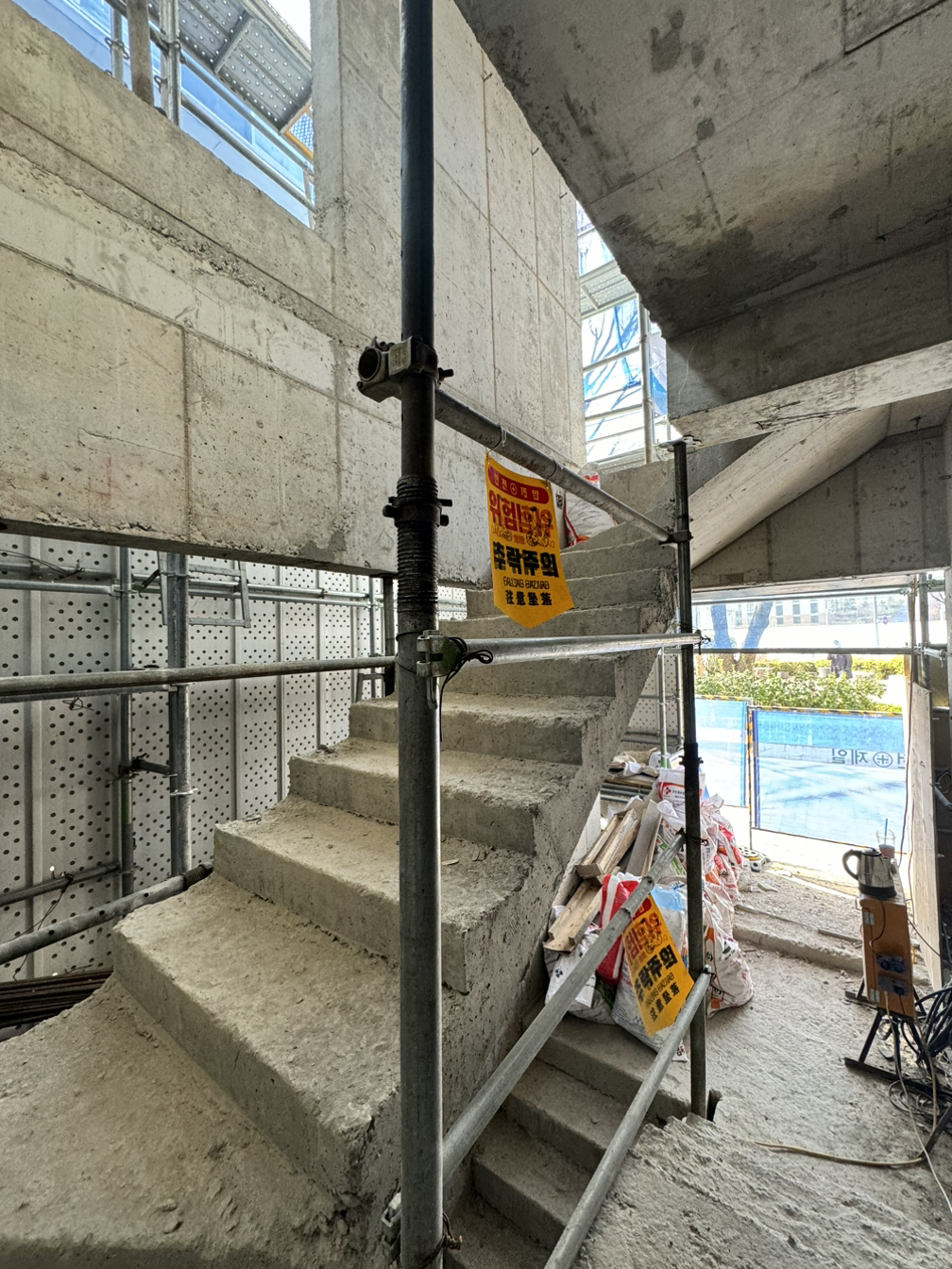 내부가 계단으로 모두 연결되고 이제 다듬는 작업이 시작되었다. 설비 배관을 위해 단단한 콘크리트 벽도 뚫어야 하고 직접 듣진 못하지만 소음이 꽤 생기는 일들이라 걱정이 생기는 기간이기도 하다.
