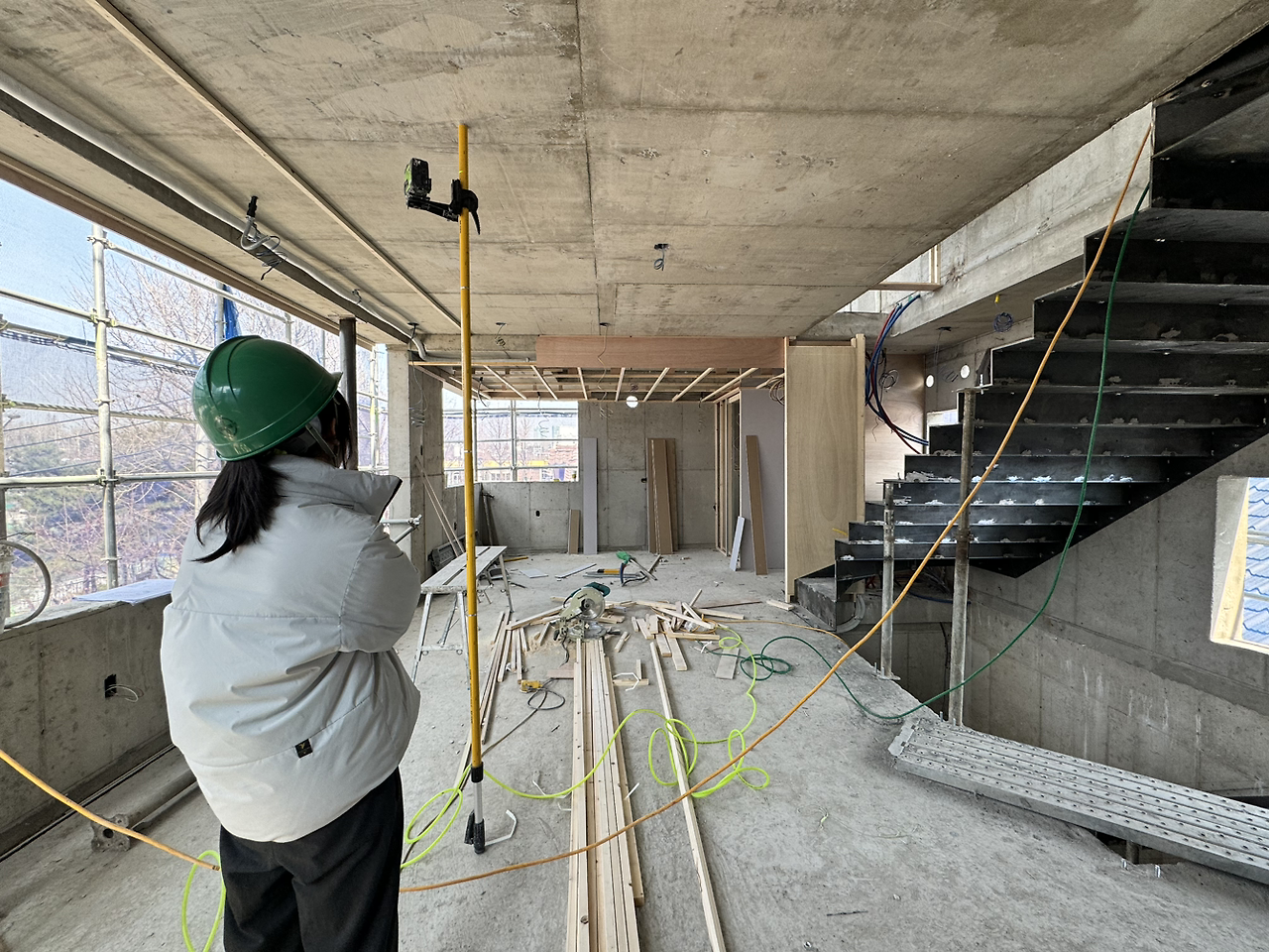 미리 그어진 천장과 바닥 먹선을 따라 수평계에서 나온 초록색 레이저가 벽면에 얹어진다. 똑바로 뻗은 광선을 가이드 삼아 각재로 공간을 나누고 벽면이 세워지고 문틀이 만들어지면서 도면으로 보았던 공간들이 하나 둘 모습을 드러낼 것이다. 평면에 그려진 도면이 실제 공간이 될 때 어떤 모습일지, 얼마나 비슷하고 얼마나 다를지. 그리고... '이젠 뭐든 돌이킬 수 없다'는 생각까지, 설렘인지 불안함인지 한 가지 감정으로 정의하기 어려운 긴장감에 갑자기 심장이 두근두근.
