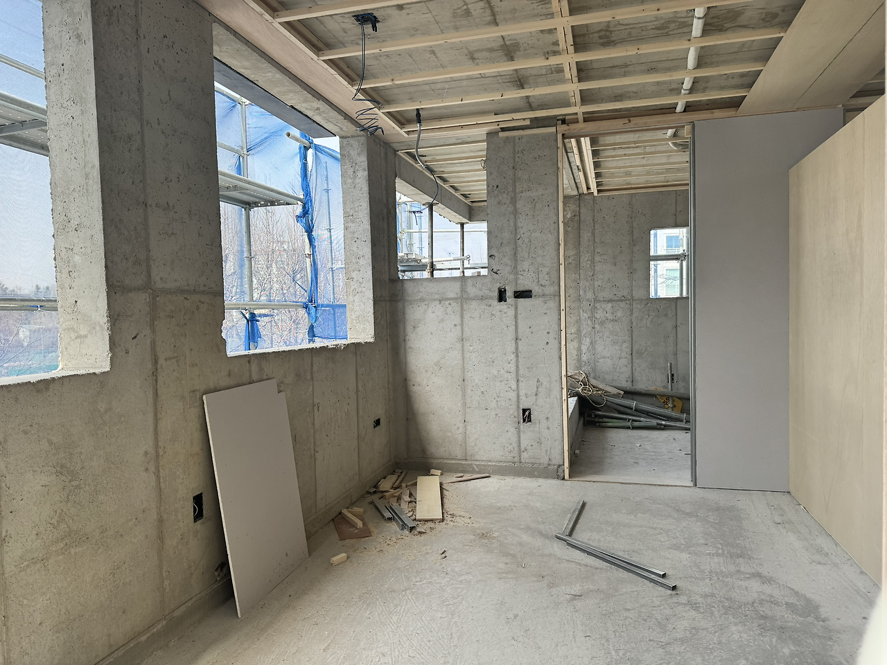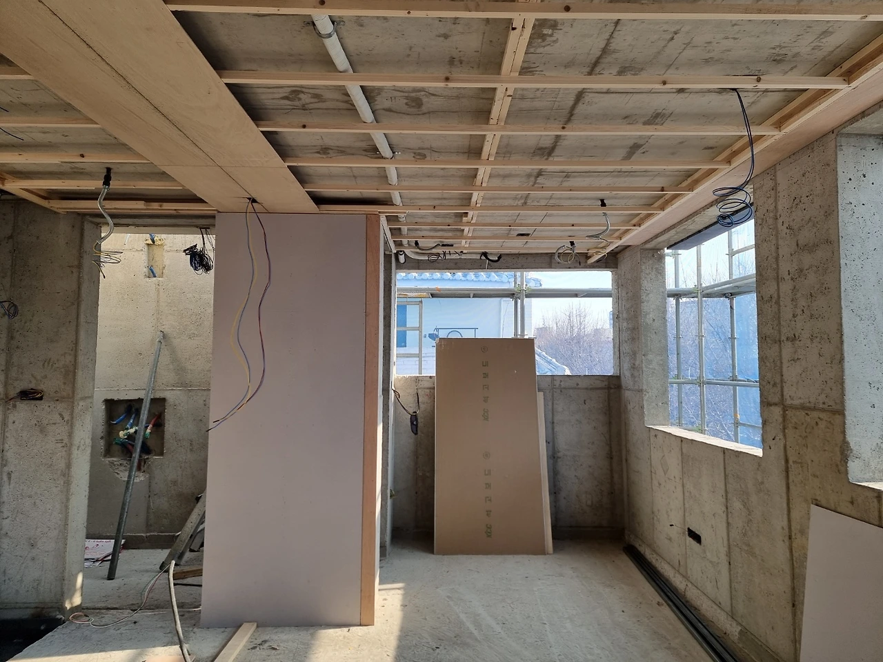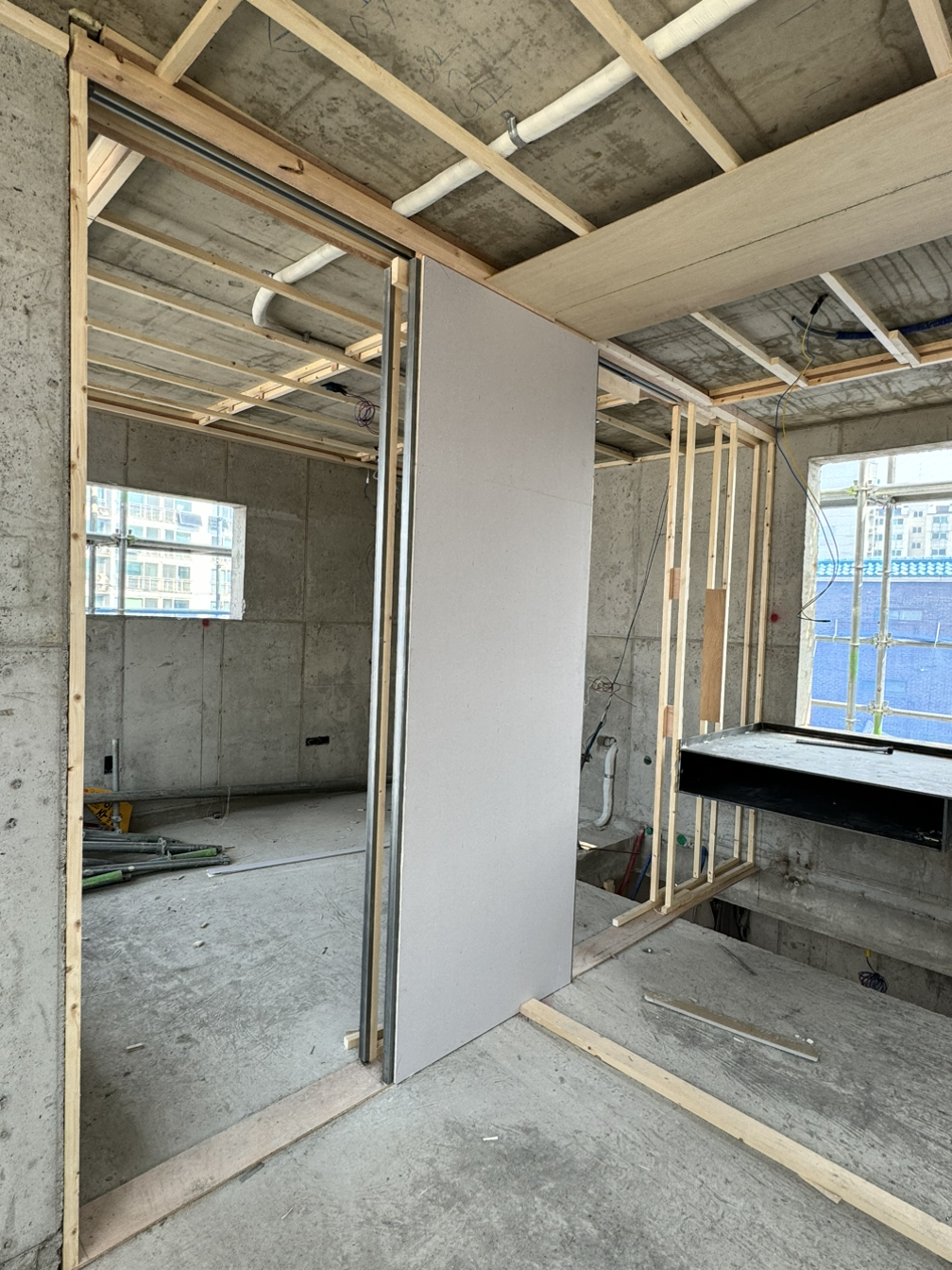 하루 만에 이럴 수도 있구나. 천장이 다 잡히고 벽이 들어서고 미닫이 문틀까지 작업된 걸 보고 깜짝 놀랐다. 이런 속도에 내가 미리 준비해야 하는데 혹여 빠뜨린 건 없는지 마음이 급해지기도 한다.