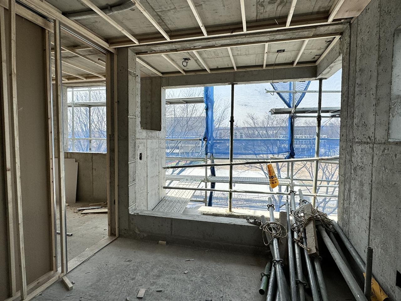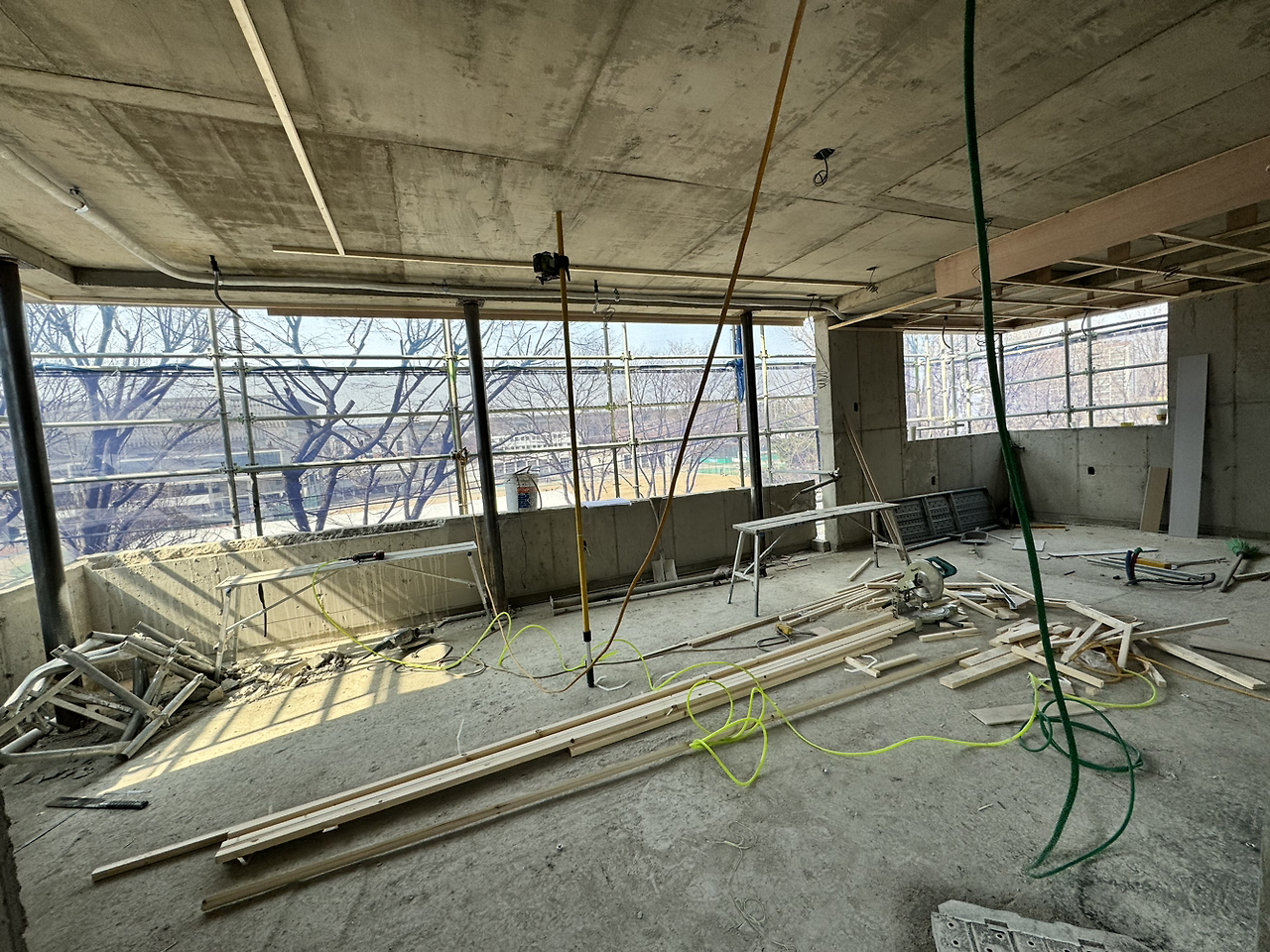 주말, 점심식사 시간을 틈타 현장사진을 층별로 찍어보았다. 볕이 잘 들고 바람도 잘 분다. 2층은 다용도실을 제외하고 가벽 없이 열린 구조이고 공원을 향해 난 창도 큰 편이라 시원해 보인다.