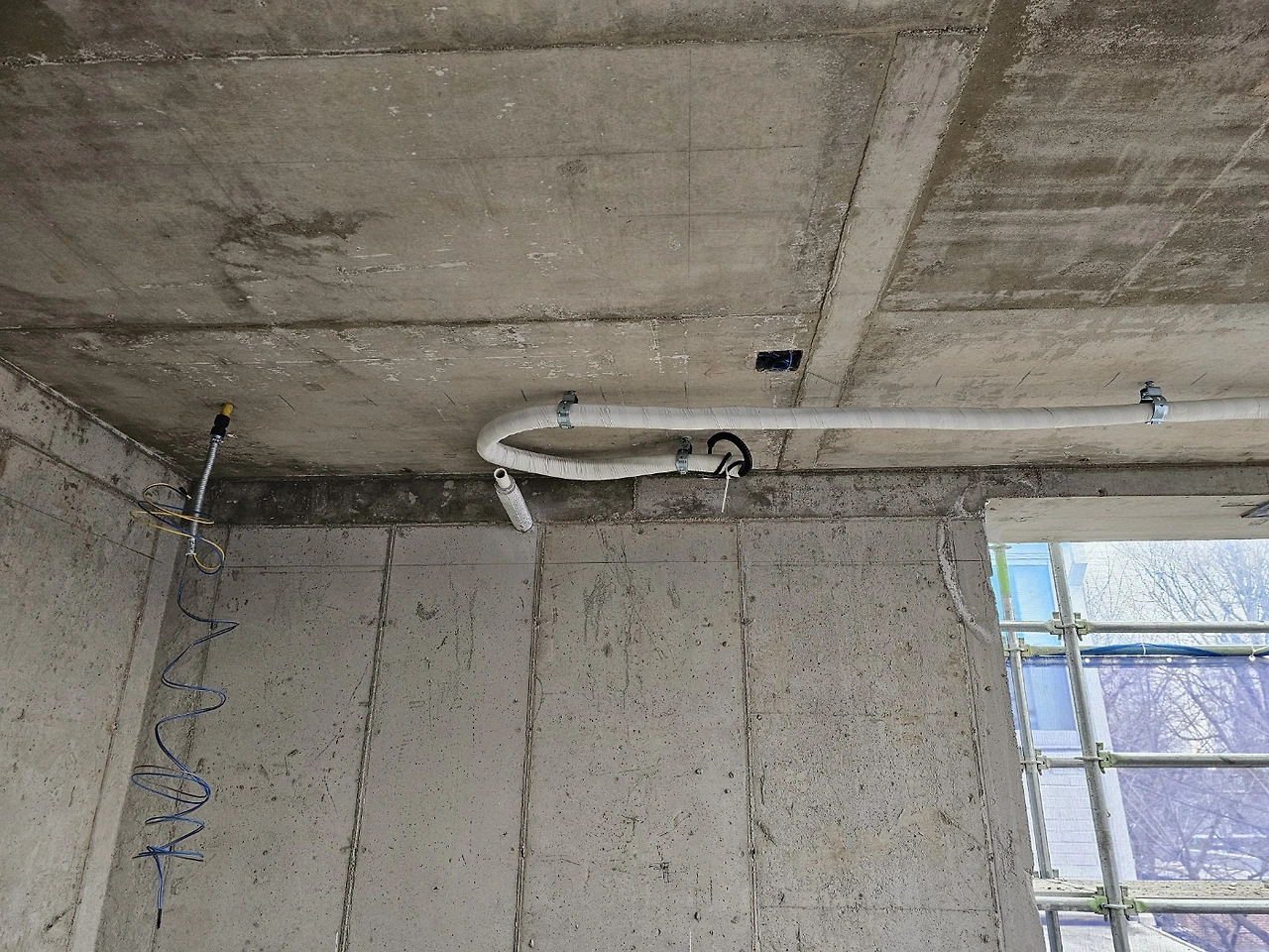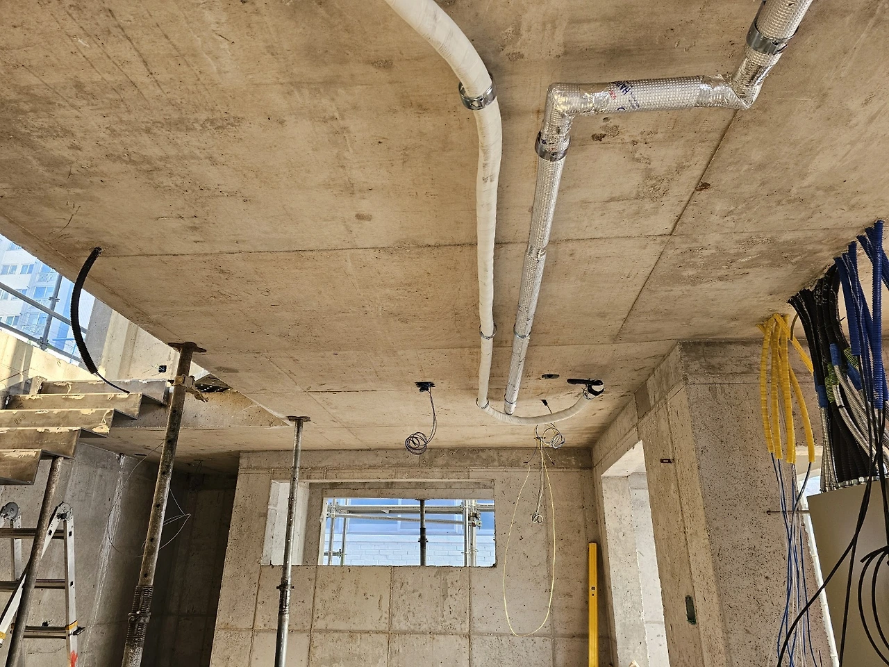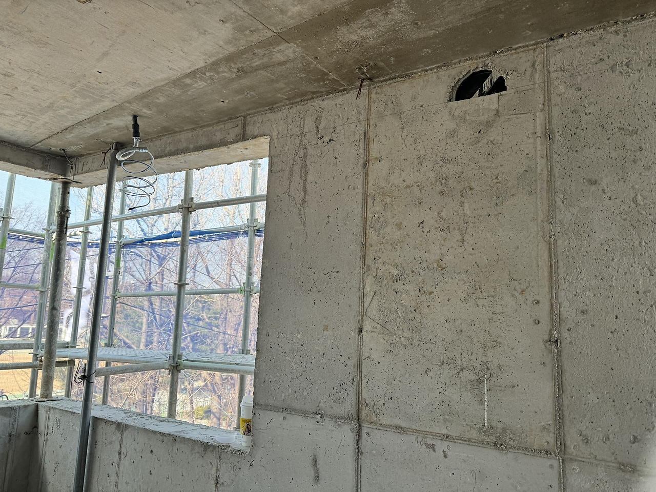 드레인코어 : 배관을 위해 원형으로 벽체를 타공 하는 것. 바닥 배관은 골조단계에서 잡아두었고 에어컨, 주방후드, 보일러 설치를 위해 필요한 크기별로 뚫는다.