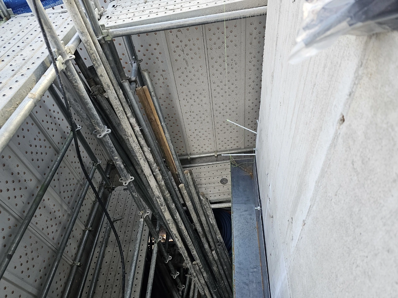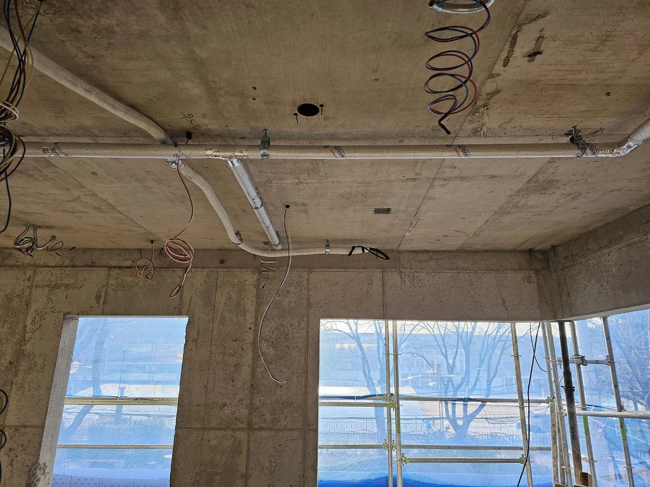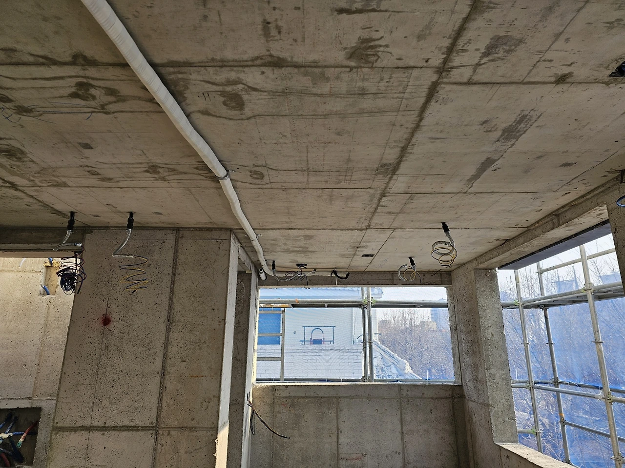 드레인코어 : 배관을 위해 원형으로 벽체를 타공 하는 것. 바닥 배관은 골조단계에서 잡아두었고 에어컨, 주방후드, 보일러 설치를 위해 필요한 크기별로 뚫는다.