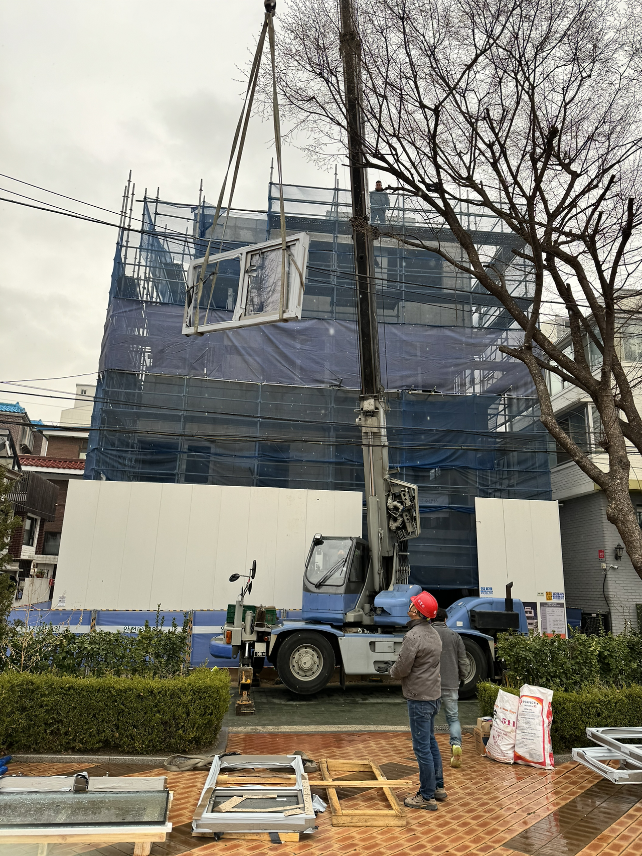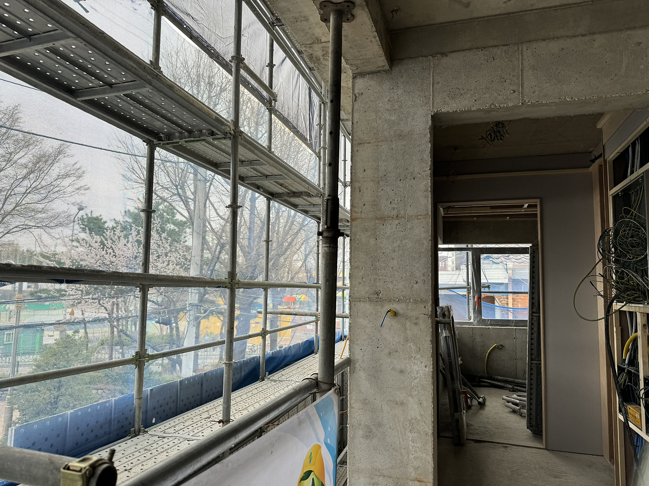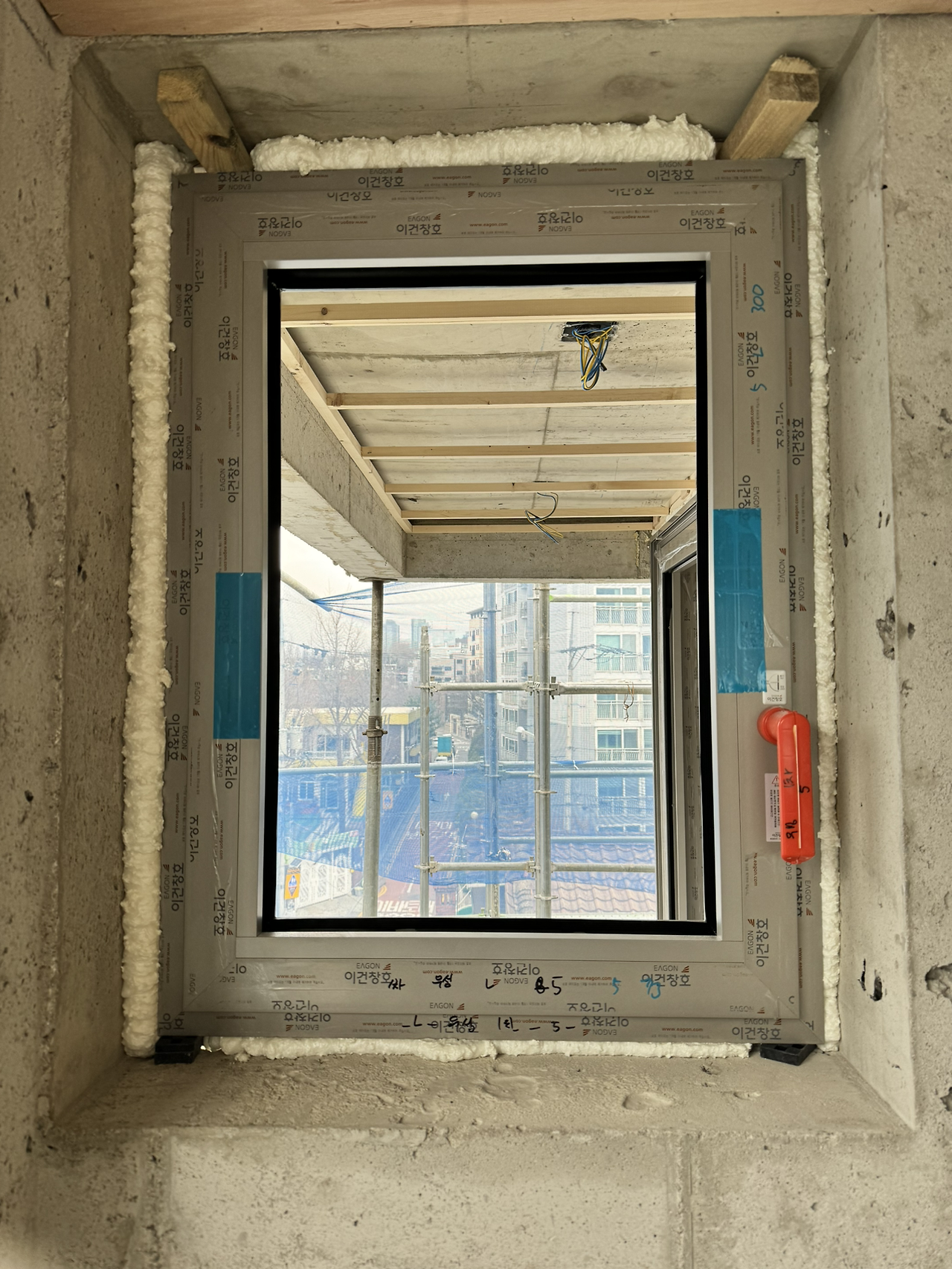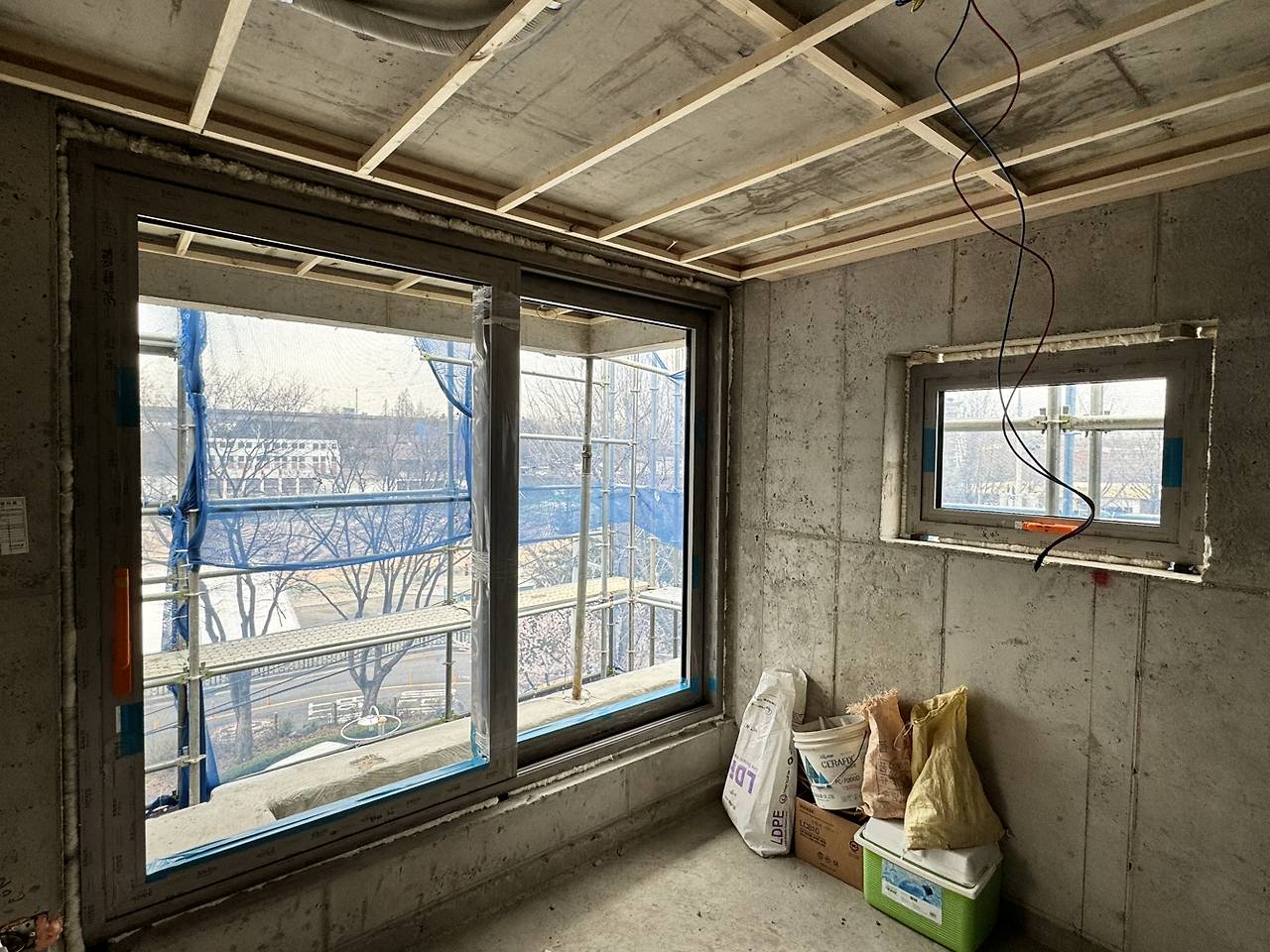 이번 주는 비가 왜 이렇게 오는지... 수목금에 창호설치가 완료되는 주라 기대했으나 비로 인해 일정이 약간 밀렸다. 이런 날은 한결 정확해지는 듯한 일기예보 대로 아침부터 비가 꽤 온다. 황사비를 제대로 맞고 있는 자재가 걱정되어 누림 대표님에게 여쭤보니 다행히 괜찮다고 하신다. 층마다 자재를 옮겨놓고 4층부터 작업이 시작되었다. 창호를 벽에 고정하다 보니 드릴을 박는 소음이 꽤 나는 모양이다. 그래서 토요일은 휴무.