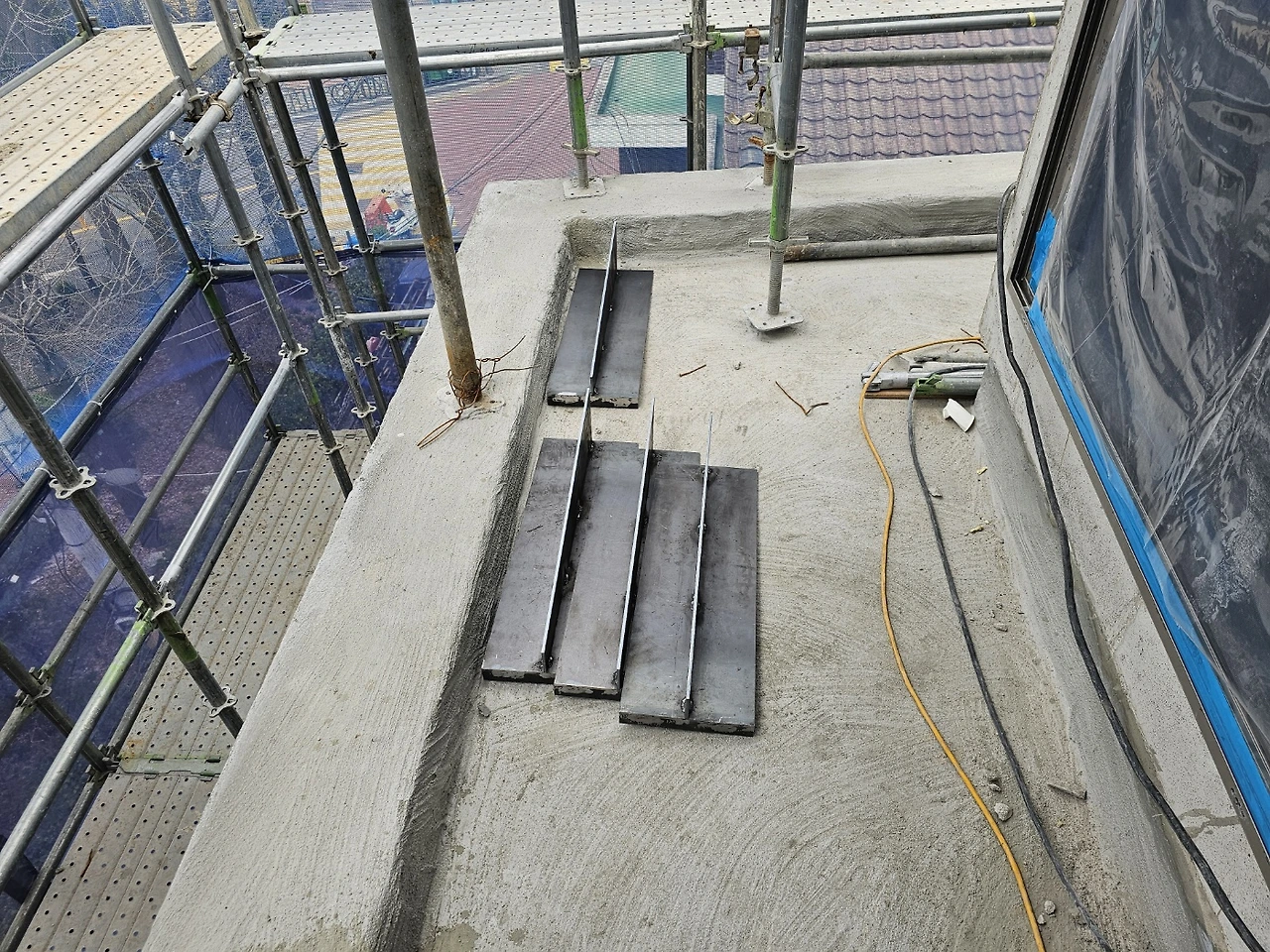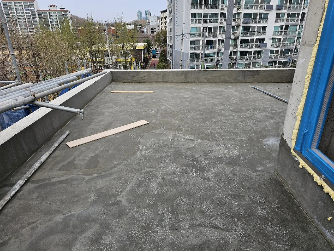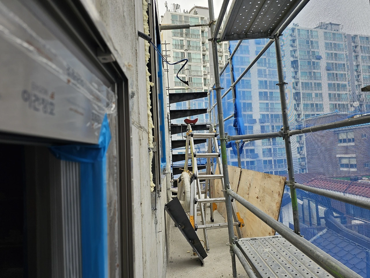 창호가 붙고 본격적인 내부 작업이 시작되기 전 방수작업도 한창이다. 욕실, 주방 등 물 쓰는 곳에 대한 내부 방수도 있고 옥상과 테라스, 외벽 등 누수가 발생하지 않도록 꼼꼼히 챙기고 있다. 결로나 누수는 건물의 하자로 이어지기 때문인지 방수를 위한 처리들이 여러 가지가 있나 보다. 옥상은 물론이고 층과 층이 만나는 지점을 방수처리하고, 두겁 파라펫을 넓게 설치해 빗물이 건물로 스미지 않고 바깥으로 흘러가게도 한다. 또, 건물보다 돌출된 파라펫은 빗물이 건물을 타고 흐르면서 생기는 외장재 얼룩도 방지해서 내구성을 올려준다고 한다.