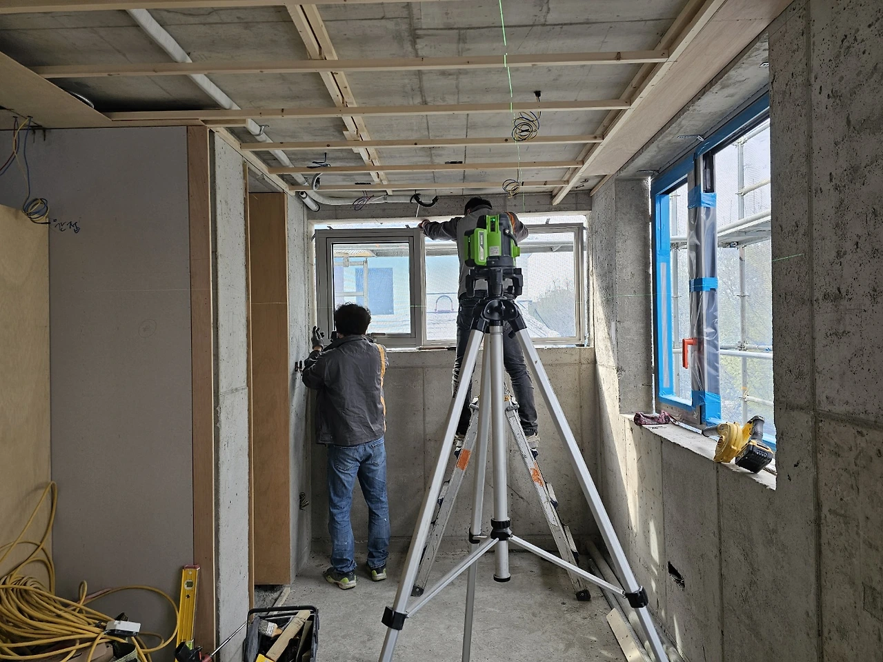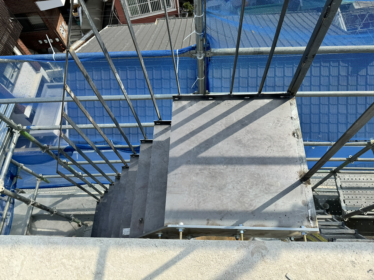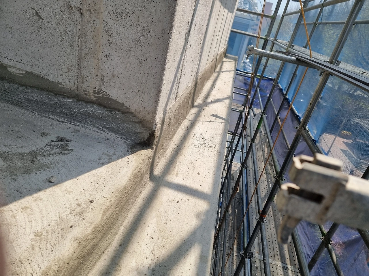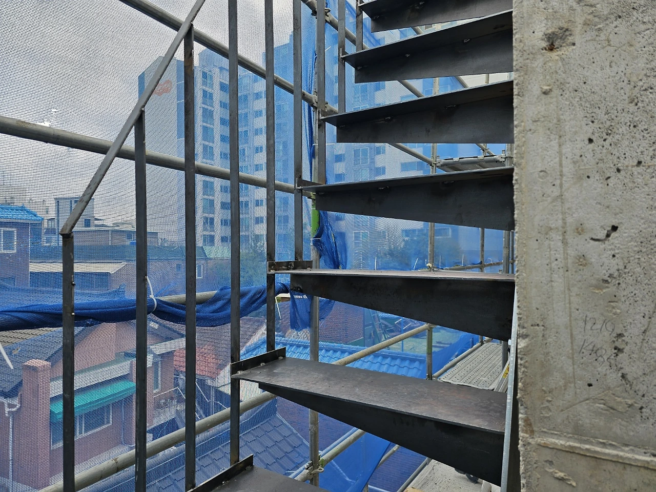 창호가 붙고 본격적인 내부 작업이 시작되기 전 방수작업도 한창이다. 욕실, 주방 등 물 쓰는 곳에 대한 내부 방수도 있고 옥상과 테라스, 외벽 등 누수가 발생하지 않도록 꼼꼼히 챙기고 있다. 결로나 누수는 건물의 하자로 이어지기 때문인지 방수를 위한 처리들이 여러 가지가 있나 보다. 옥상은 물론이고 층과 층이 만나는 지점을 방수처리하고, 두겁 파라펫을 넓게 설치해 빗물이 건물로 스미지 않고 바깥으로 흘러가게도 한다. 또, 건물보다 돌출된 파라펫은 빗물이 건물을 타고 흐르면서 생기는 외장재 얼룩도 방지해서 내구성을 올려준다고 한다.