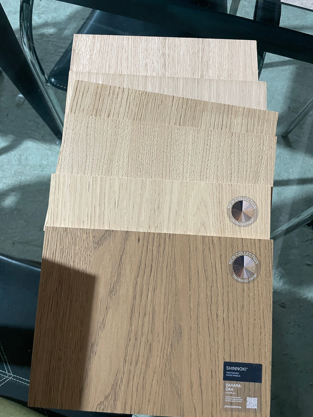 일조권 침해를 피하기 위해 옥상으로 가는 외부계단이 가파른 편이다. 그럼에도 만듦새는 역시 좋다. (망원동 인정, 장인 금속 사장님) 컬크스 오크목재(무늬목)는 가격대가 높아서 드랍하고 오크로 적절한 수준의 자재를 찾아보기로 했다. 무늬목은 원목을 얇게 붙여서 자연스럽게 원목효과를 내는데 컬크스는 컬러나 촉감 모두 아주 좋지만, 내장 가구도 꽤 있고 부담되는 수준이긴 하다. 오크는 나뭇결이 자연스럽고 아름답다. 그래서 '참'나무인가?