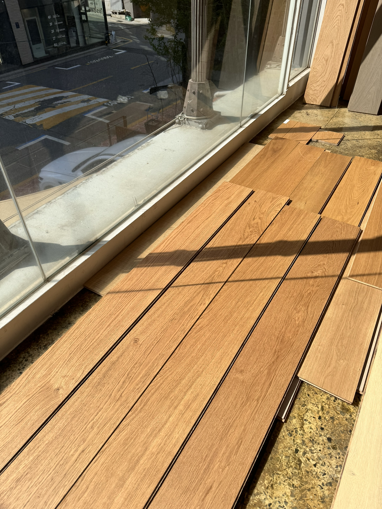 폭이 넓은 지복득마루 샘플이 마음에 계속 남은 상태에서 마지막으로, 창호 선정 시 방문했던 이건창호 쇼룸에 들렀다. 전에 본 것은 라르고솔레인데 매장 바닥에도 설치가 되어 있어 시공결과를 예상하기 좋다.