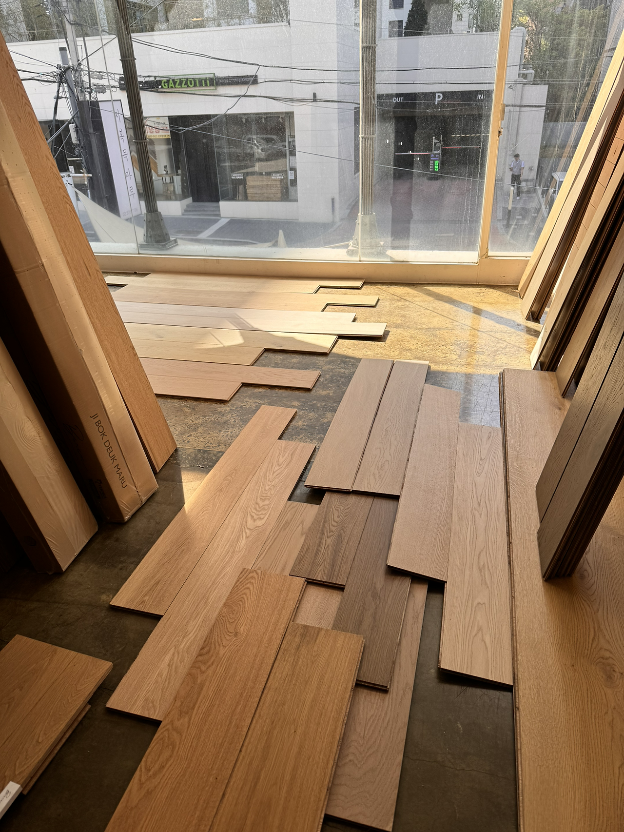 오늘은 자재선정을 하는 날. 아침 일찍 나날 조소장님과 논현동에서 만났다. 오늘의 미션은 원목마루와 타일 고르기! 마감재의 기본이자, 실내의 인상을 좌우하는 동시에 한 번 하면 오래오래 쓸 확률이 높은 하드웨어들.