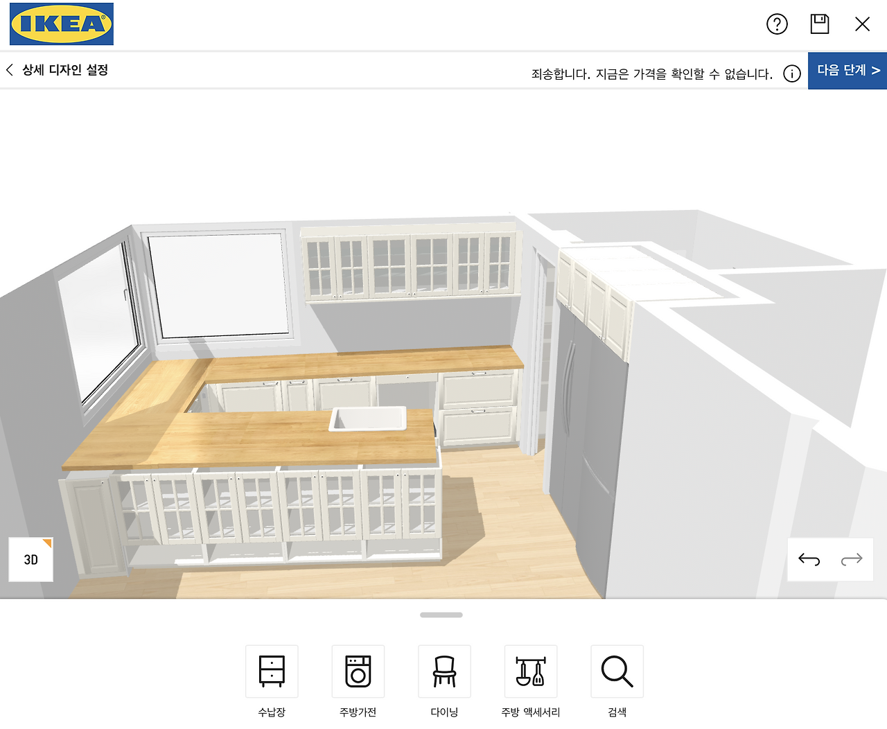 이케아 주방플래너로 직접 만들어 볼 수 있고, 예약을 하고 가면 좋은데 일찌감치 하지 않으면 시간을 잡기 어려울 수 있다. 예약을 못했더라도 매장에 가면 플래닝 기기 주변에서 직원들이 도와주기 때문에 주방 사이즈만 알고 있으면 뚝딱뚝딱 전체 구성은 금방 만들어 보고 비용까지 바로 확인 가능하다. 기본 틀이 되고 나면 세부 편집은 어렵지 않기 때문에 현장에서 더 해보거나, 작업버전의 디자인코드를 생성해서 집에서 구성을 바꿔보는 쪽이 편하다. 2019년에 처음 했을 때와 비교해서 플래너 속도가 빨라져서 충분히 직접 할 만하다.