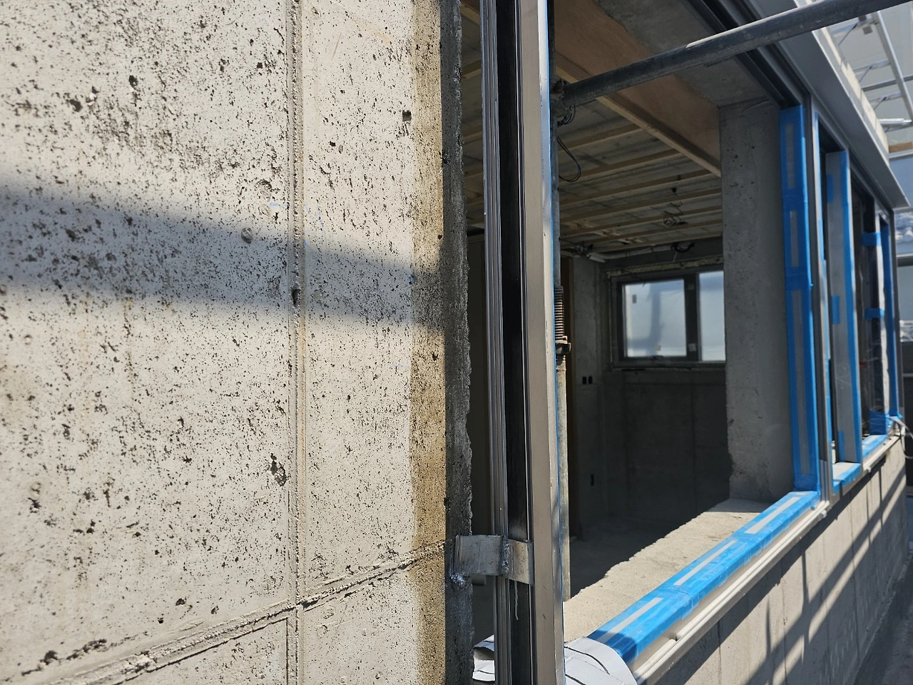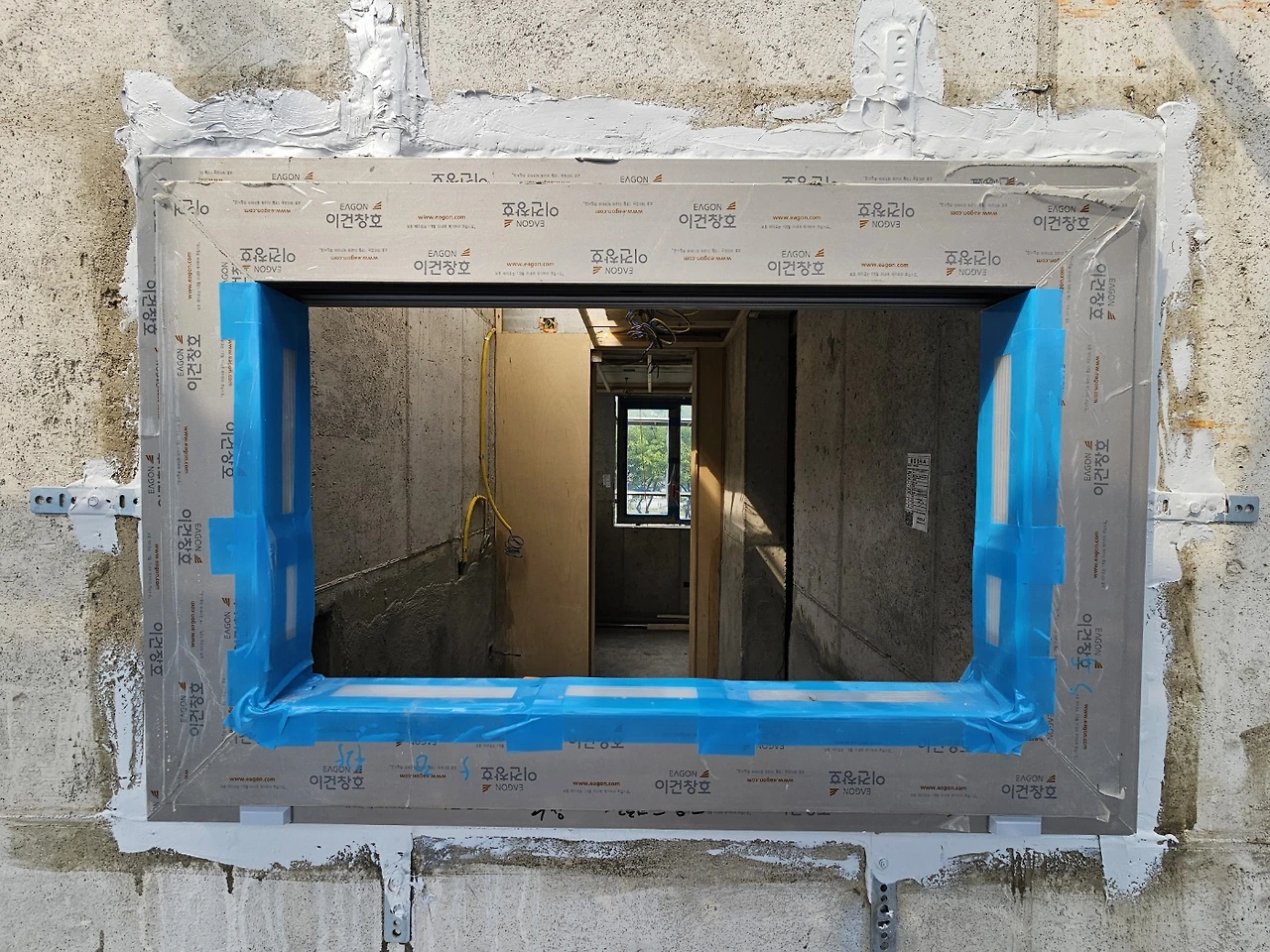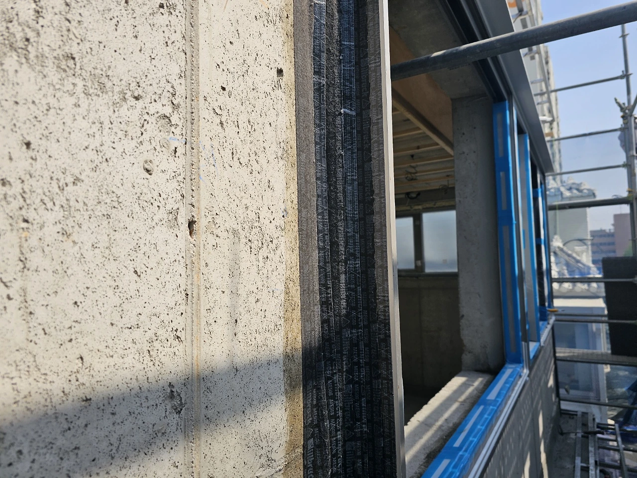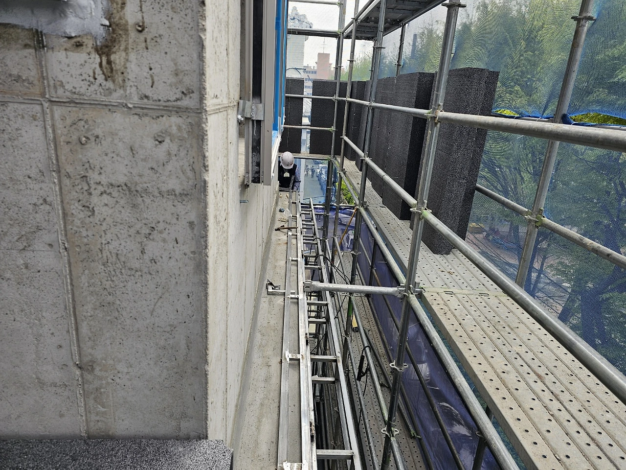 오늘도 누수 예방 전. 노출 창호 주변에 기밀 테이프를 시공해서 누수를 방지하고 준불연 단열재를 절단해 꼼꼼히 옷을 입히는 작업이 본격적으로 진행된다. 외단열재는 스티로폼을 가공한 제품이다 보니 절단 중 조각이 떨어져 나와 날리고 먼지도 발생한다. 큰 소음은 없지만, 날씨도 더워지고 민원 위험이 잠재된 작업.