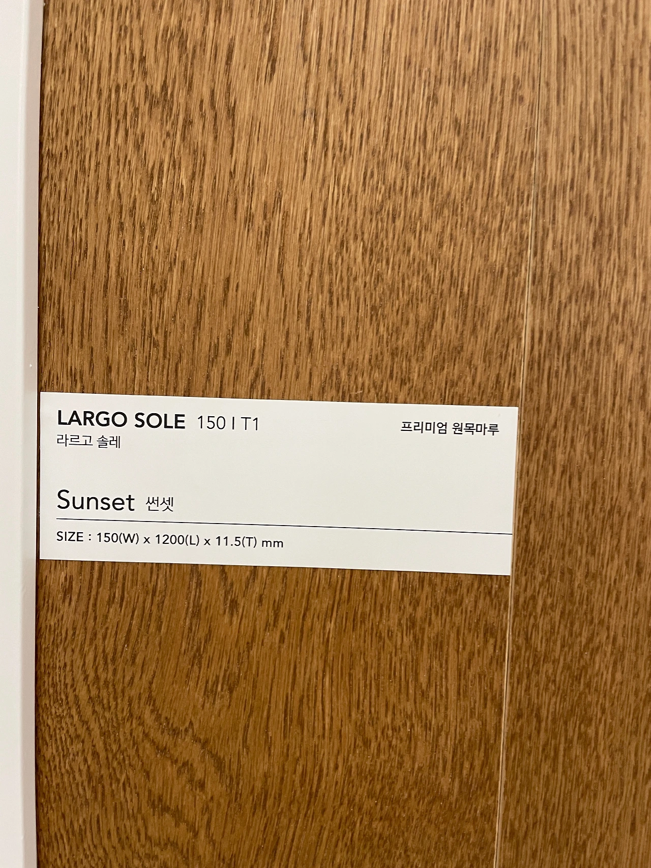 이건마루는 라르고솔레에 다양한 컬러와 사이즈 구성이 있고 150mm, 11.5T 제품의 나뭇결이나 마감이 좋아 썬라이즈, 선셋 제품으로 최종 후보를 골랐다. 시공까지 가능하고 접착본드를 지정제품으로 적용하고 품질관리까지 한다고 하니 시공결과도 좋을 것으로 예상되어 기대가 된다.