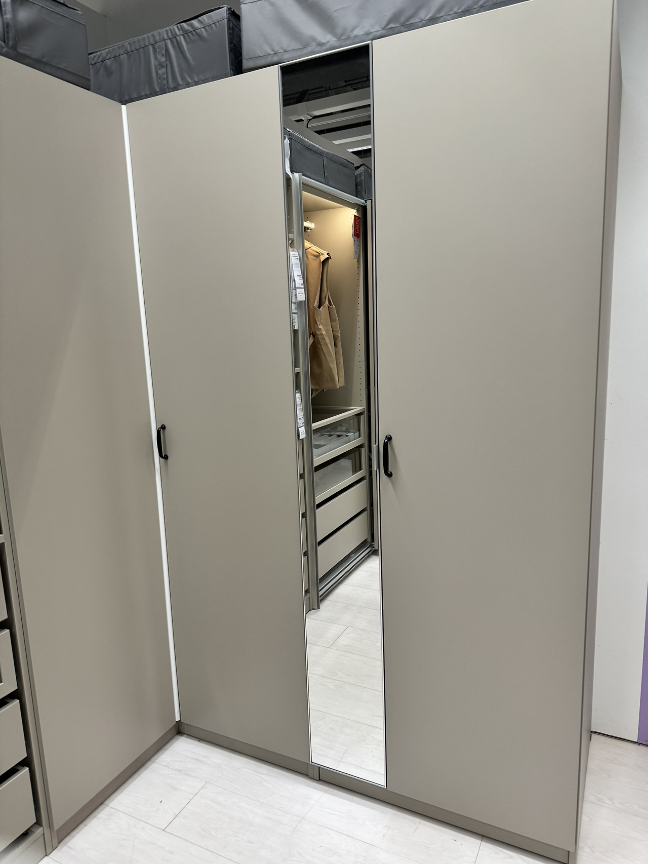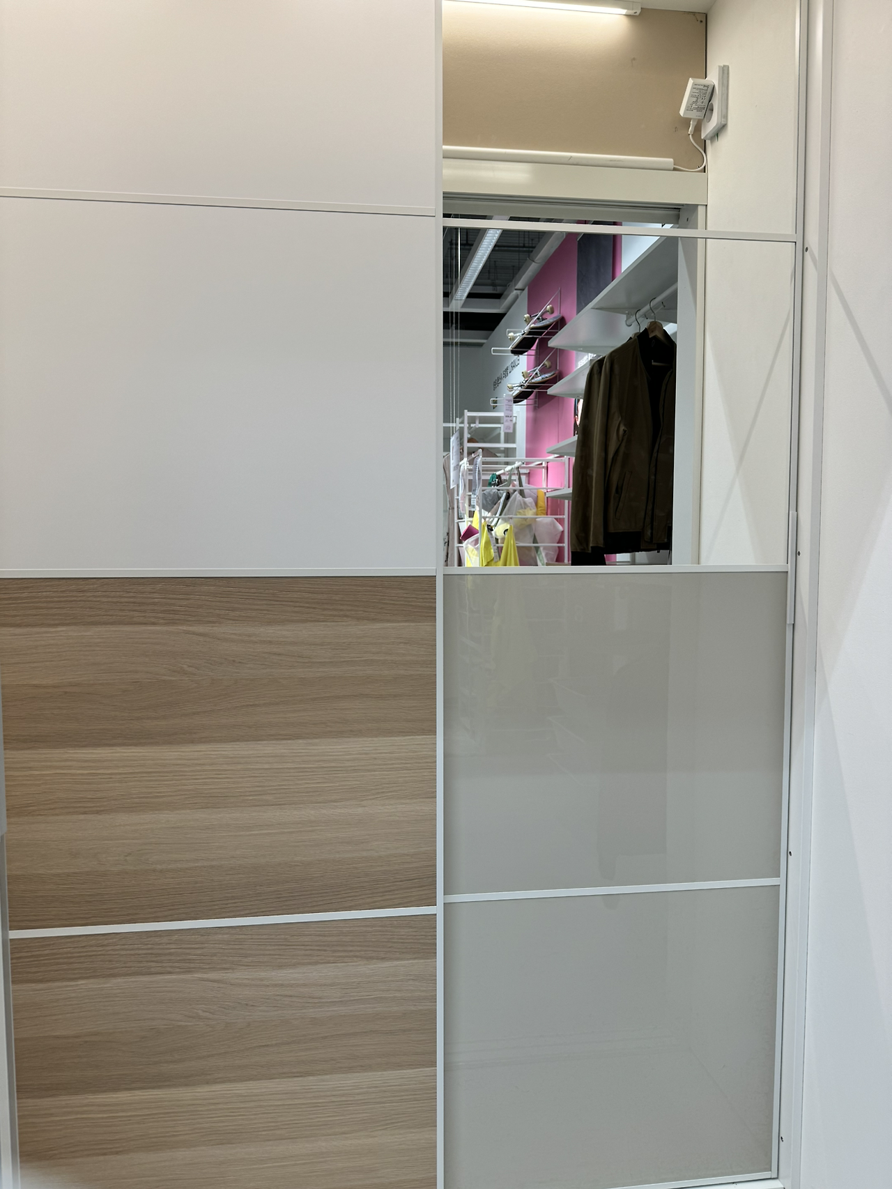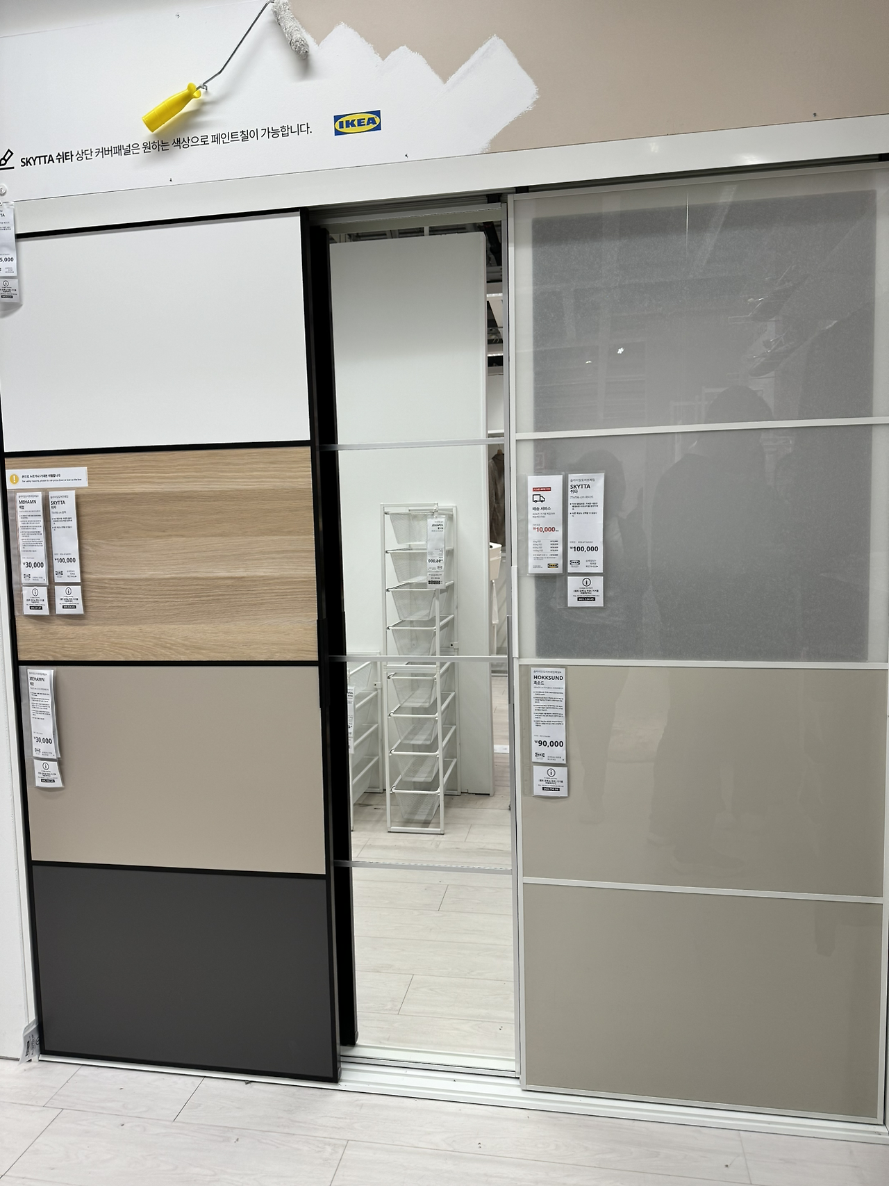 쉬타 도어는 나름 쓰임새가 다양하다. 붙박이장은 물론 공간 분리용으로도 활용이 가능하여 셀프플래너로 작업을 해보고 실제 설치 샘플을 확인해 보았다. 웹 상으로는 한지 느낌의 반투명 화이트 패널이 좋아 보였는데 실제로 보니 오히려 새로 나온 베이지 톤의 혹순드(HOKKSUND)가 세련되어 보였고, 화이트나 목재 무늬목도 쓸만했고 가격도 저렴하다. 거울 패널과 화이트 조합, 혹은 거울과 혹순드 조합 두 가지에서 고르기로 마음을 먹었다. 더 이상 고민 끝. 공간이 좁다 보니 미닫이를 선호하게 되고 거울을 패널을 쓸 경우 햇빛에 반사가 될 수 있어서 팍스에서 나오는 250mm 폭의 좁은 거울 제품을 포함해서 셀프플래닝 해본 후 최종 결론을 내야겠다.