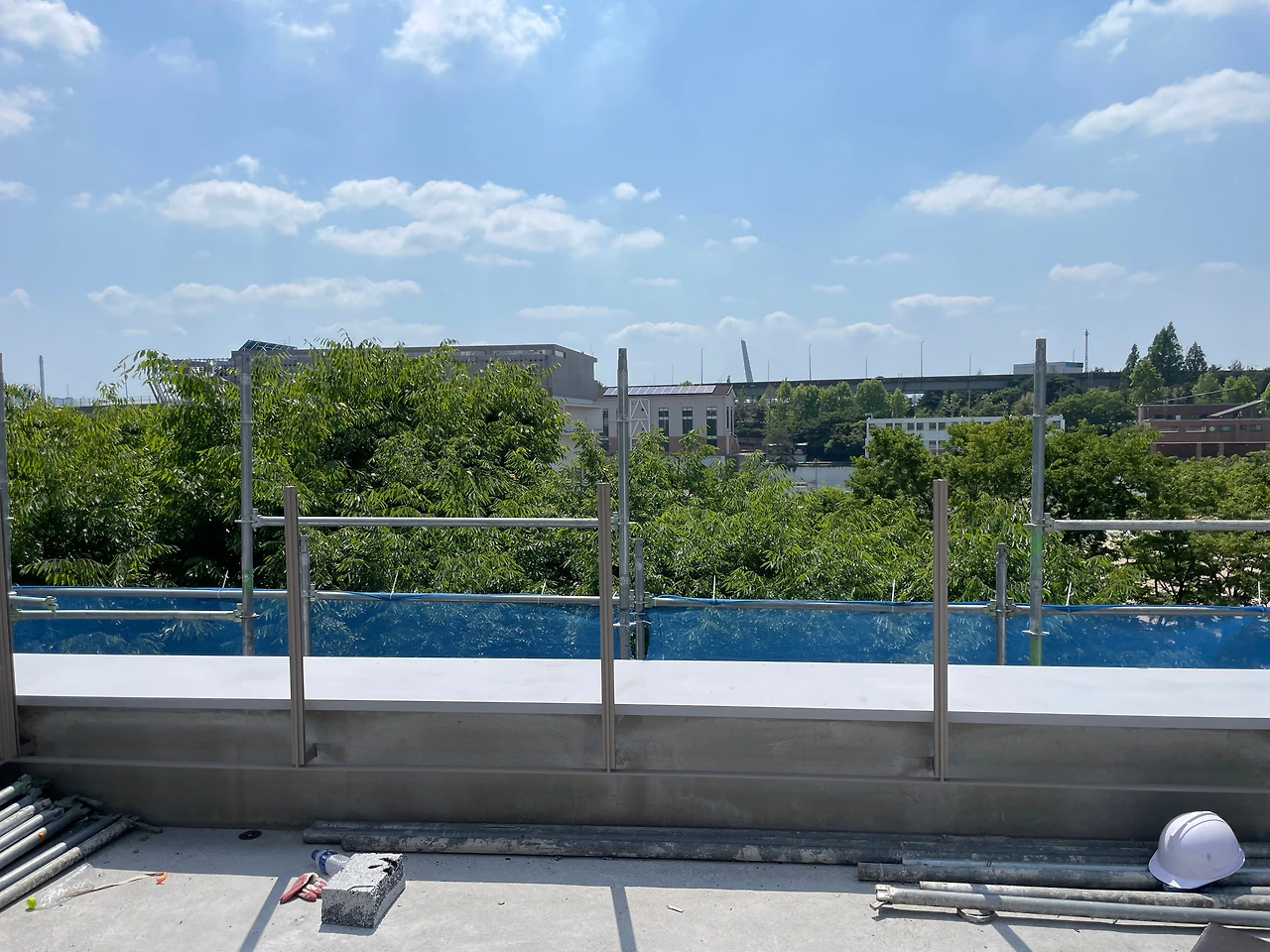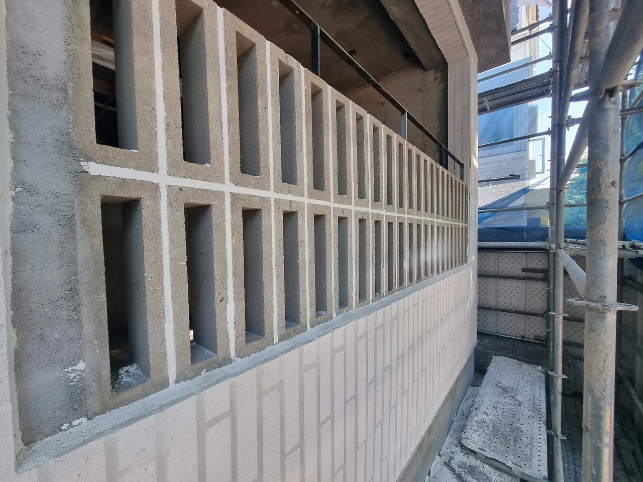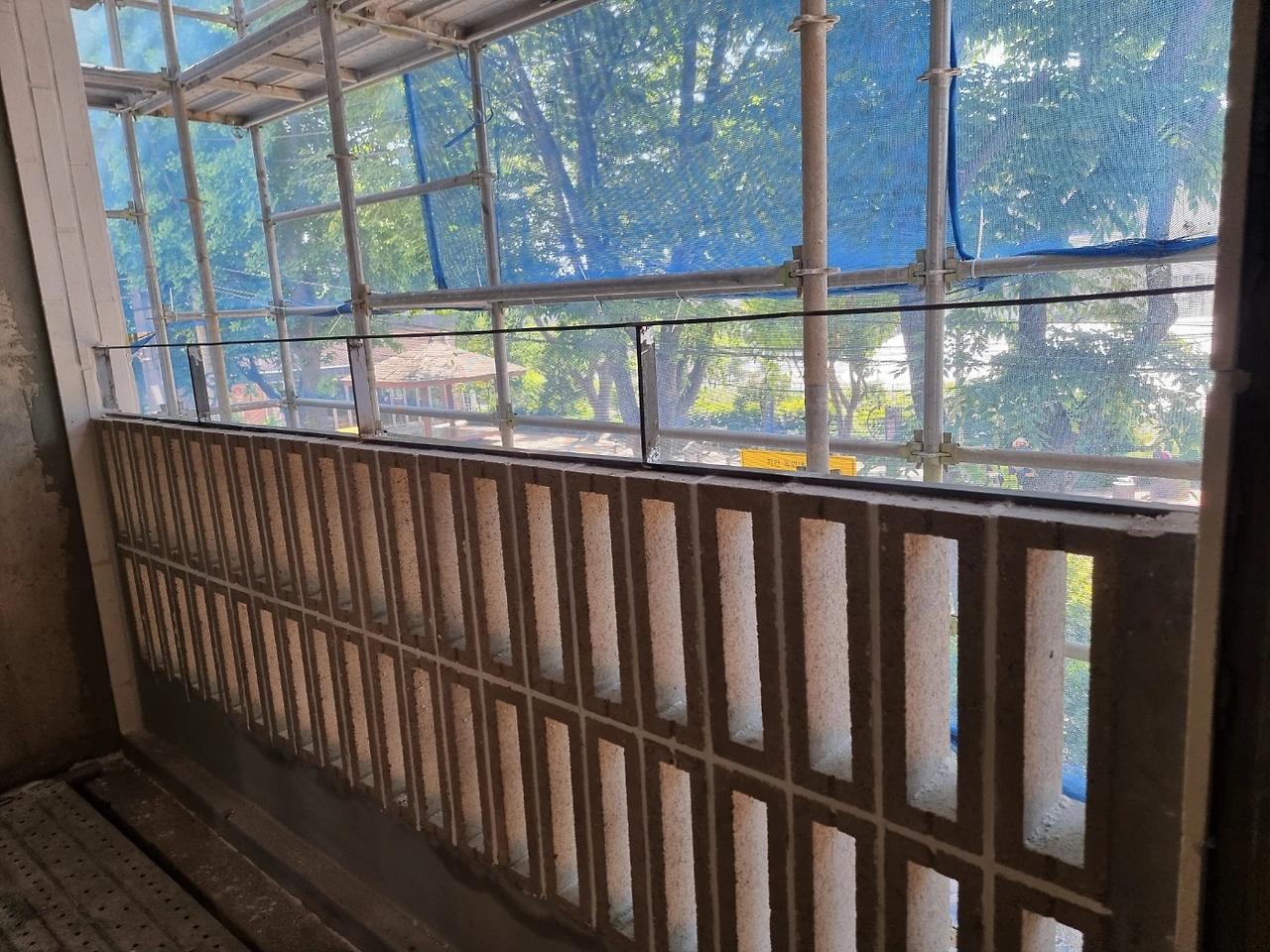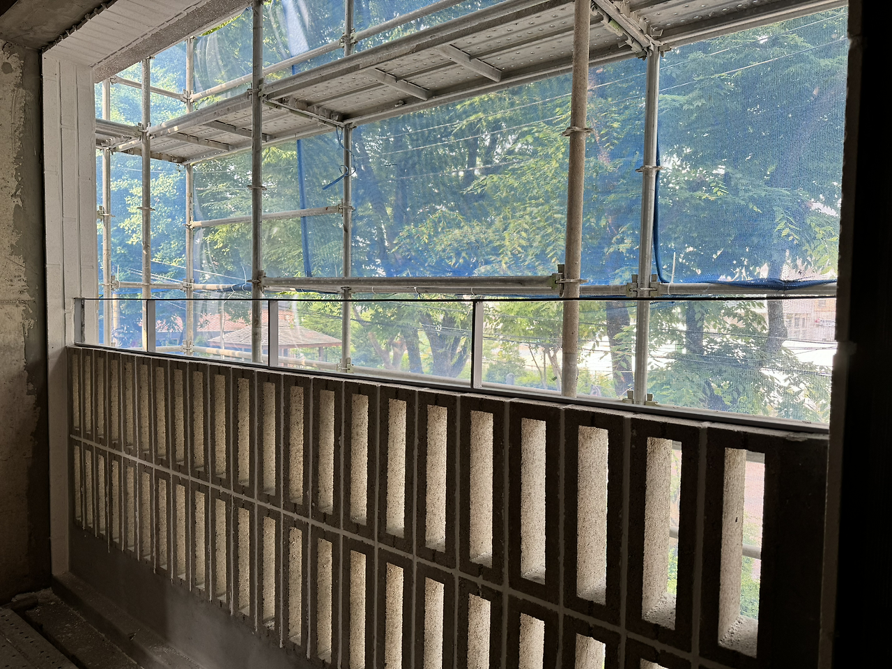 안전과 내구성을 위해 개수를 늘렸던 난간대 숫자와 배치를 심플하게 재조정하니 큐블럭 난간이 드러나고 좌우 대칭으로 깔끔하고 안정적인 인상이 더해졌다. 큐블럭 난간은 볼수록 매력이 있다. 단정하면서도 적당한 개방감 덕분에 난간으로 좋은 재료라는 생각이 들고 풍경과 빛이 섞이면서, 안에선 기분 좋은 생동감이 밖에선 외장재에 변화를 만들면서 시각적인 재미가 있다.