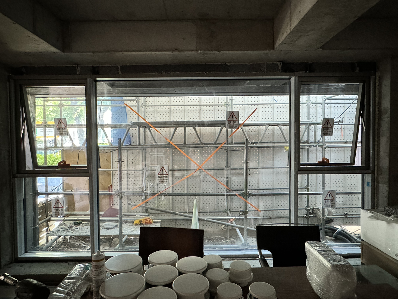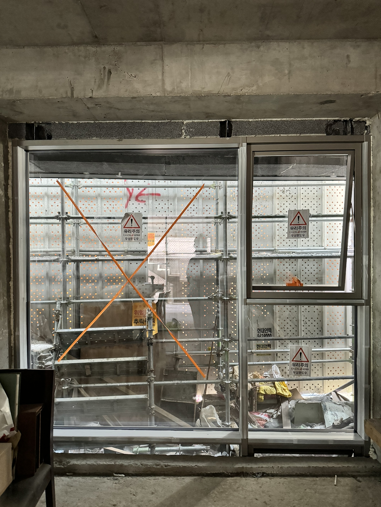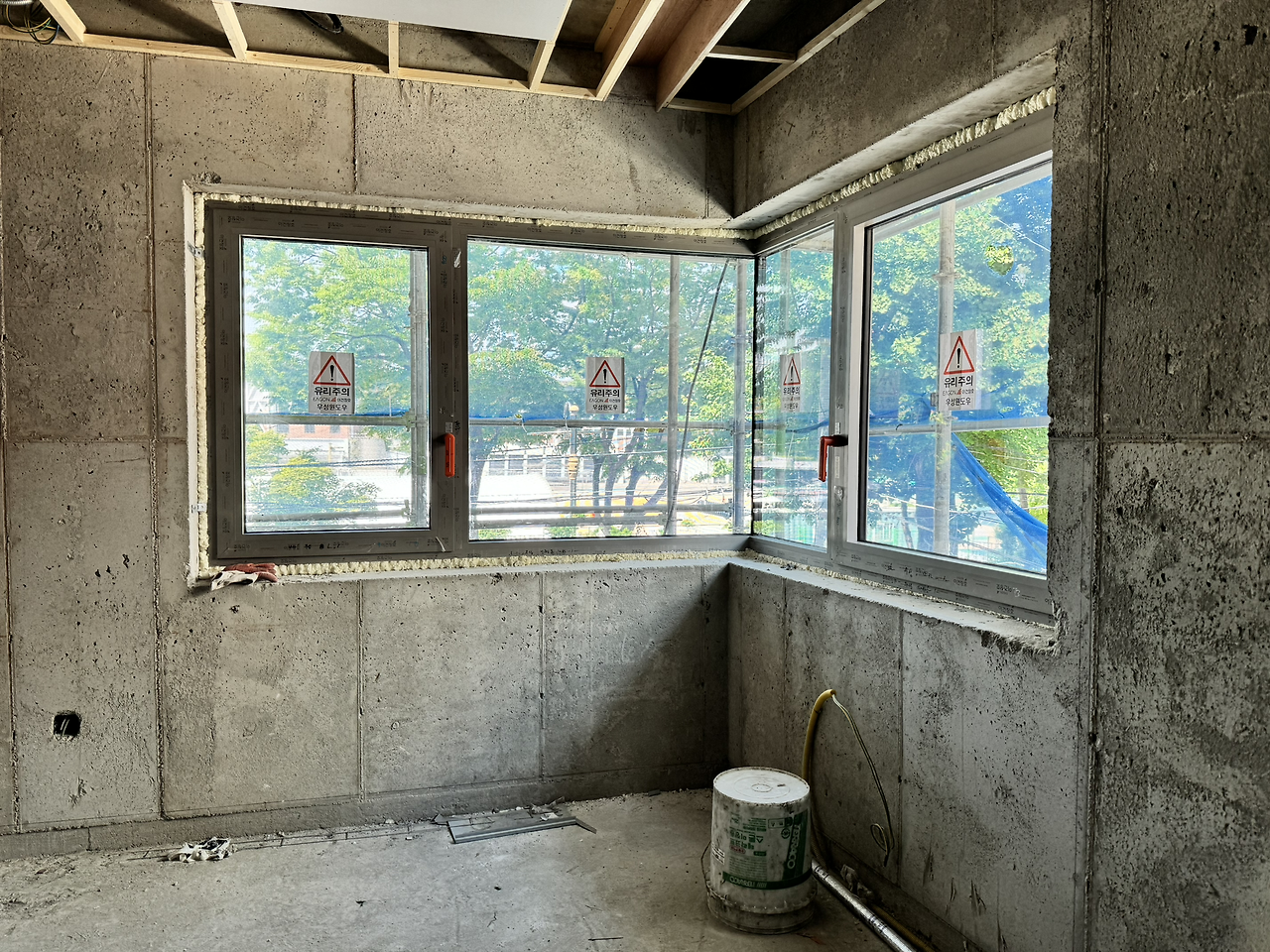 드디어, 창호 유리가 모두 끼워졌다. 아침에 일정이 있어서 직접 보진 못했지만, 3중 유리를 들어 올려 창호에 끼워 넣는 일이라 어려운 작업이었을 듯하다. 오후에 돌아오니 어느새 창은 다 끼워져 있고 창이 제대로 완성되니 단열과 소음차단이 잘되어 내부가 선선하고 주말 체육공원에서 뛰노는 사람들이 소리가 멀리서 나는 듯 조용해졌다. 큰 창문들이 있다 보니 외부 시선에 대한 걱정도 있었는데 약간의 반사가 생겨 야간에만 잘 차단하면 그 부분도 해소가 되었다.